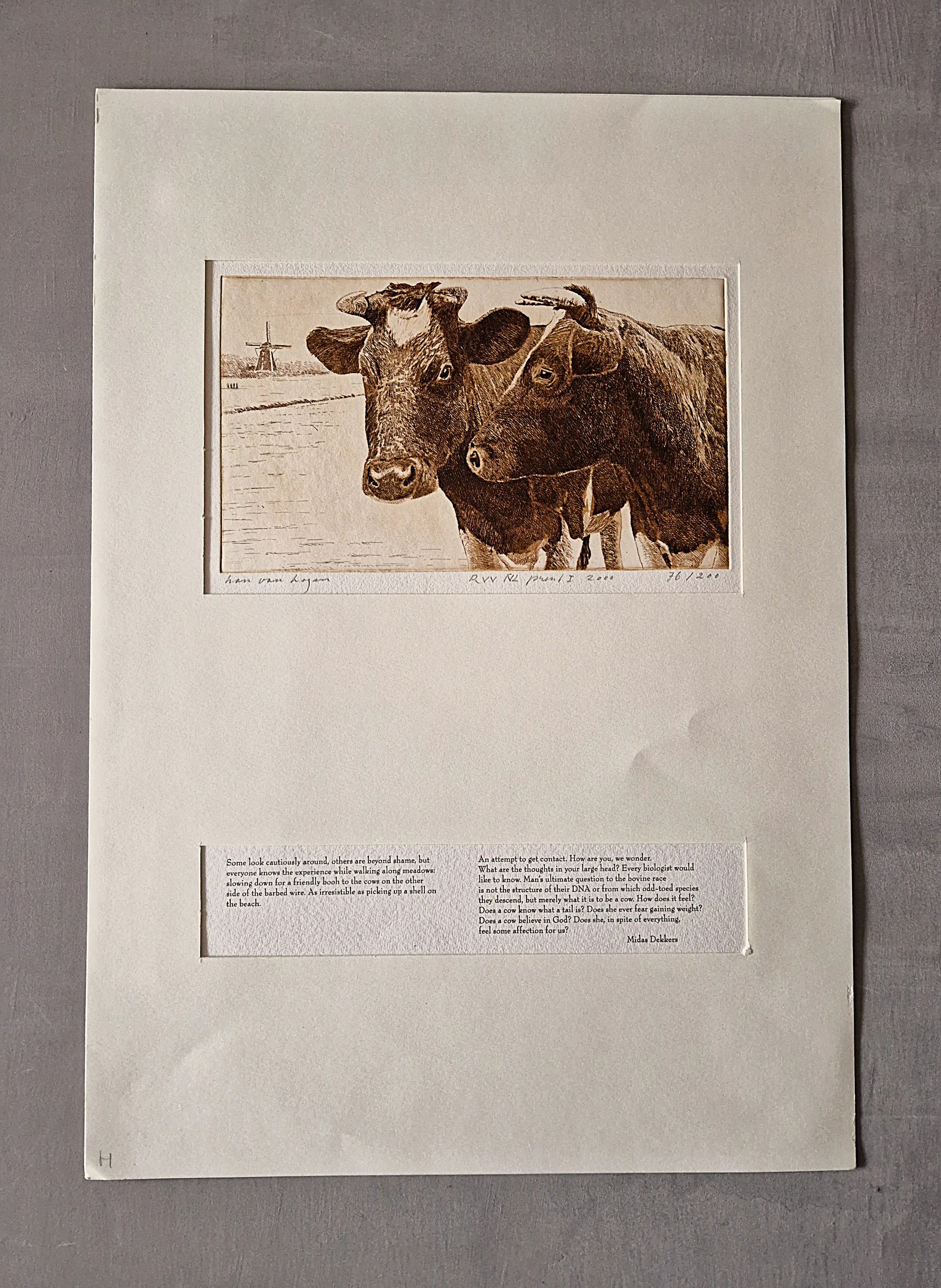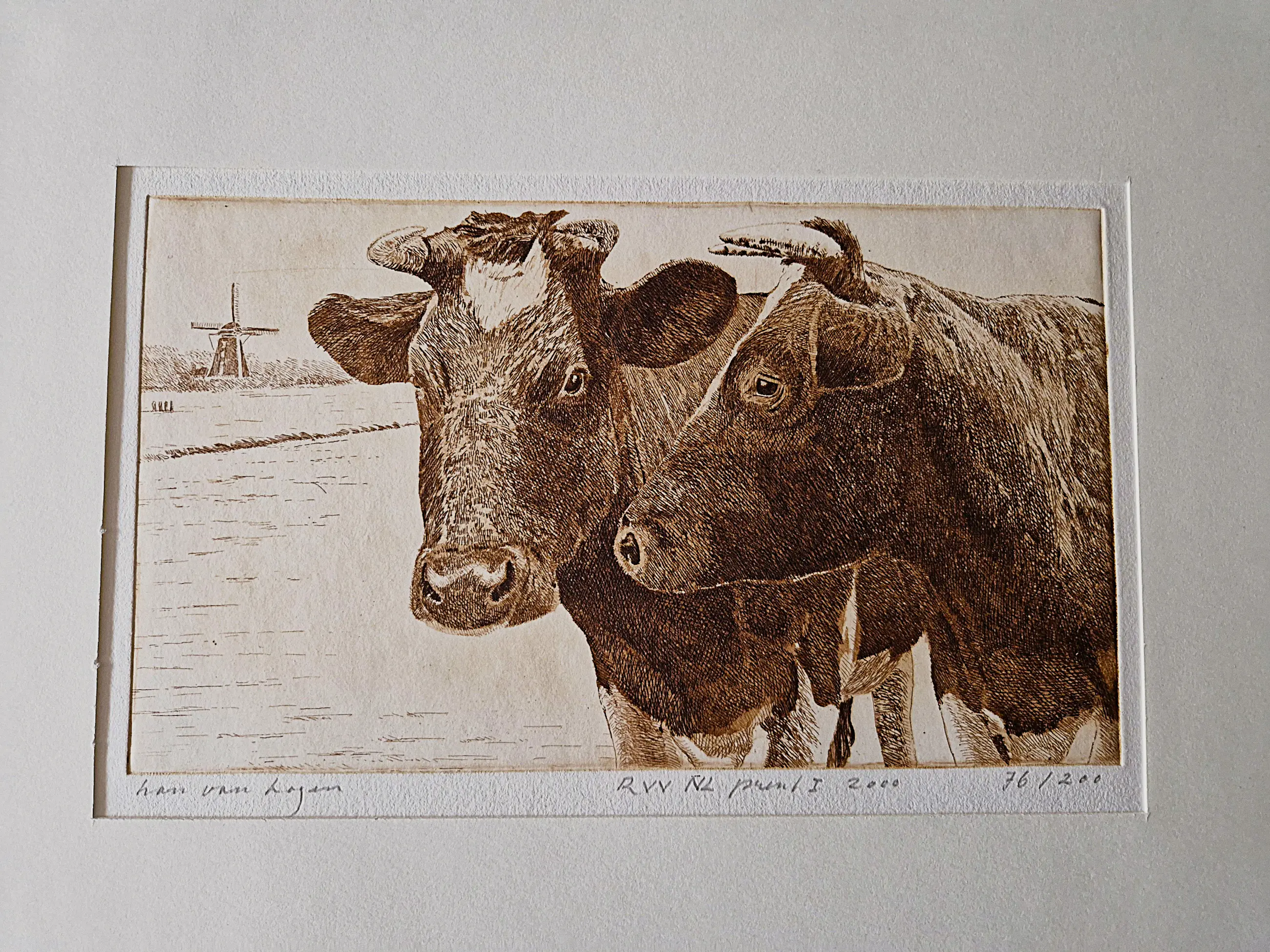 Han van Hagen - Erg mooi uitgewerkte Ets "2 koeien" oplage 200 - met tekst midas Dekkers
