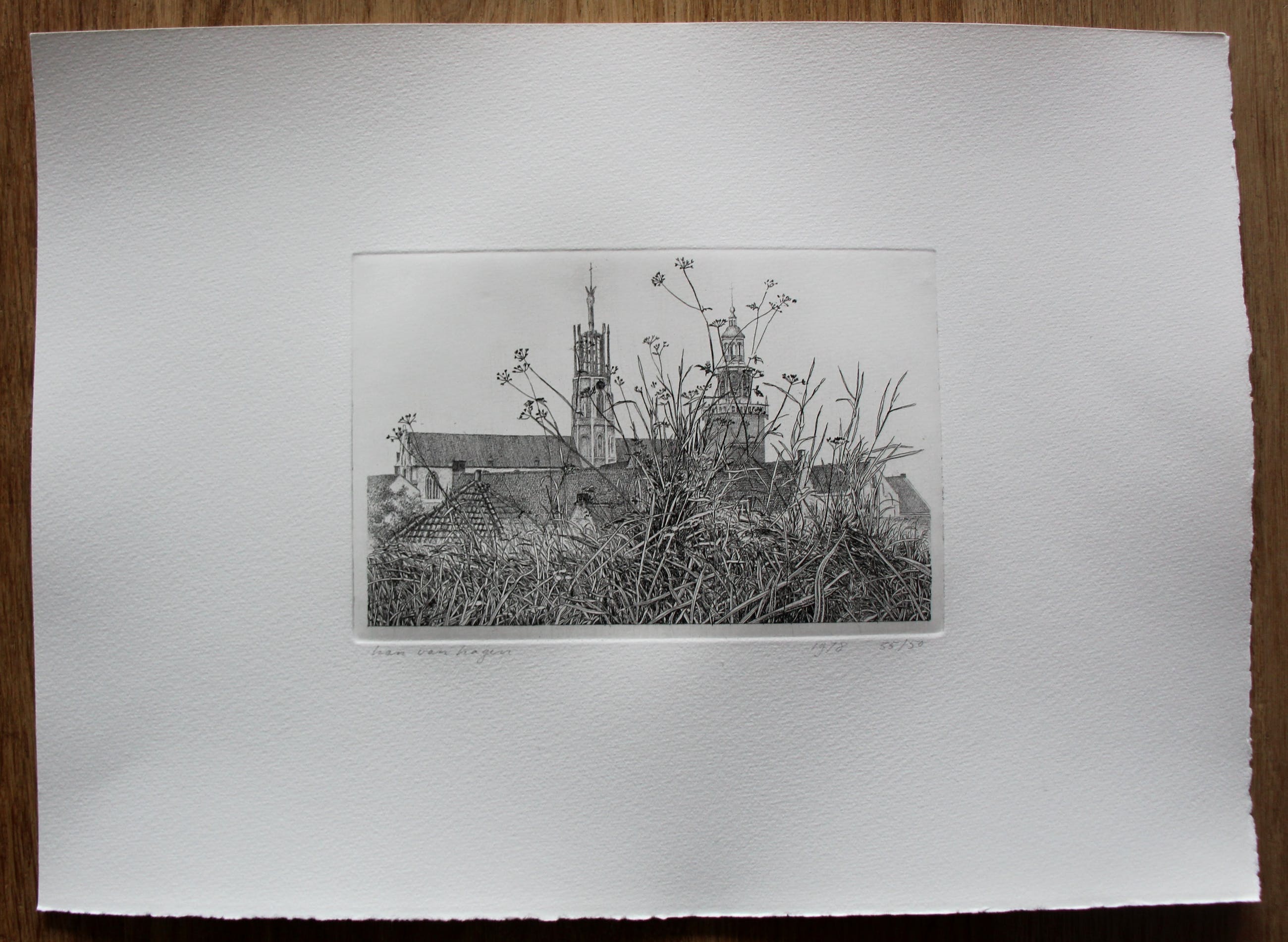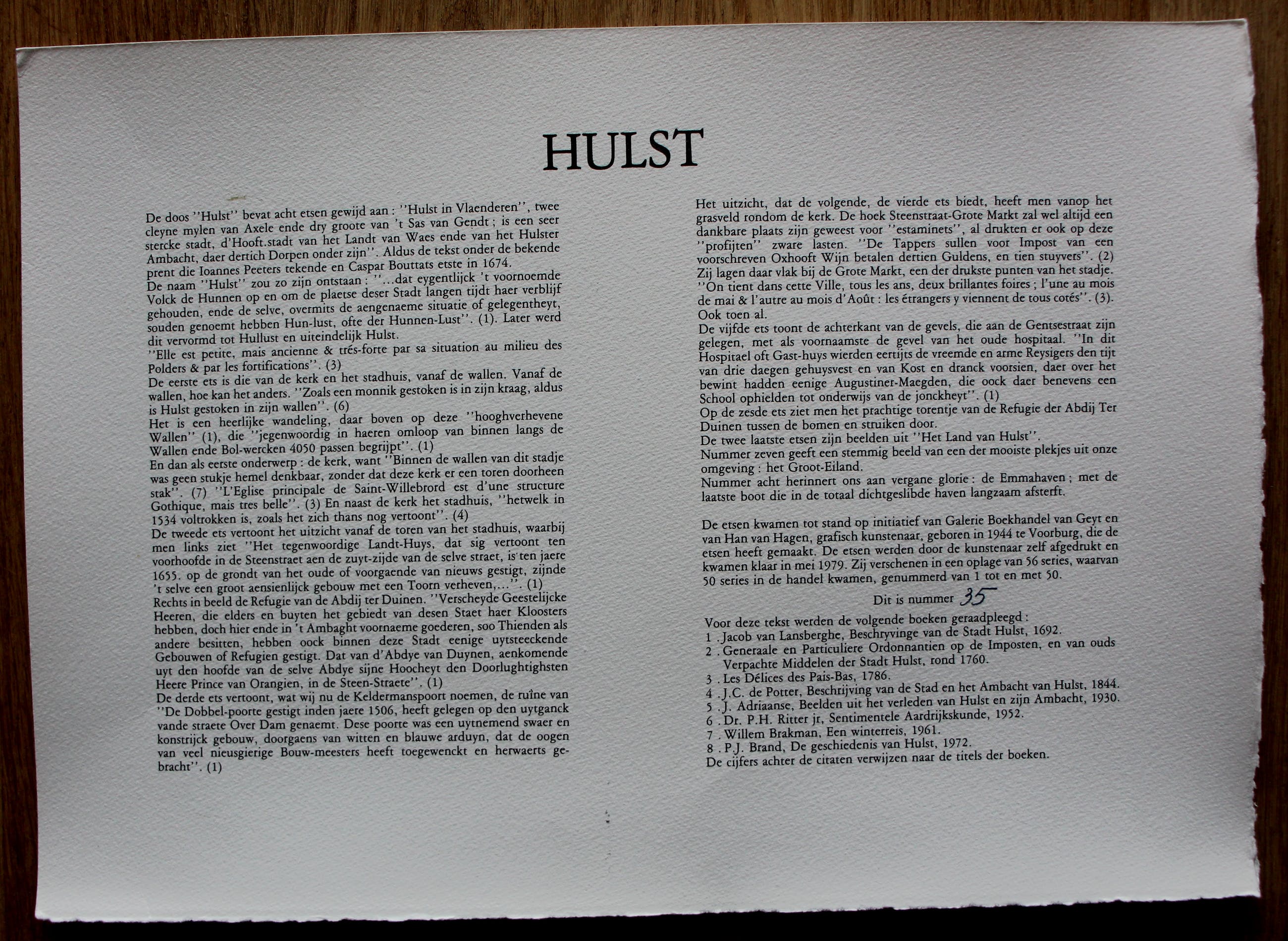 Ets van Han van Hagen. Deze ets komt uit een doos met 8 etsen, gewijd aan "Hulst in Vlaanderen". Jaar: 1978. Nummer: 35/50. Afmetingen blad: H28.5 x b39.5cm. Afmetingen voorstelling: H11.5 x b17.5cm. Het werk is links onder, met potlood, gesigneerd door de kunstenaar. De authenticiteit van het aangeboden werk wordt volledig gegarandeerd. Een certificaat van echtheid kan, op aanvraag worden gemaild.
