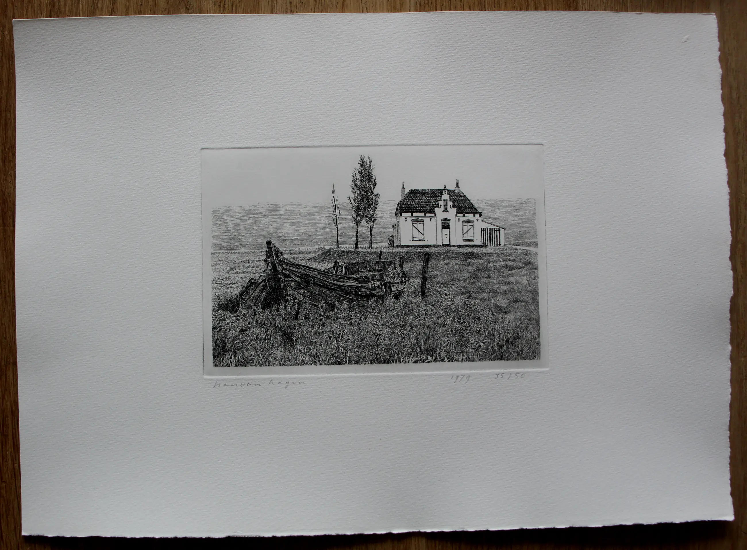 Ets van Han van Hagen. Deze ets komt uit een doos met 8 etsen, gewijd aan "Hulst in Vlaanderen". Jaar: 1979. Nummer: 35/50. Afmetingen blad: H28.5 x b39.5cm. Afmetingen voorstelling: H11.5 x b17.5cm. Het werk is links onder, met potlood, gesigneerd door de kunstenaar. De authenticiteit van het aangeboden werk wordt volledig gegarandeerd. Een certificaat van echtheid kan, op aanvraag worden gemaild.