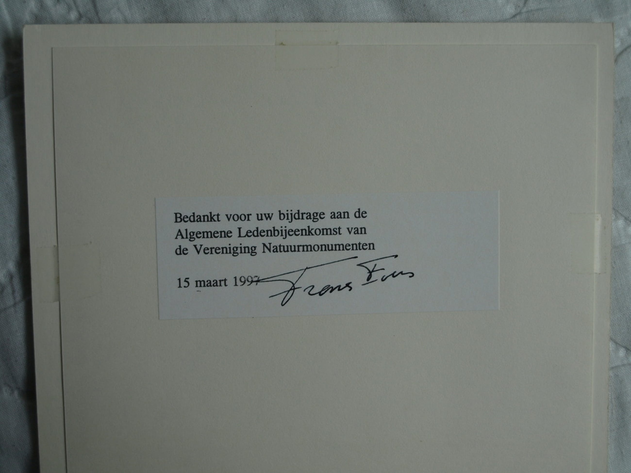 Deze ets werd op 15 maart 1997 cadeau gekregen tijdens de Algemene Ledenbijeenkomst van de Vereniging Natuurmonumenten (staat vermeld op de achterkant).