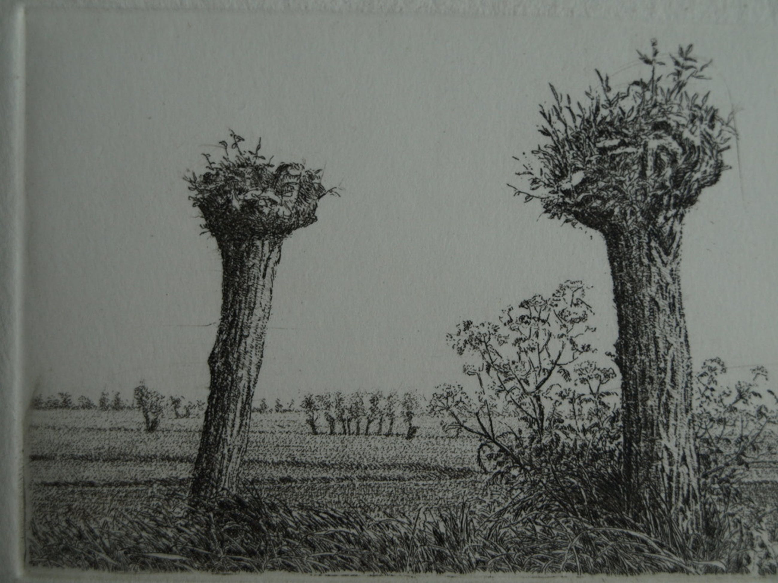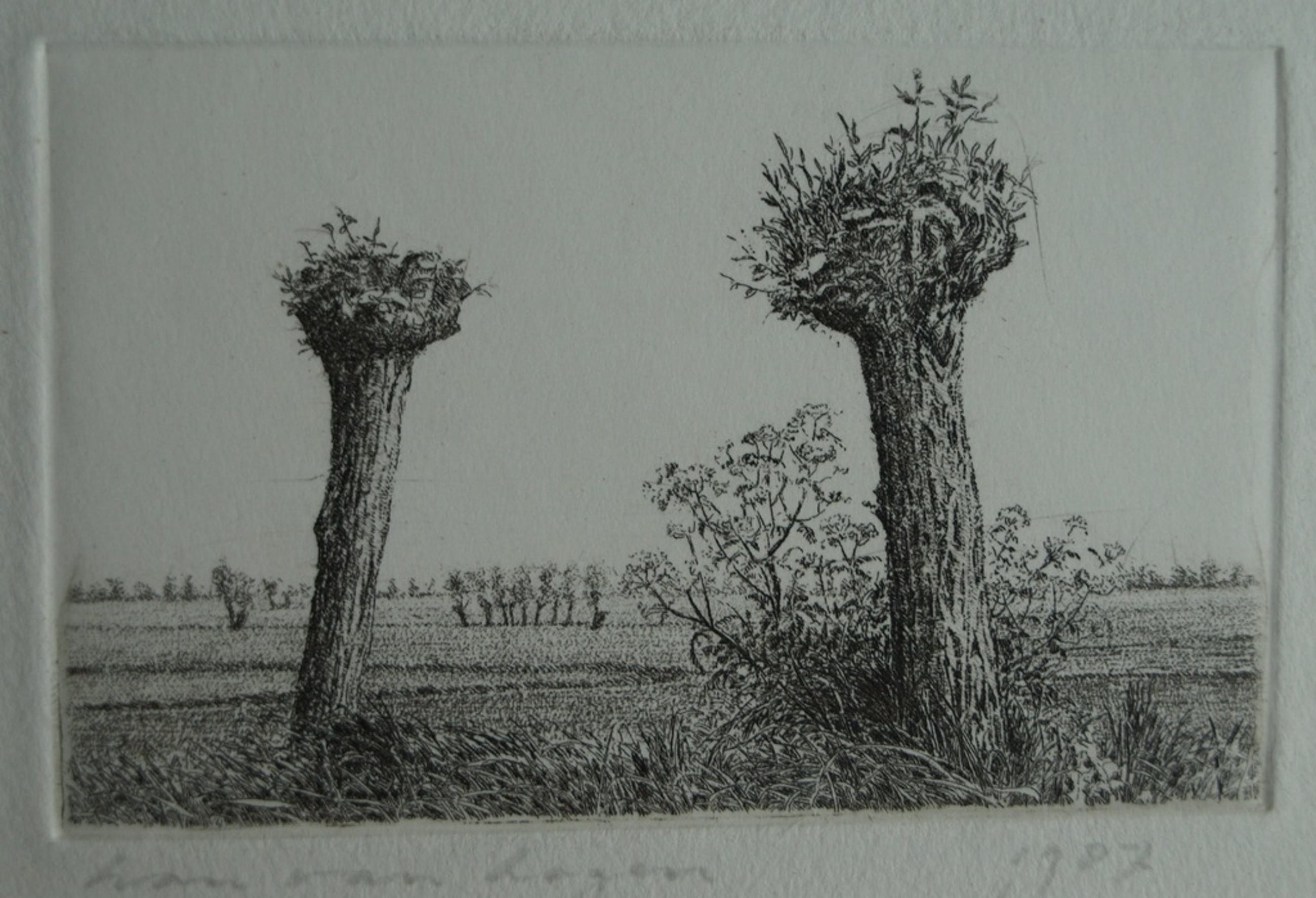 Een ets van de Nederlandse kunstenaar Han van Hagen met een voorstelling van 2 knotwilgen.