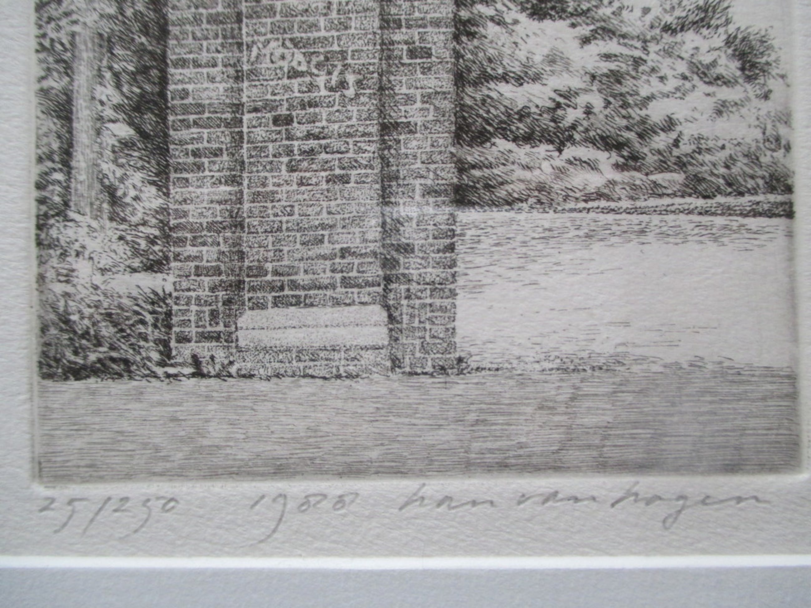 Fijne ets van Han van Hagen uit 1988, genummerd 25/250 en gesigneerd in potlood. Mooi professioneel ingelijst achter glas. Afm. lijst30,5x40.5 cm, beeld 9,8x14,5 cm.