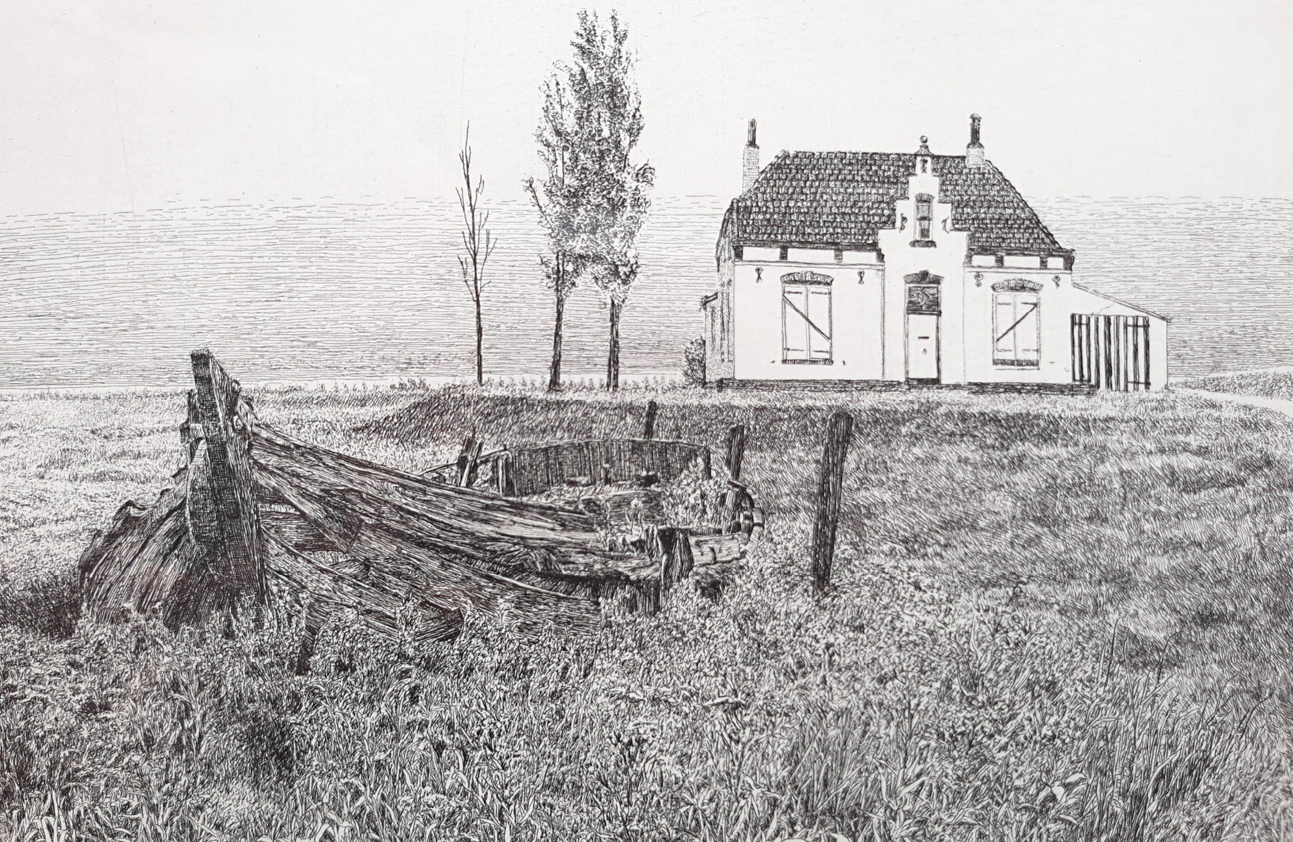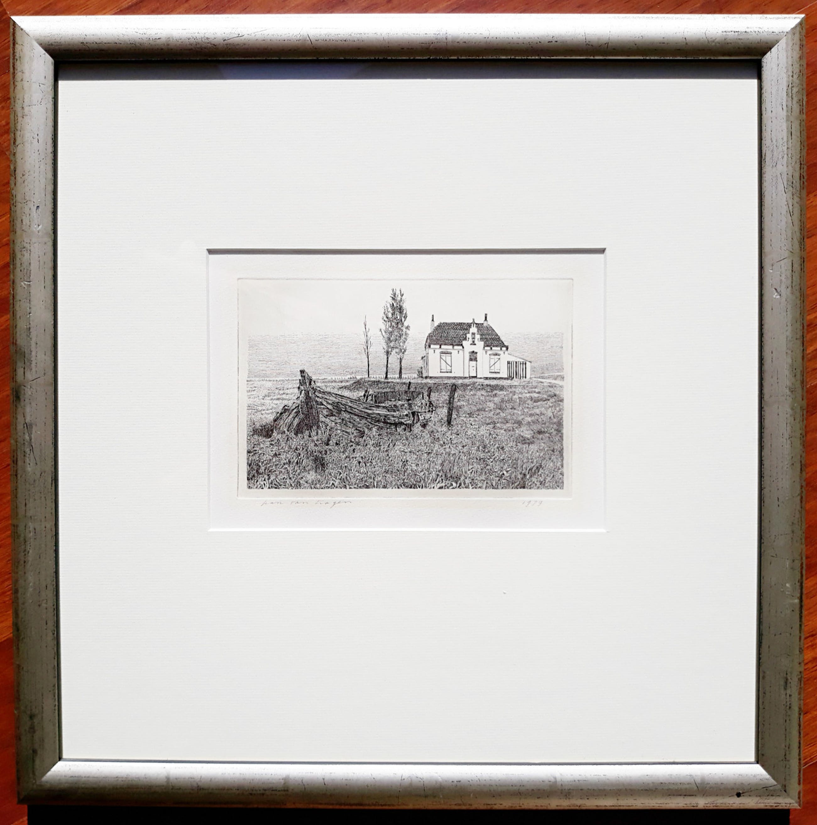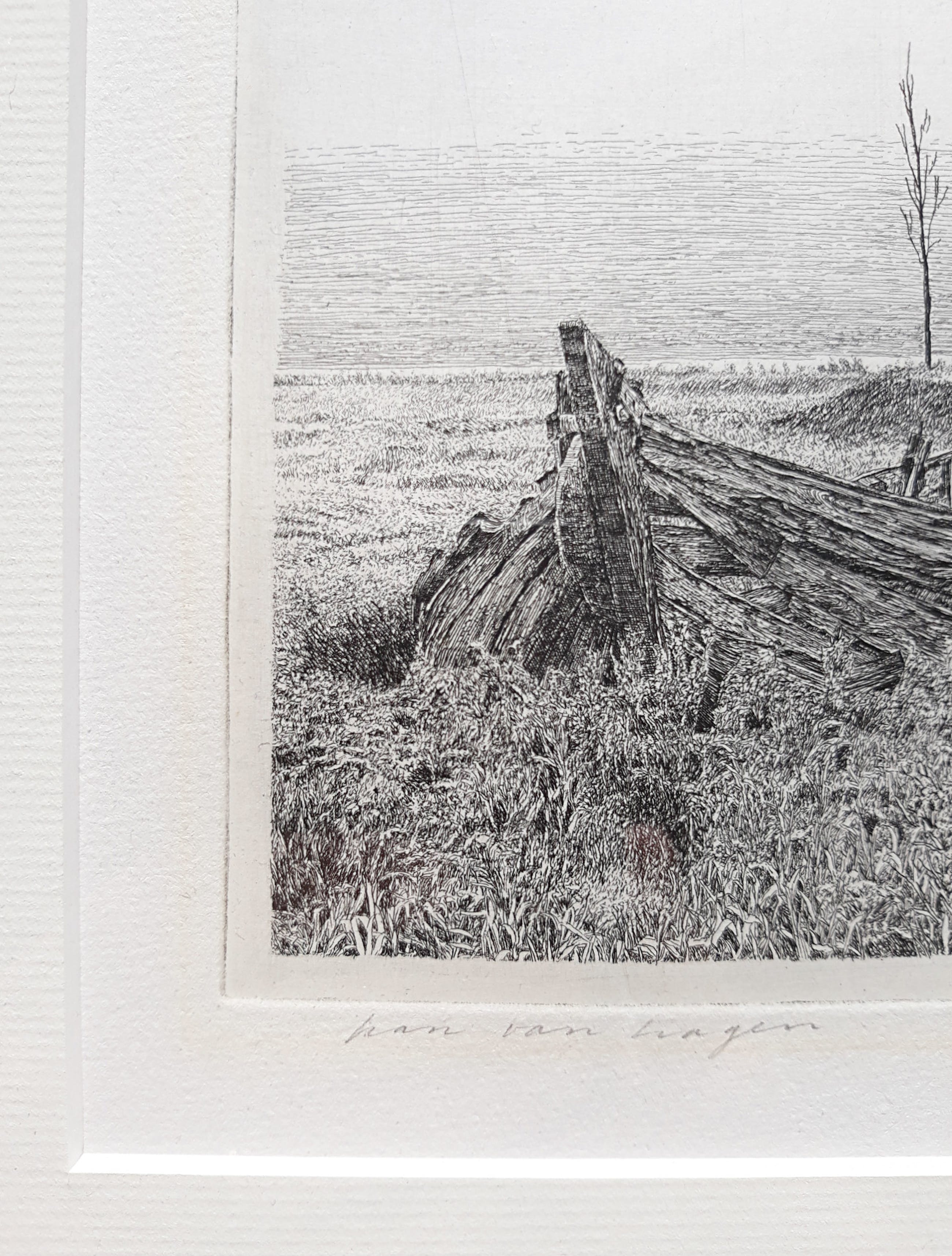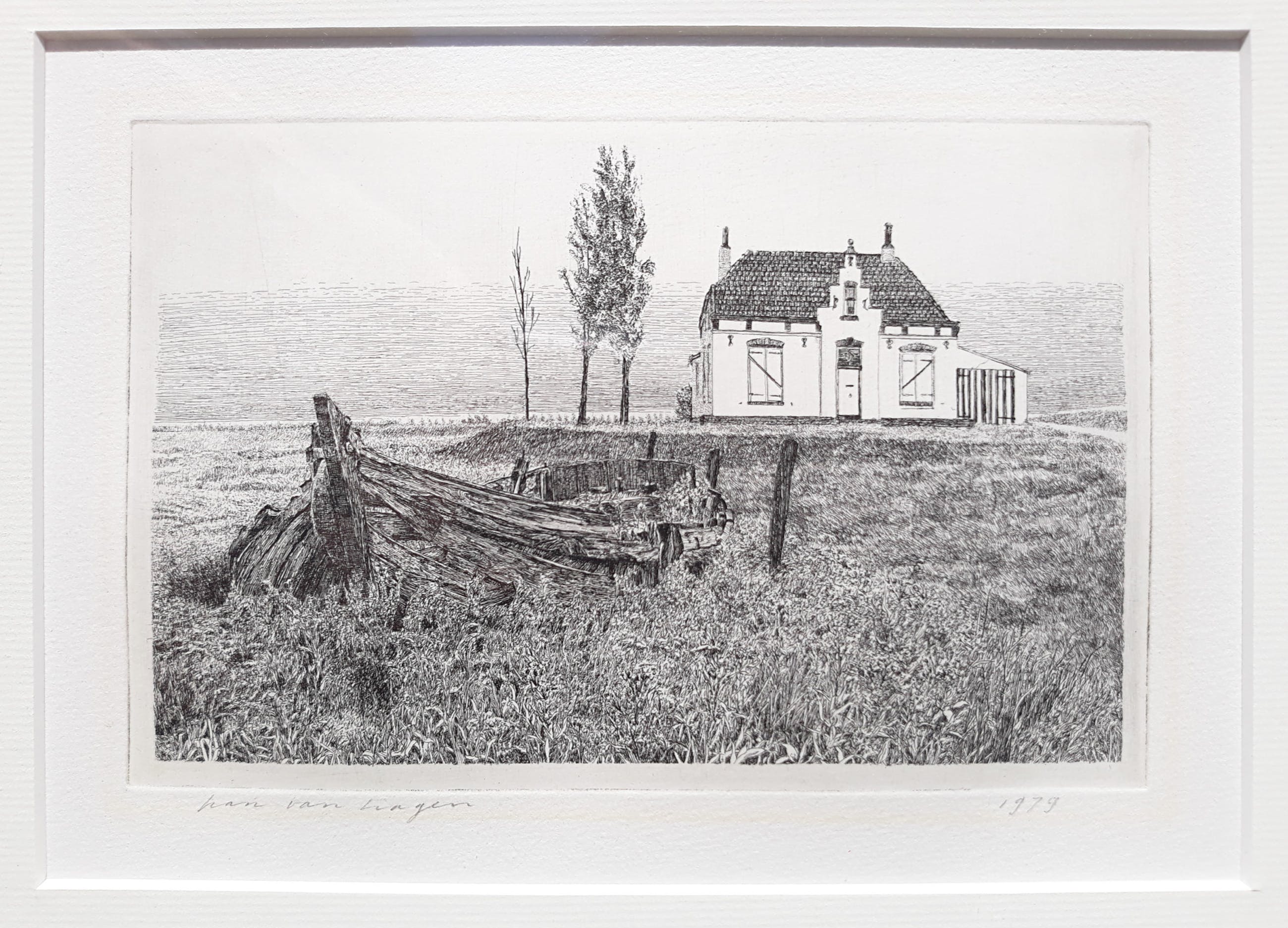 Prachtig werkje van Han van Hagen. Ets op papier, met potlood gesigneerd en gedateerd (1979). In prachtige houten lijst, achter glas en met smetteloos, zuurvrij passe-partout. Alleen de lijst is al meer waard dan de vraagprijs. Alles in zeer goede conditie, er is alleen een lichte verkleuring van een vorige inlijsting zichtbaar (zie foto’s).