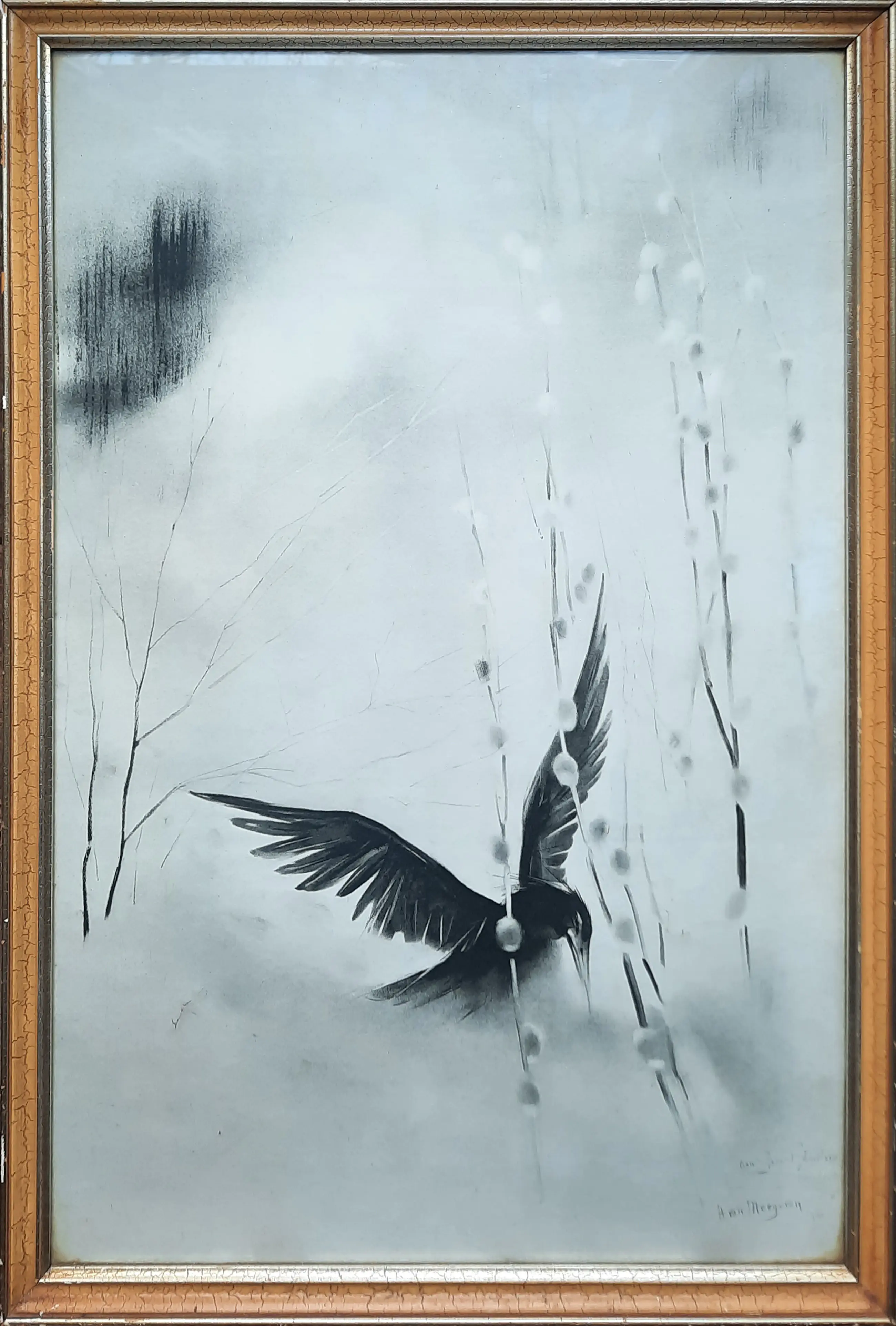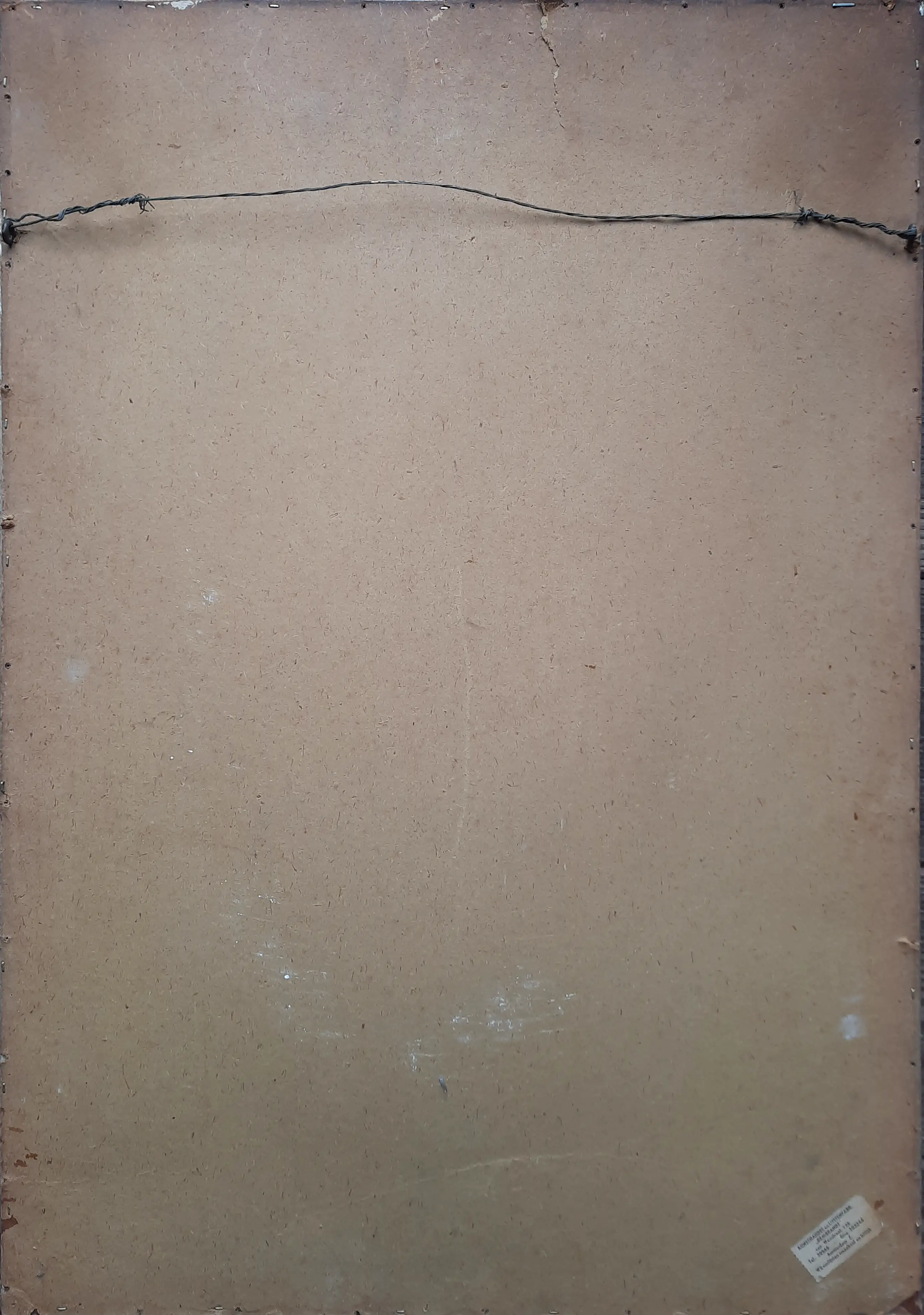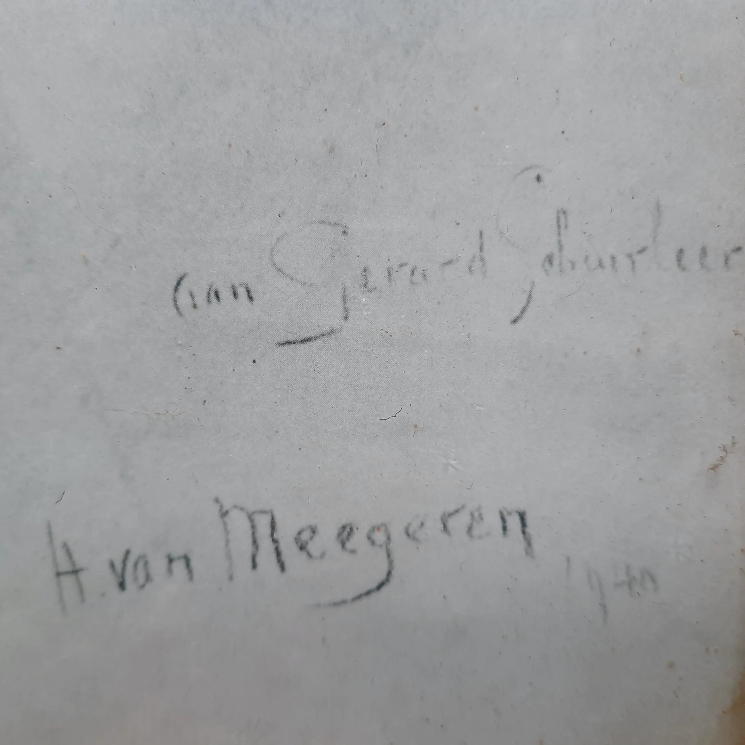 In lijst met gebruikssporen. Van de meestervervalser Han van Meegeren. Deze afbeelding staat ook in het boek Teekeningen 1 van Han van Meegeren, uitgegeven in 1942. Handtekening in de druk rechtsonder. Daarboven staat: Aan Gerard Scheurleer.