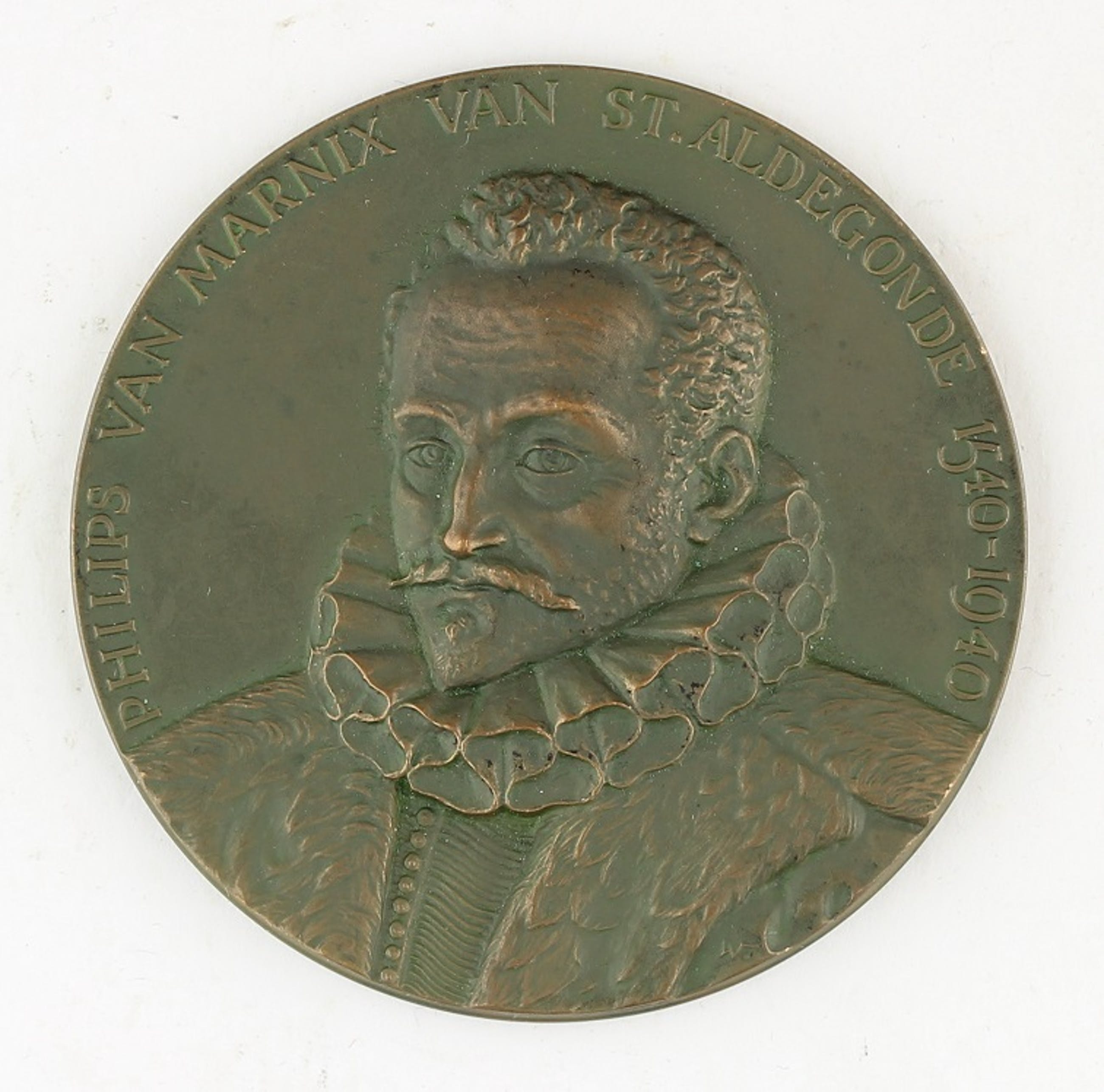 De voorzijde toont met veel detail de gedrongen beeltenis van de regent en dichter Philips van Marnix van St. Aldegonde (1539-1598) in trois-quart met krullekop en pelsmantel naar het portret uit Museum Fodor in Amsterdam. Zoals men vaak op laat 16-de eeuwse portretten ziet, is door de zware kraag de verhouding van kop tot schouders verdoezeld. De keerzijde is geboetseerd naar een portret uit 1598 van Jacob de Gheyn van het door Marnix zelf getekende blad voorkomend in het Album Amicorum van Jan van der Does bewaard in het Rijksmuseum. De tekening vertoont een schip in de branding, door de winden bestookt. Aan de horizon begrenzen rotsen de zee, terzijde van het schip zwemt een dolfijn. Het geheel wordt beschenen door zonnestralen en sterren, waartussen een Christusmonogram en daarboven de naam van God, respectievelijk in het Grieks en Hebreeuws verschijnen. De penning draagt op een banderolle de lijfspreuk van Marnix van St. Aldegonde: 'Repos ailleurs'. Rust is elders, te weten: in het hiernamaals. De penning werd uitgegeven in samenwerking met het Nationaal Comit ter herdenking van de geboortedag van Marnix van St. Aldegonde. Wezelaar die grotendeels in Parijs gevormd is, behoort met Andriessen en Van Pallandt tot de grootste beeldhouwers van zijn generatie. Het is jammer dat zijn bijzondere kwaliteiten in deze vrij conventionele penning niet uitkomen. Het genre lag hem niet, hij maakte er slechts enkele, na de oorlog daarin vooral aangespoord door Essen. #Louk Tilanus, Handzame Sculptuur