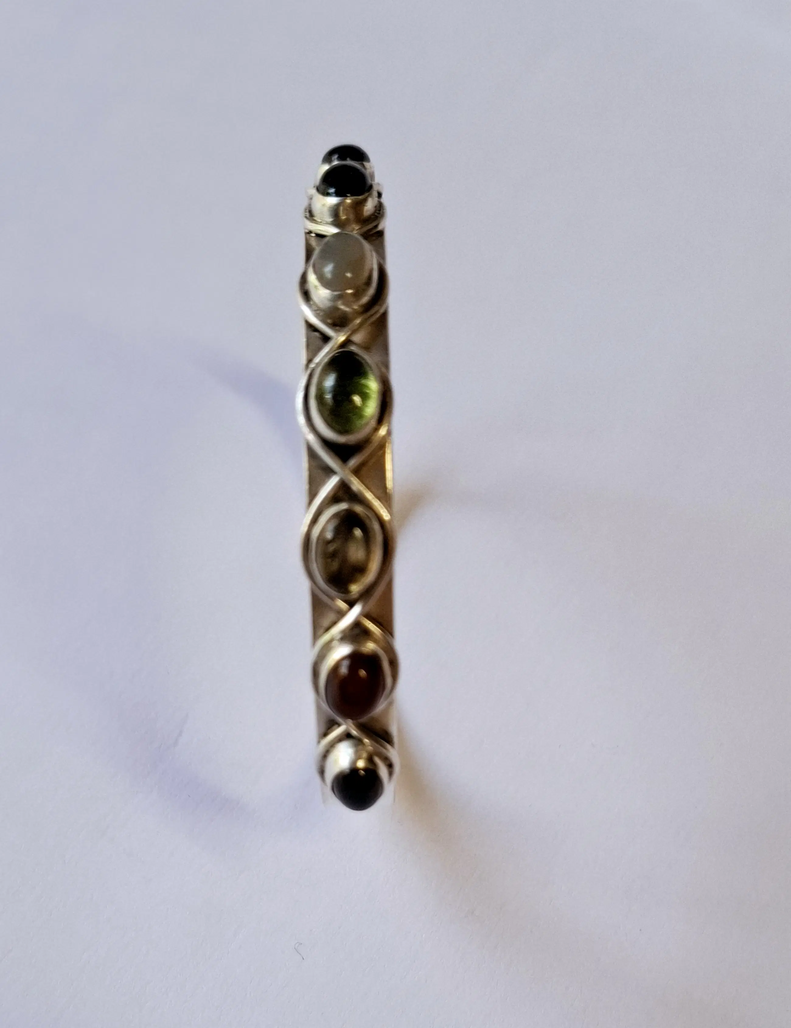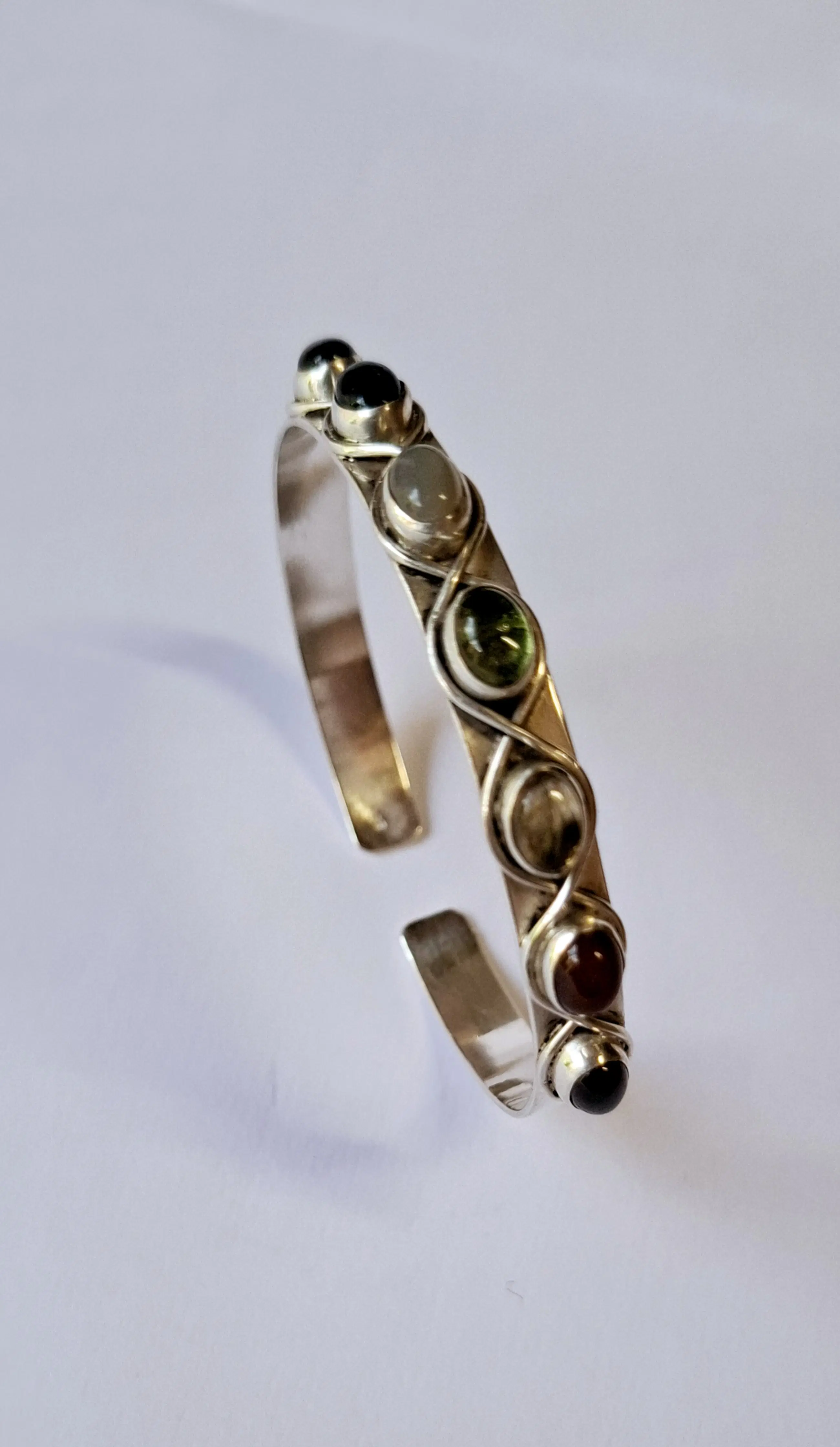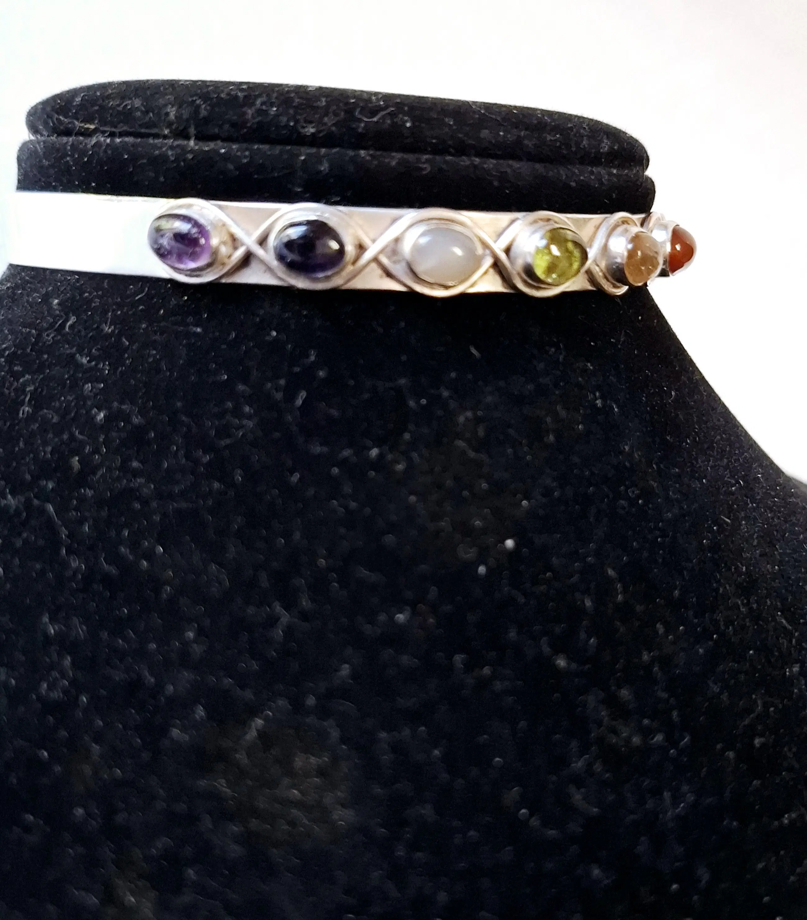 Deze handgemaakte echt zilveren open armband met verschillende Edelstenen zoals Amethist, maansteen, onyx, rode Robijn enz.. is echt zo’n sieraad waar je steeds naar blijft kijken. Het fijne patroon geeft ‘m nét dat beetje extra, zonder dat het te veel wordt.