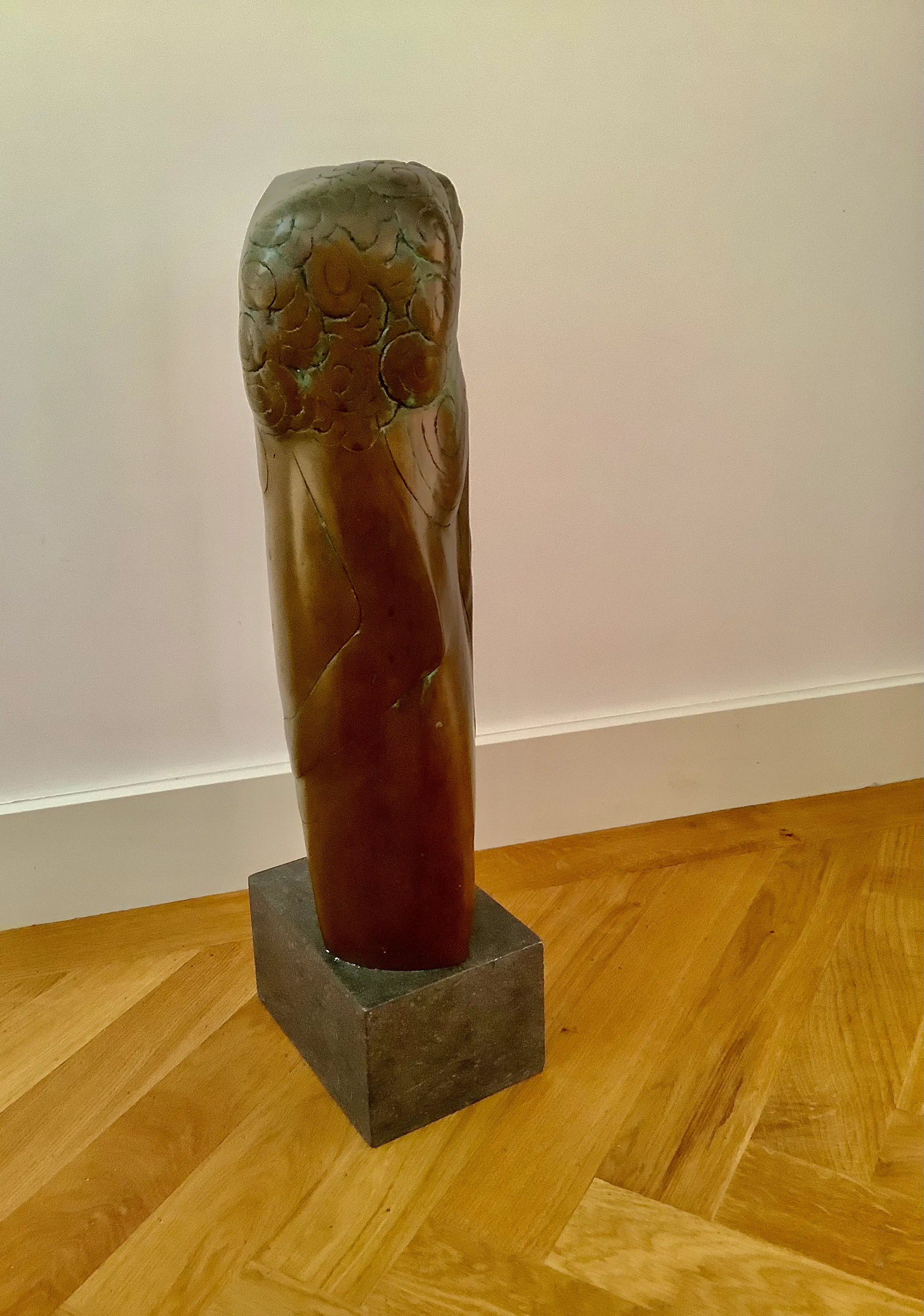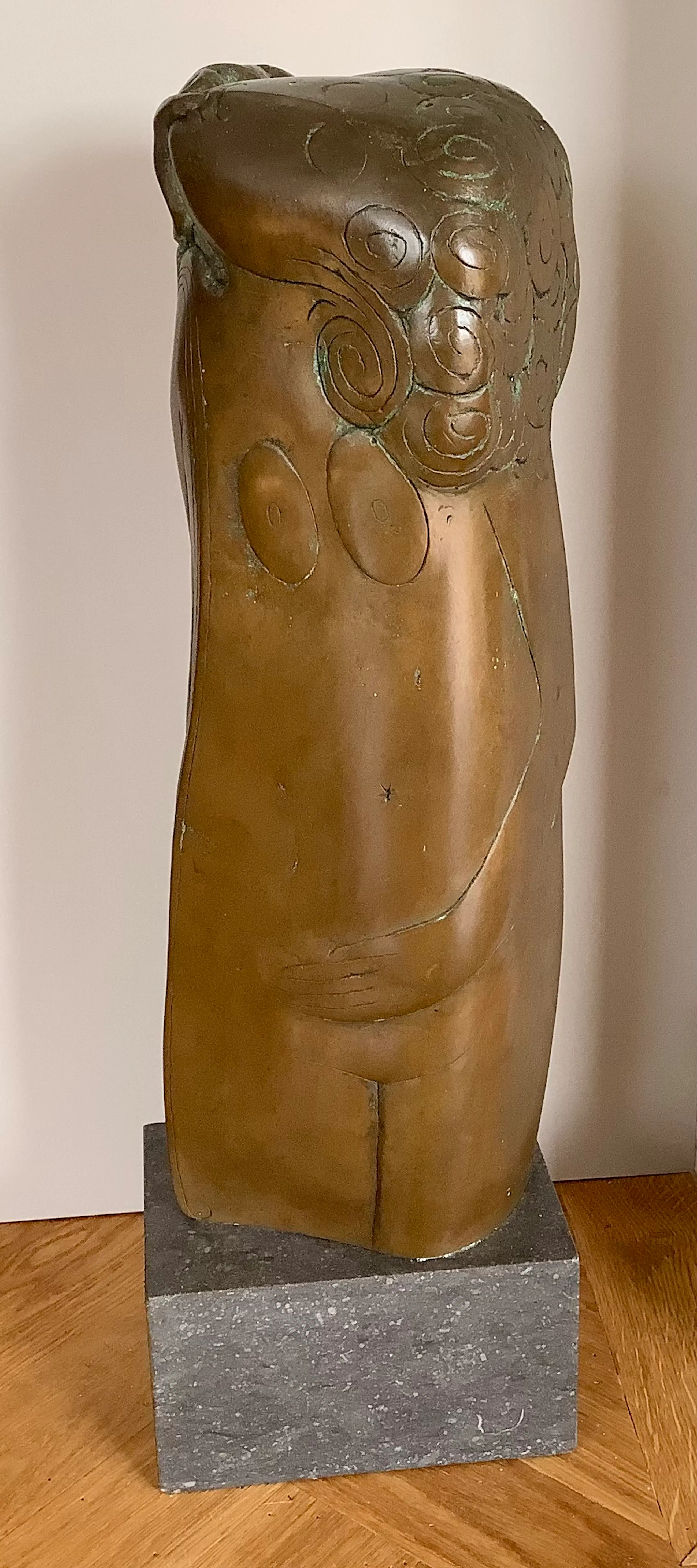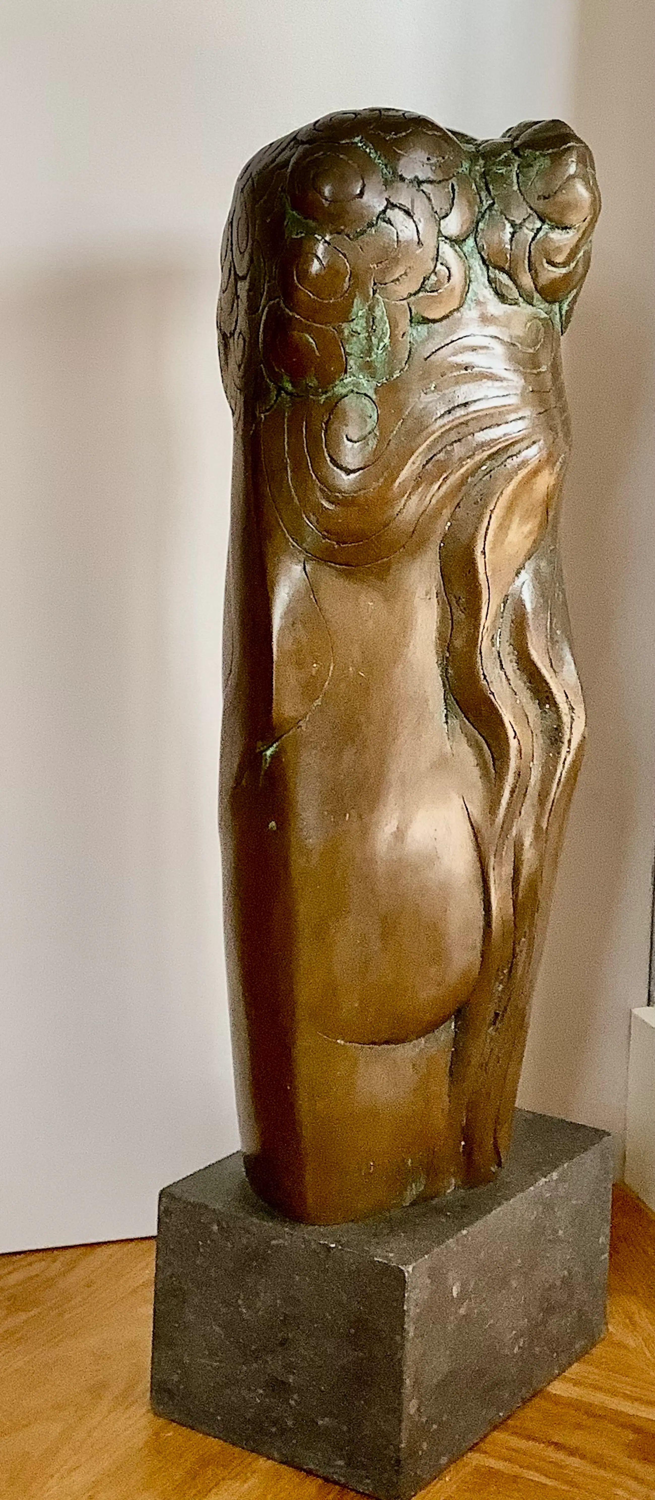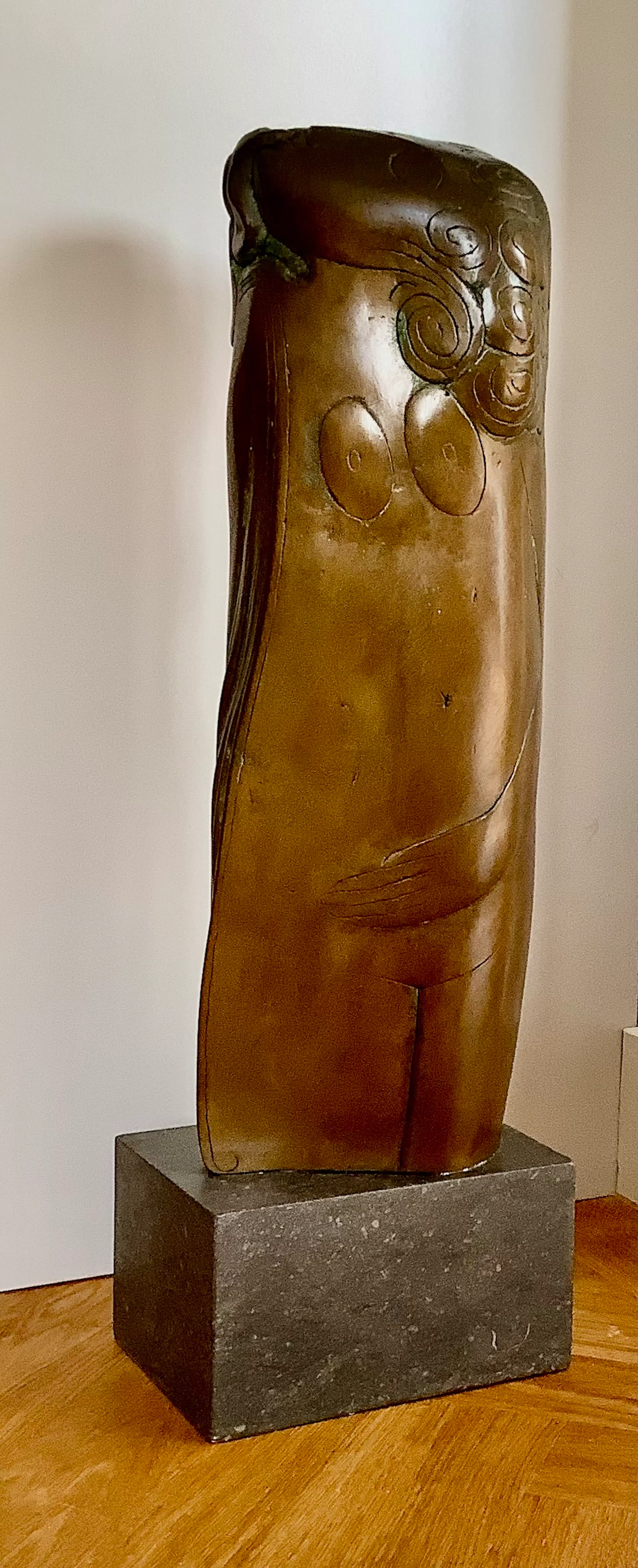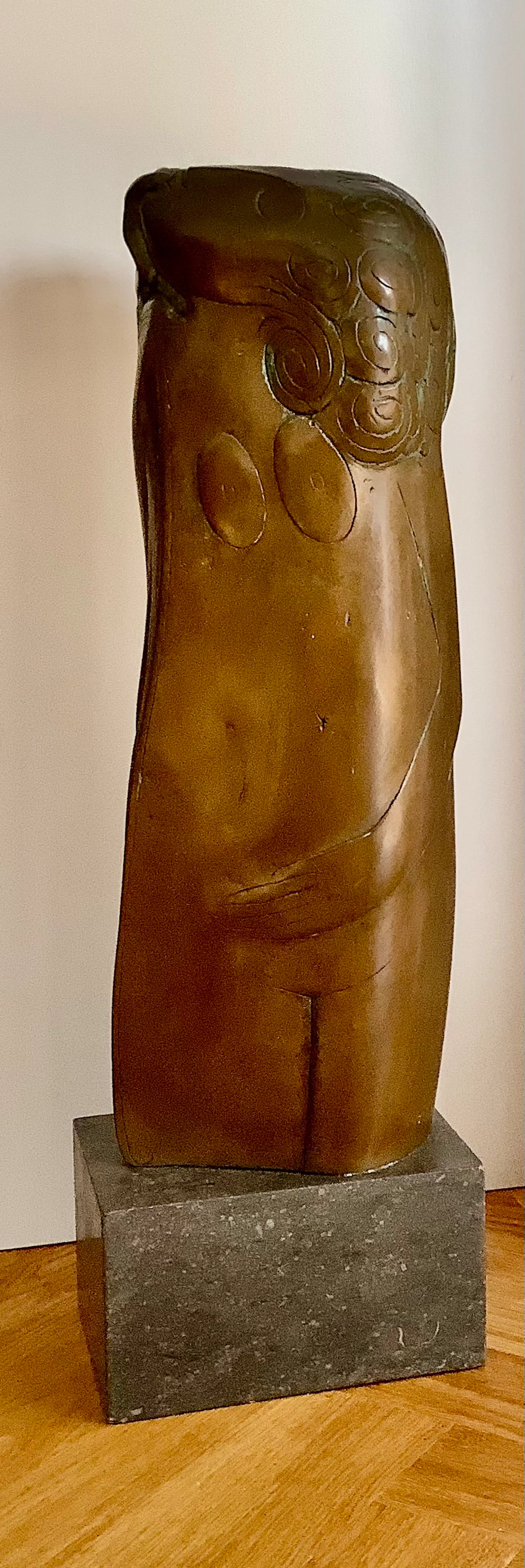 Grote sculptuur in de kenmerkende stijl van H. Beelenkamp. Op natuurstenen sokkel, afm. 10 x 18 x 13 cm. Mooie patina, elegant object. Kan ook buiten geplaatst worden. Alleen ophalen, zwaar object.