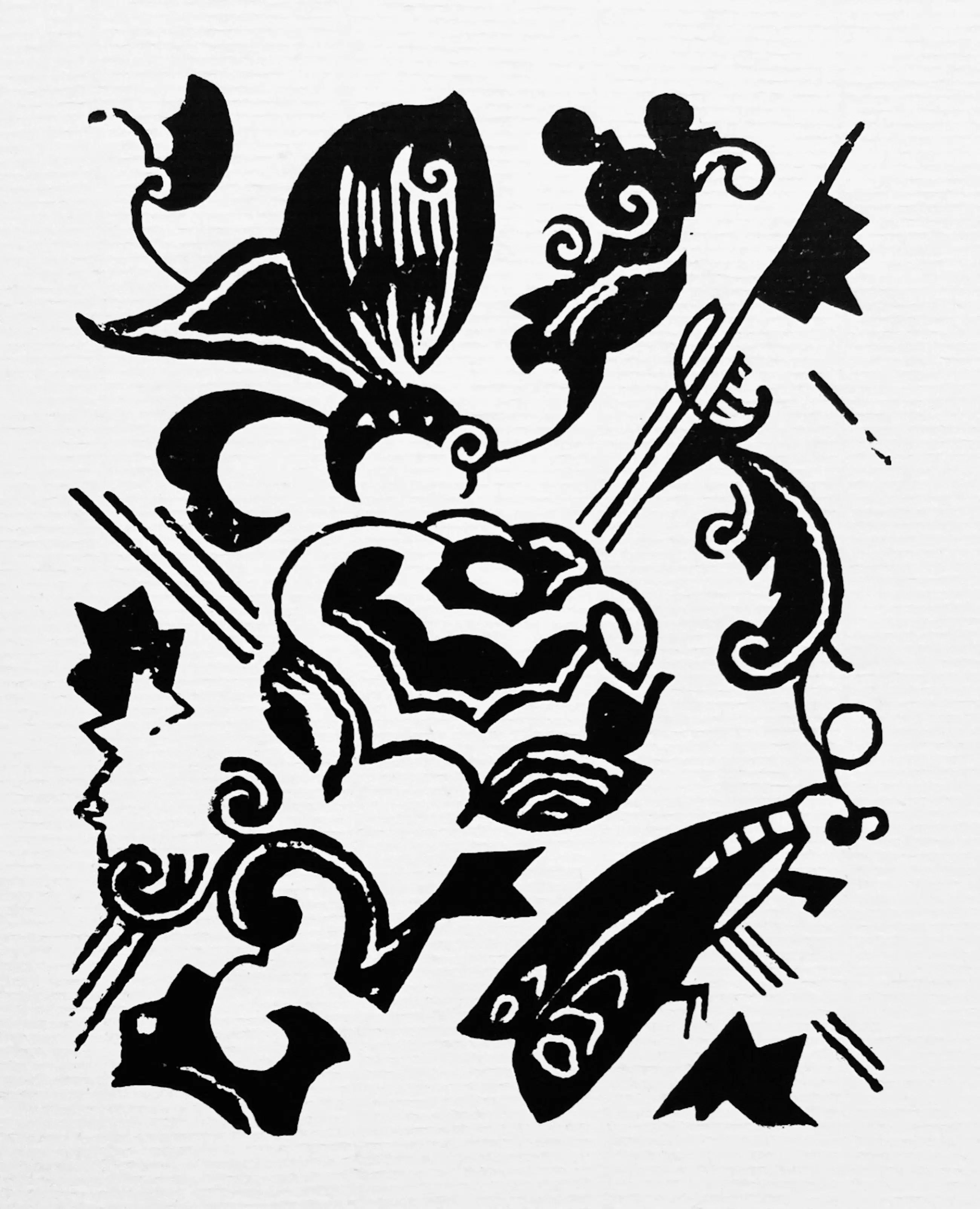 Hannah Höch: 4 originele linoleumsneden uit 1915-1917 uit de serie "Miniaturen", hier nummers 1, 4, 6 en 13. Titels: "Aankomende fladderende vogels" - "Zonsopgang" - "Vlinders" - "Tuinen van Siam". Bladformaat 22 x 15,5 cm per prent. De werken werden in 1964 gepubliceerd ter gelegenheid van een tentoonstelling van het werk van de kunstenares in de Nierendorf Galerie in Berlijn.