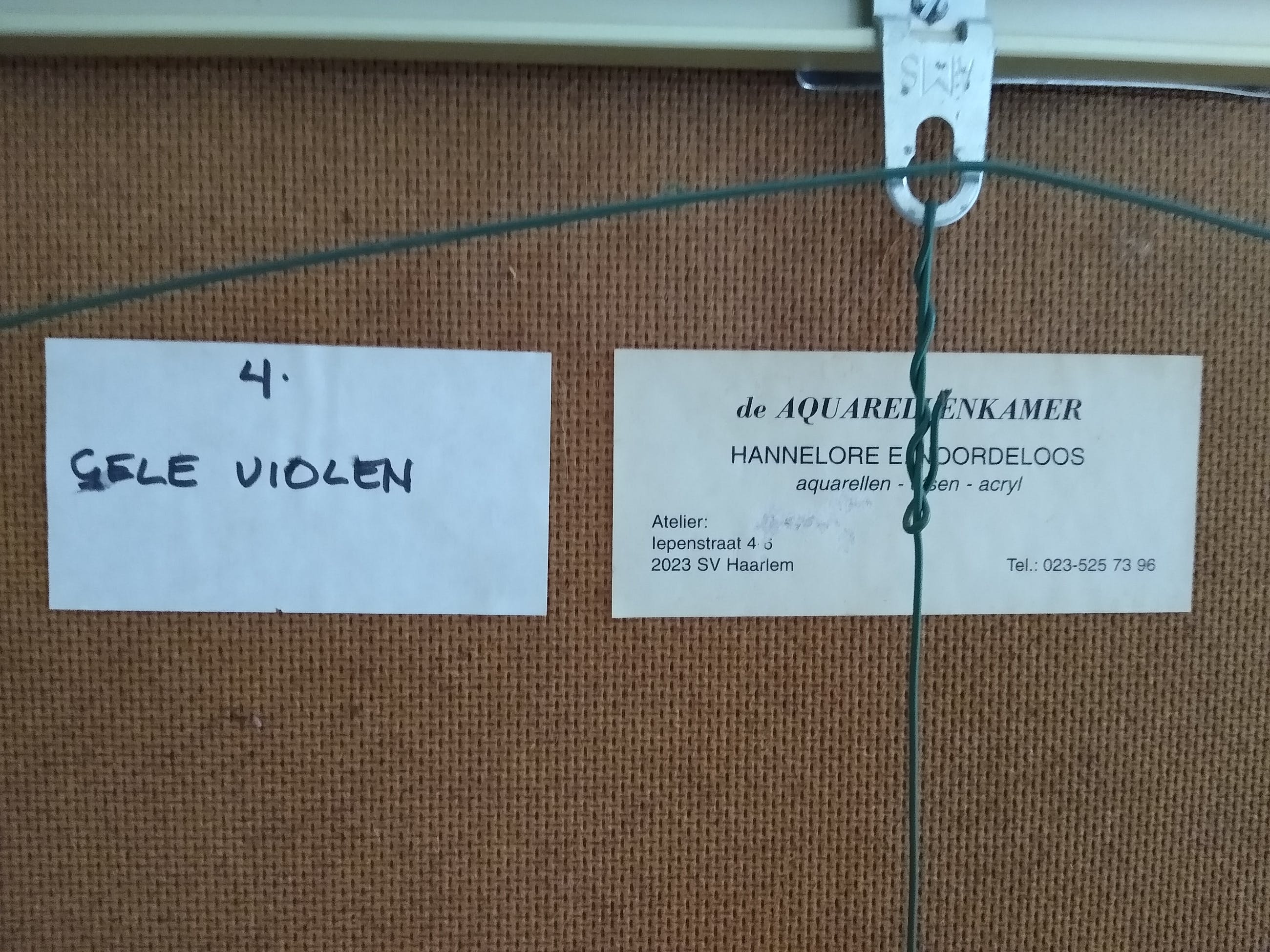 Prachtige aquarel genaamd Gele violen van Hannelore Noordeloos