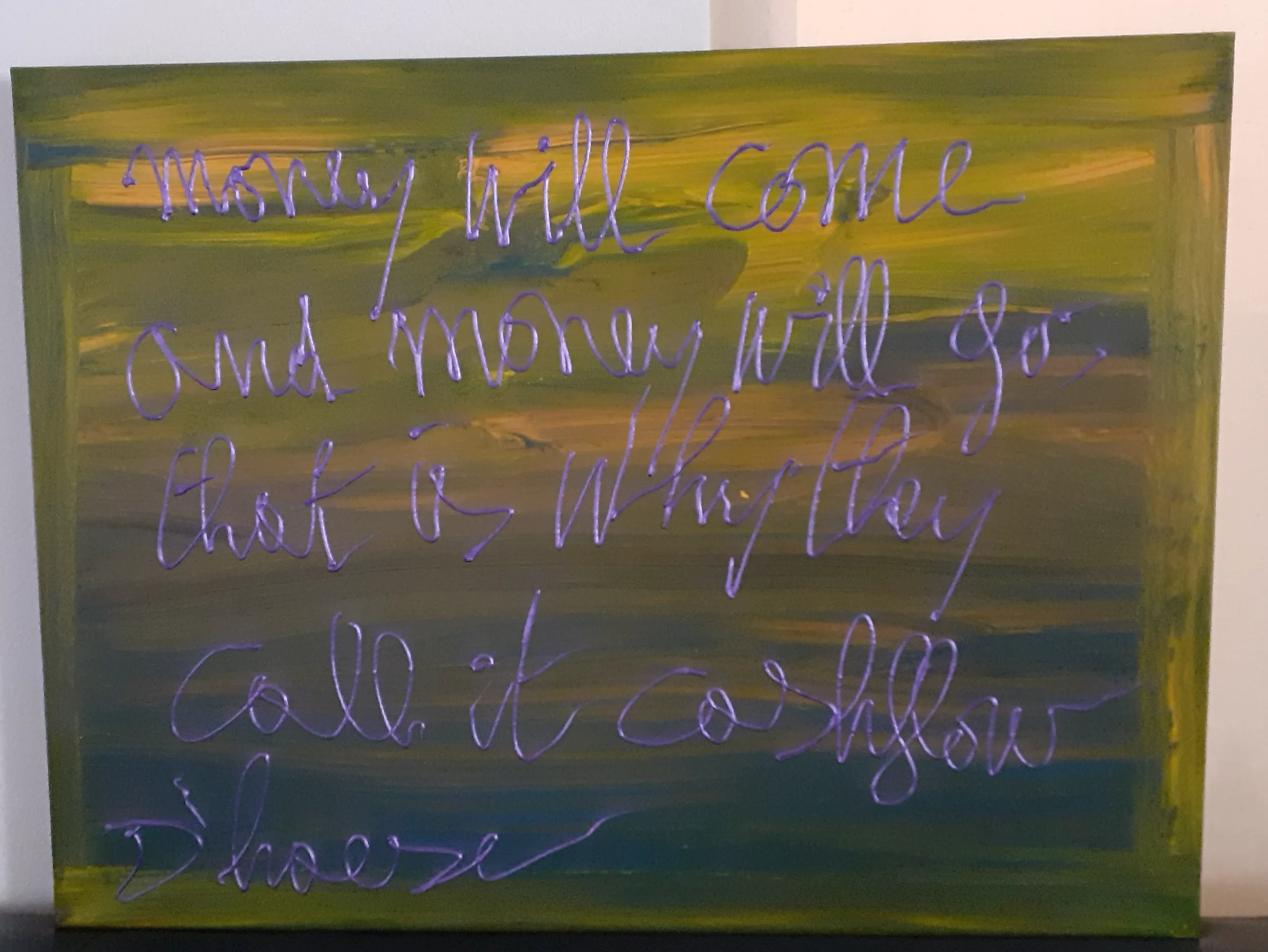 Schilderij met lyric van Hannes d'Haese 'Money will come, money will go....' Acrylverf op 3D-doek, 60 x 80 x 4, hand gesigneerd