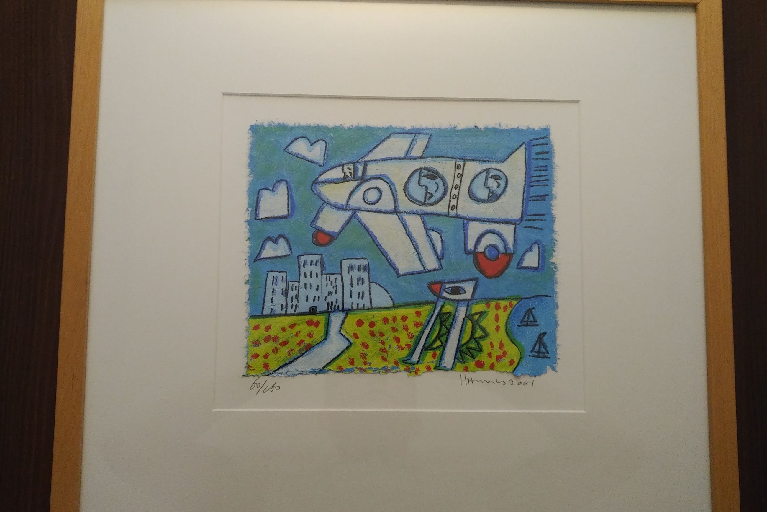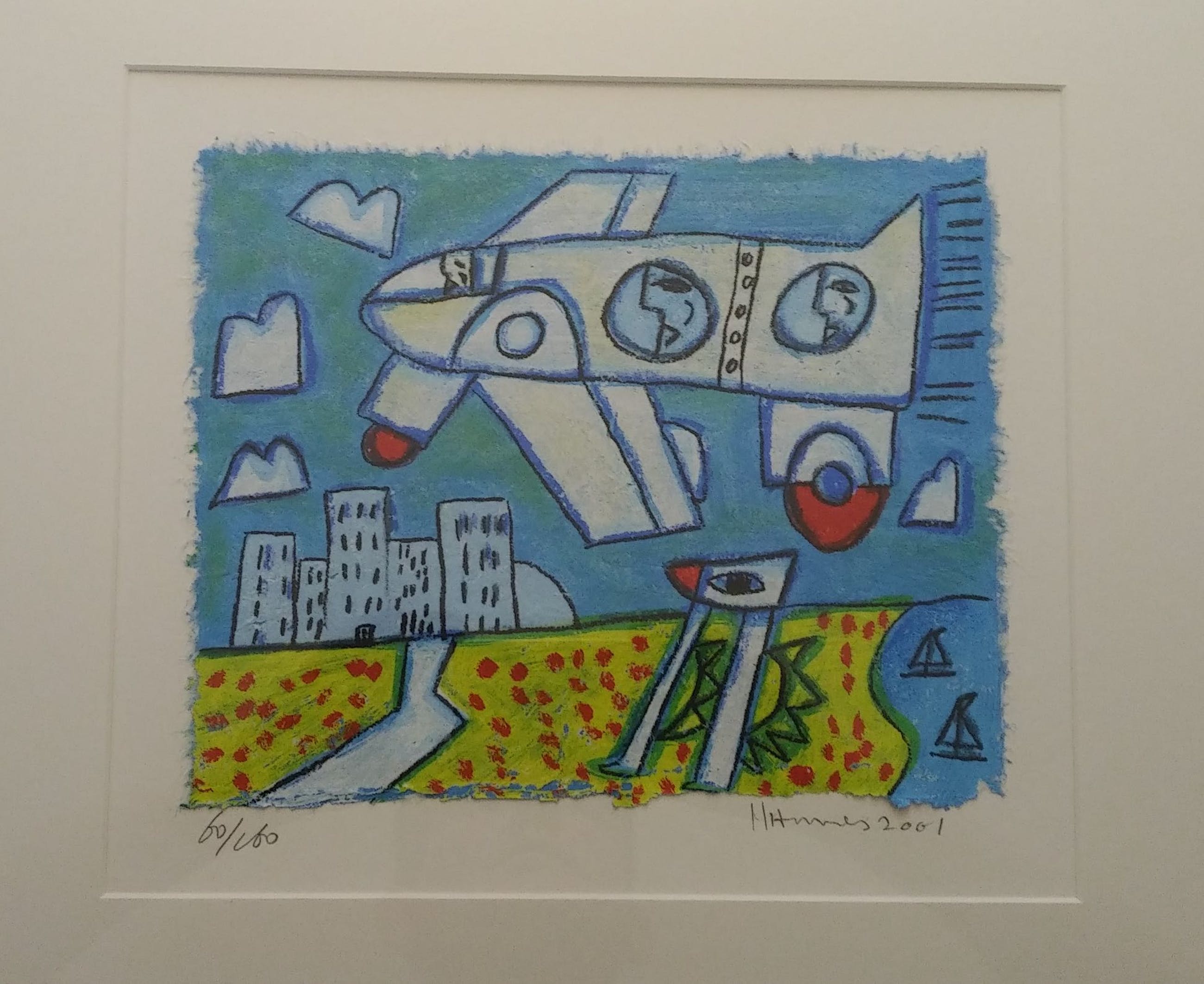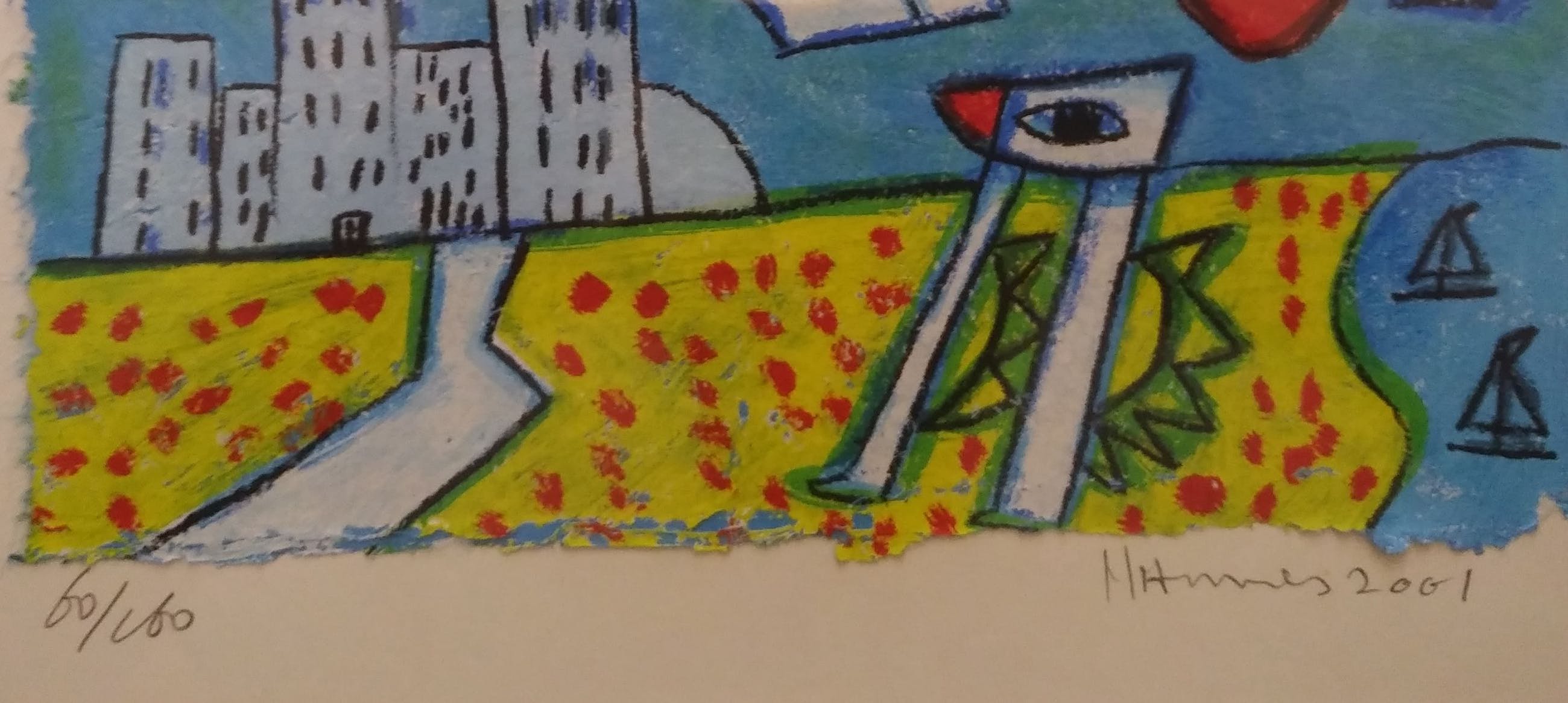 Leuke zeefdruk met de bekende motieven van Hannes Kuiper. Nummer 60 van 160Deel van een set van vier zeefdrukken, allemaal nummer 60 van 160. Kleurrijk en fris.