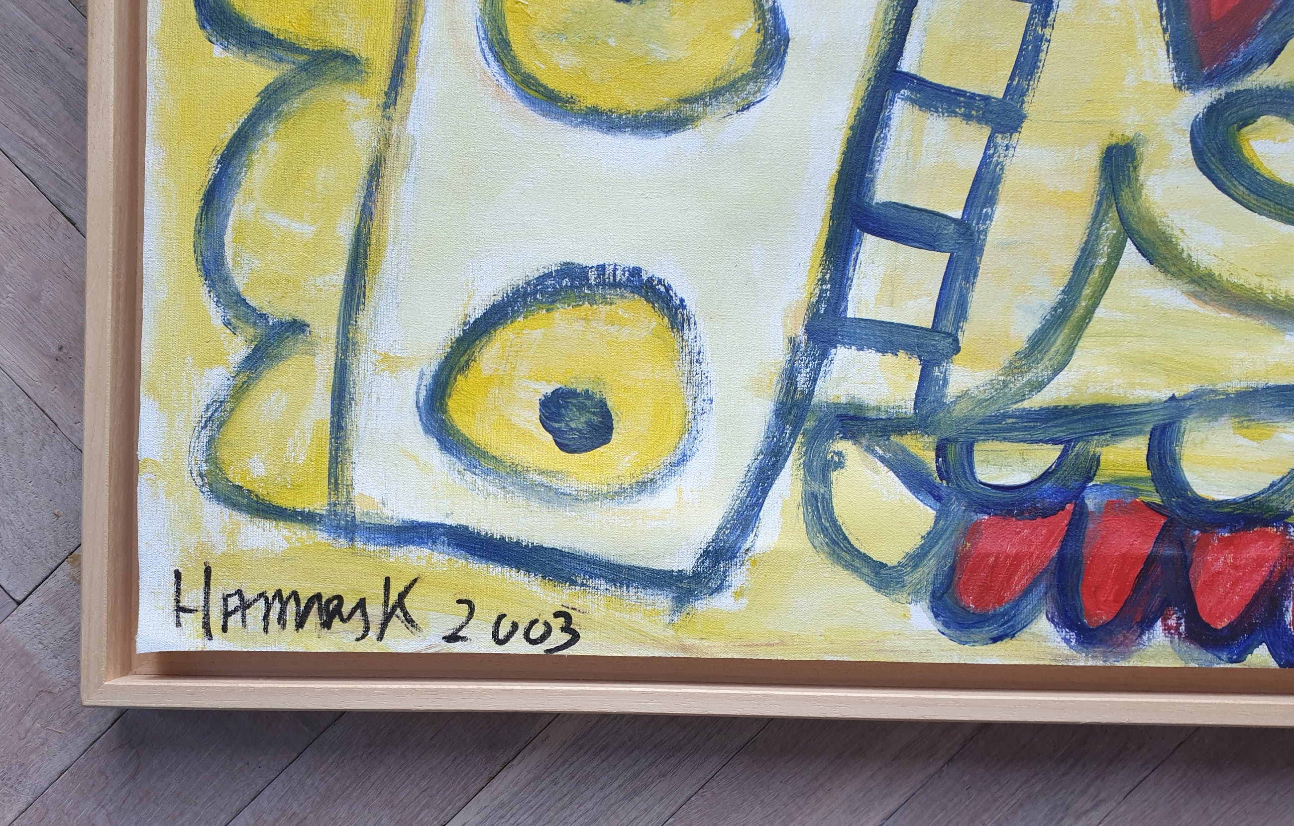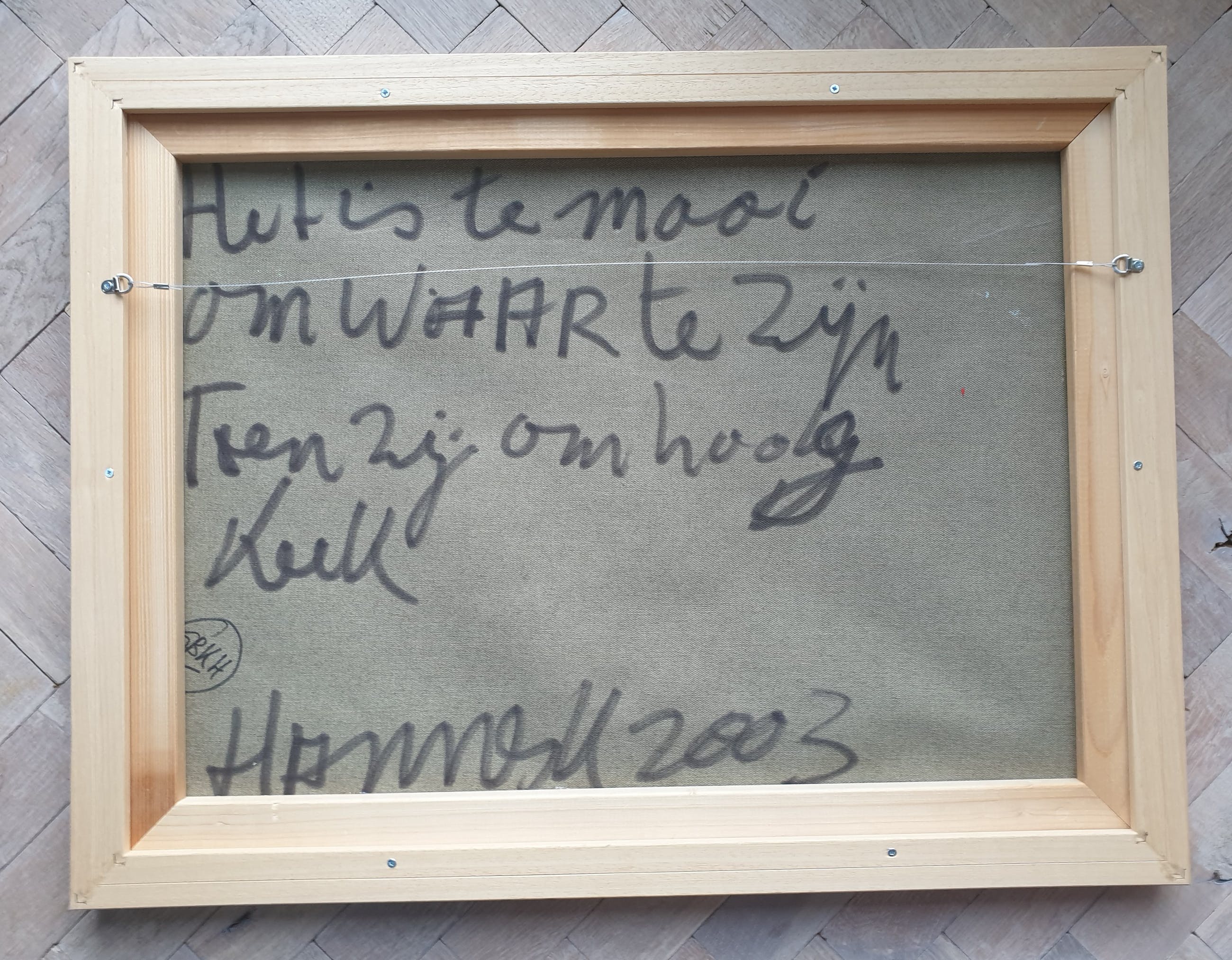 Hannes Kuiper, Acrylwerk op doek uit 2003 Titel; "Het is te mooi om waar te zijn terwijl ze omhoog keek". Aan de voor en achterzijde gesigneerd. Het werk meet inclusief houten baklijst (met gebruikssporen) 55 x 73 cm.