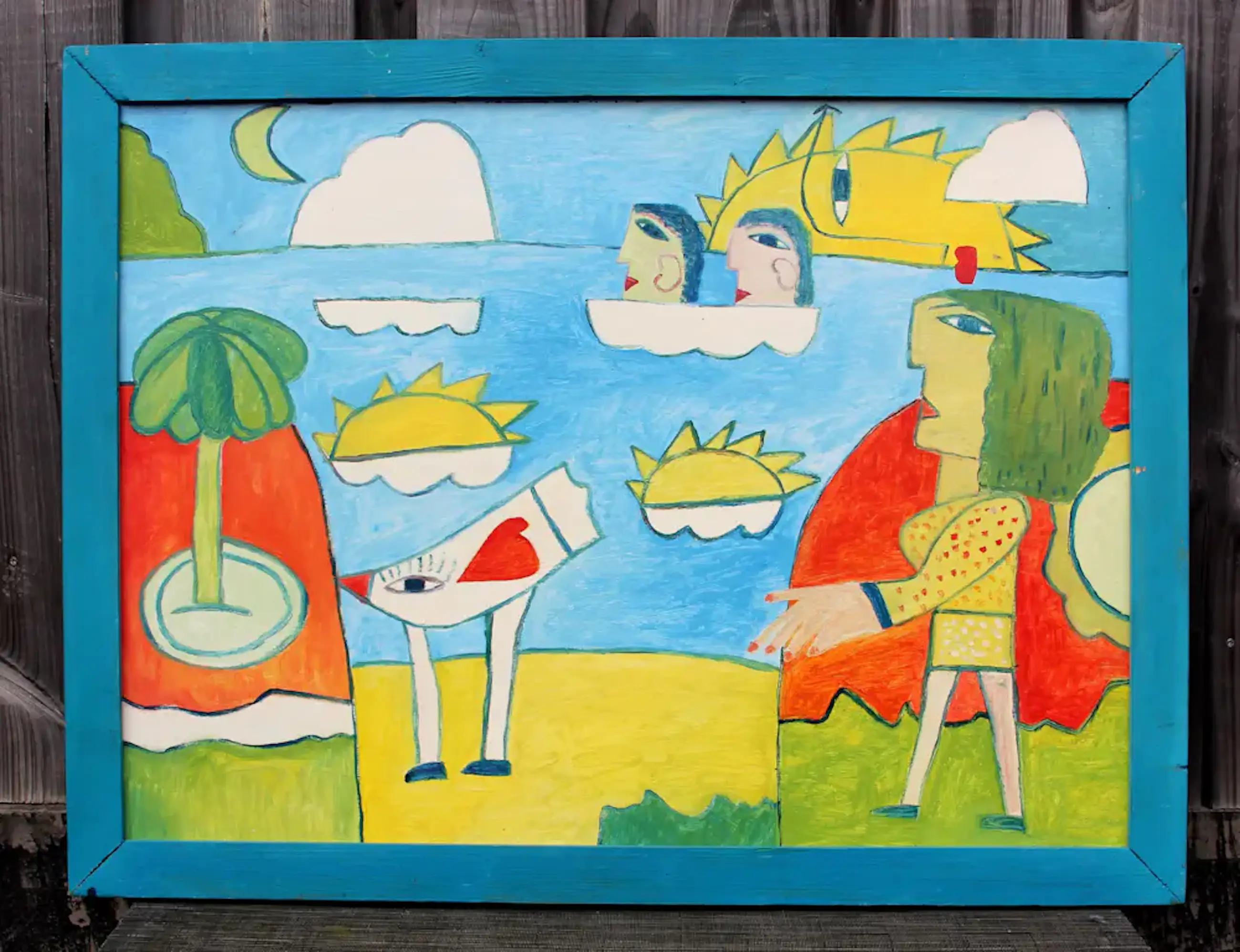 Ingelijste acrylverf van de Belgische kunstenaar Hannes Kuiper. Titel: 'Wandeling met palm beats'. Afmetingen incl lijst: H65 x b85.5cm. Afmetingen voorstelling: H56 x b77cm. Het werk is achterop gesigneerd door de kunstenaar. De authenticiteit van het, aangeboden, werk wordt volledig gegarandeerd. Een certificaat van echtheid kan, op aanvraag, worden gemaild.