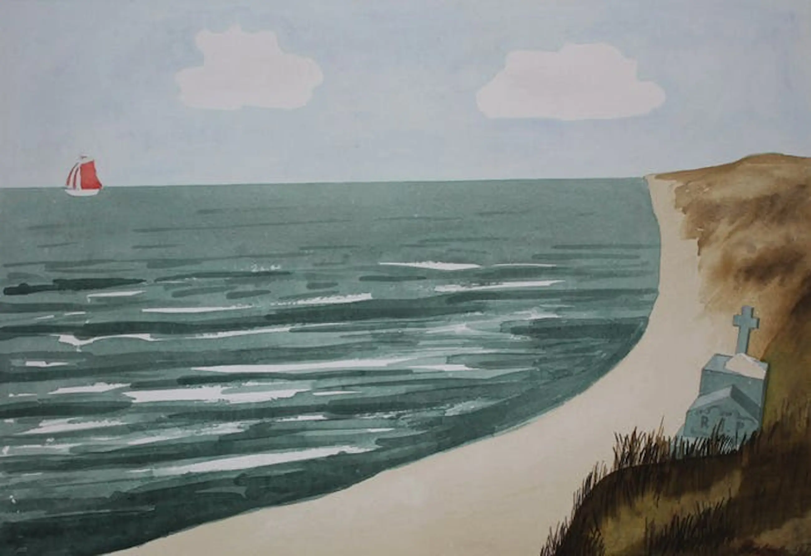 Aquarel (met gekleurd krijt en zwarte inkt) van Hannes Postma. Voorstelling van een surrealistisch zeegezicht. Jaar: 1971. Afmetingen blad: H56.5 x b76cm. Afmetingen voorstelling: H44 x b63.5cm. Het werk is rechts onderaan gesigneerd door de kunstenaar. Een certificaat van echtheid kan, op aanvraag, worden gemaild.