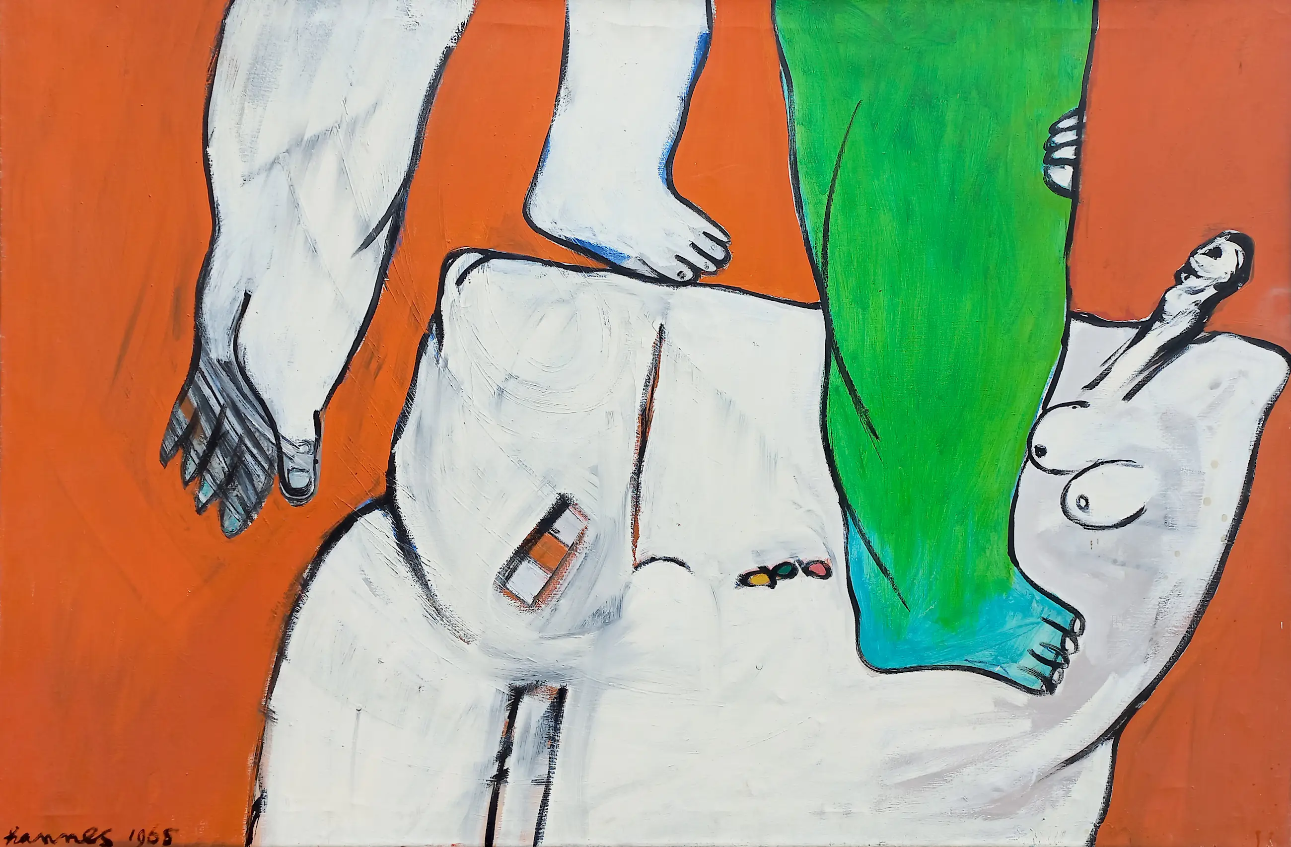 Groot, karakteristiek werk van Hannes Postma uit 1965. Olieverf op doek, gesigneerd en gedateerd linksonder. In zeer goede conditie.