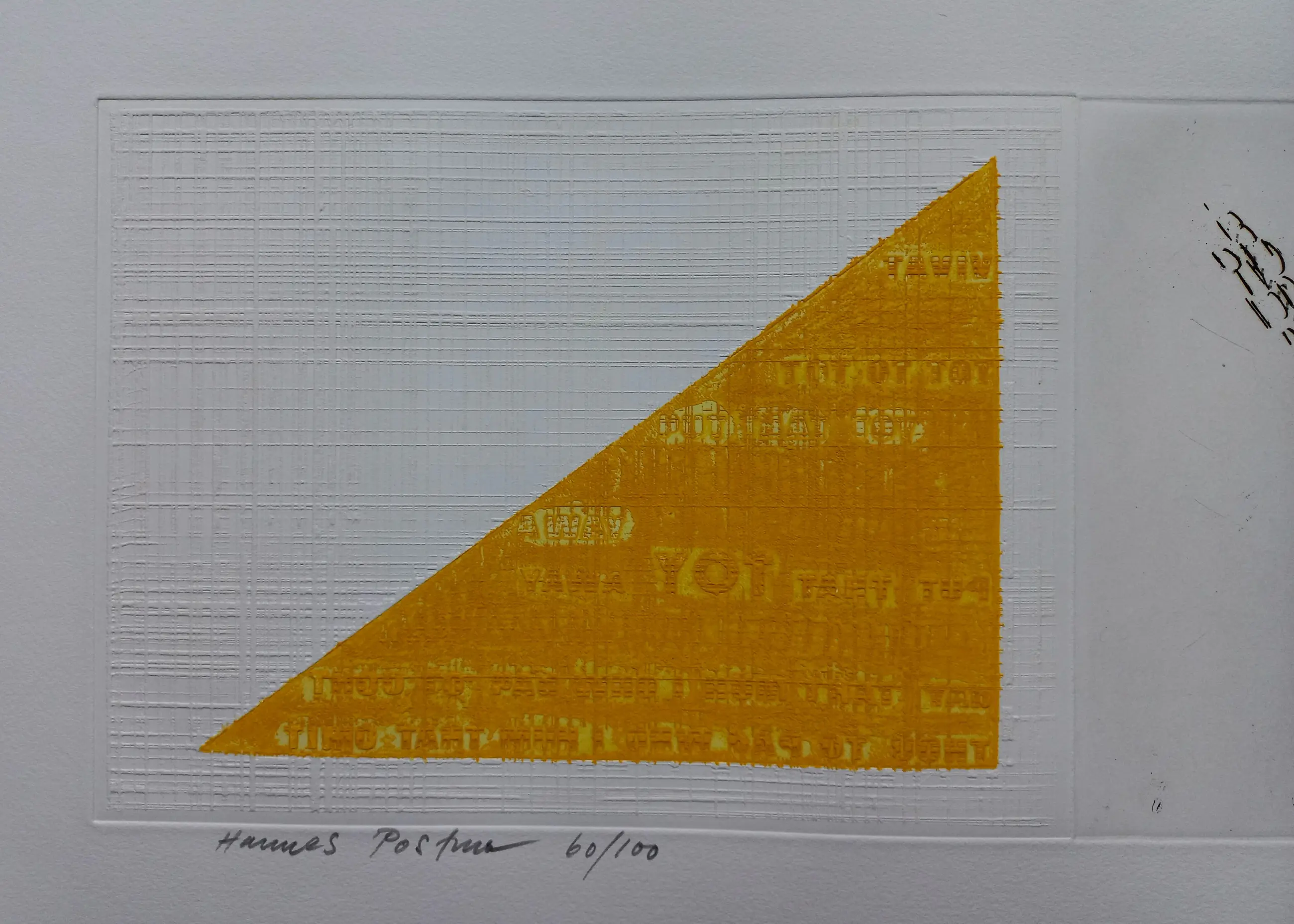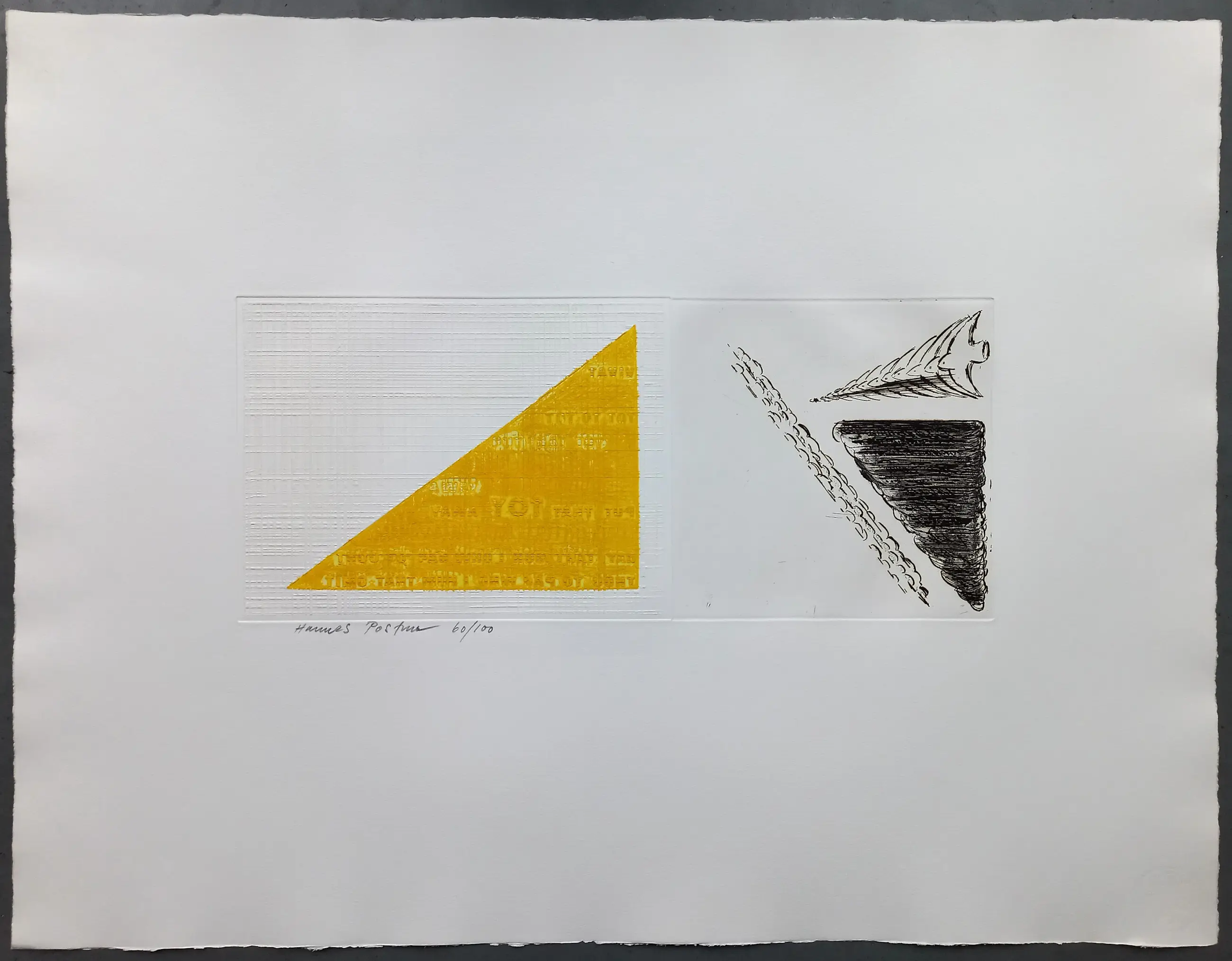 Hannes Postma (1933-) - gesigneerde ets / reliëfdruk. Gedrukt in een oplage van 100 stuks. Het werk is gesigneerd in potlood en 60/100. Papiermaat 50.5 x 65.5 cm. (hxb) De ets / reliëfdruk is in zeer goede staat.