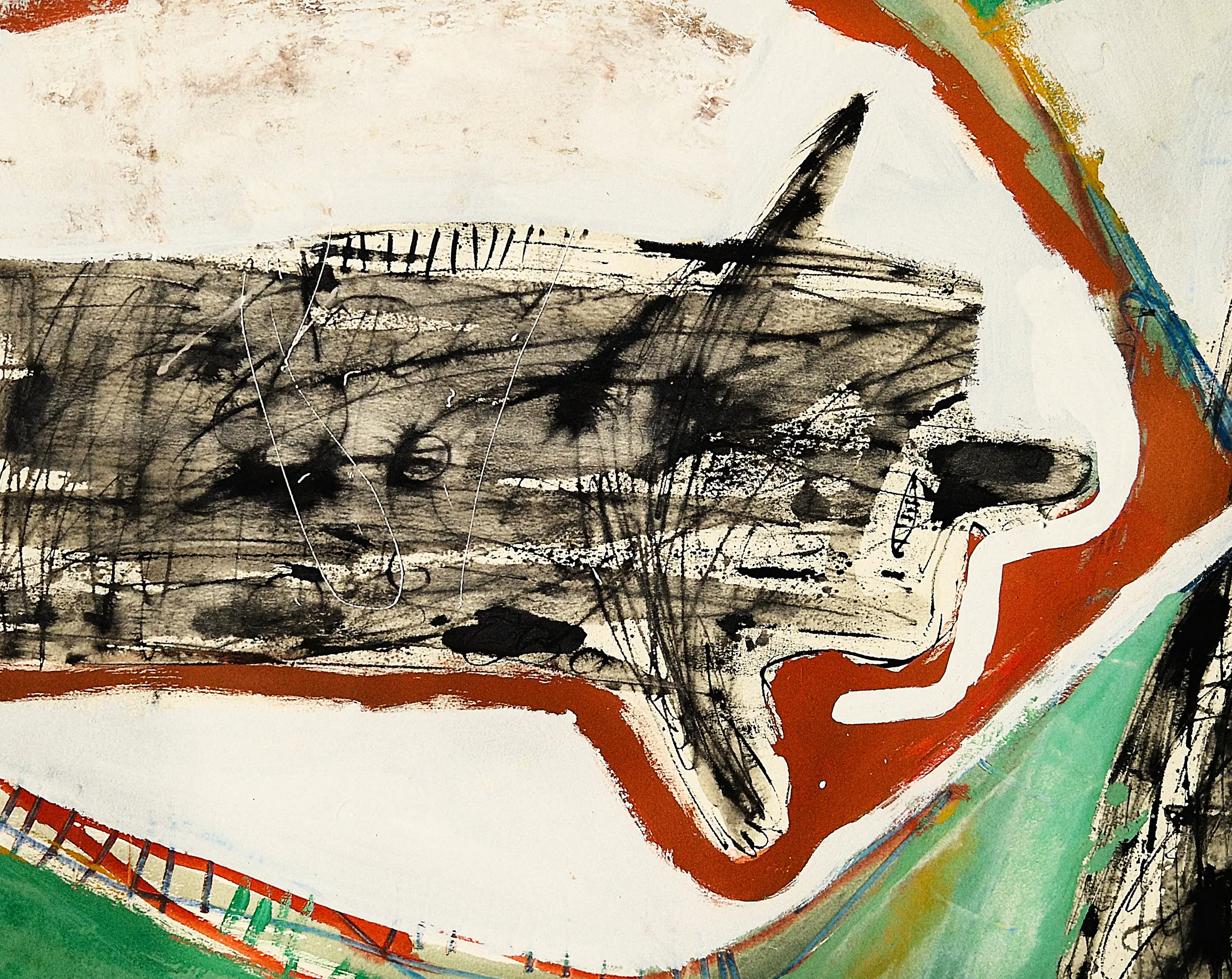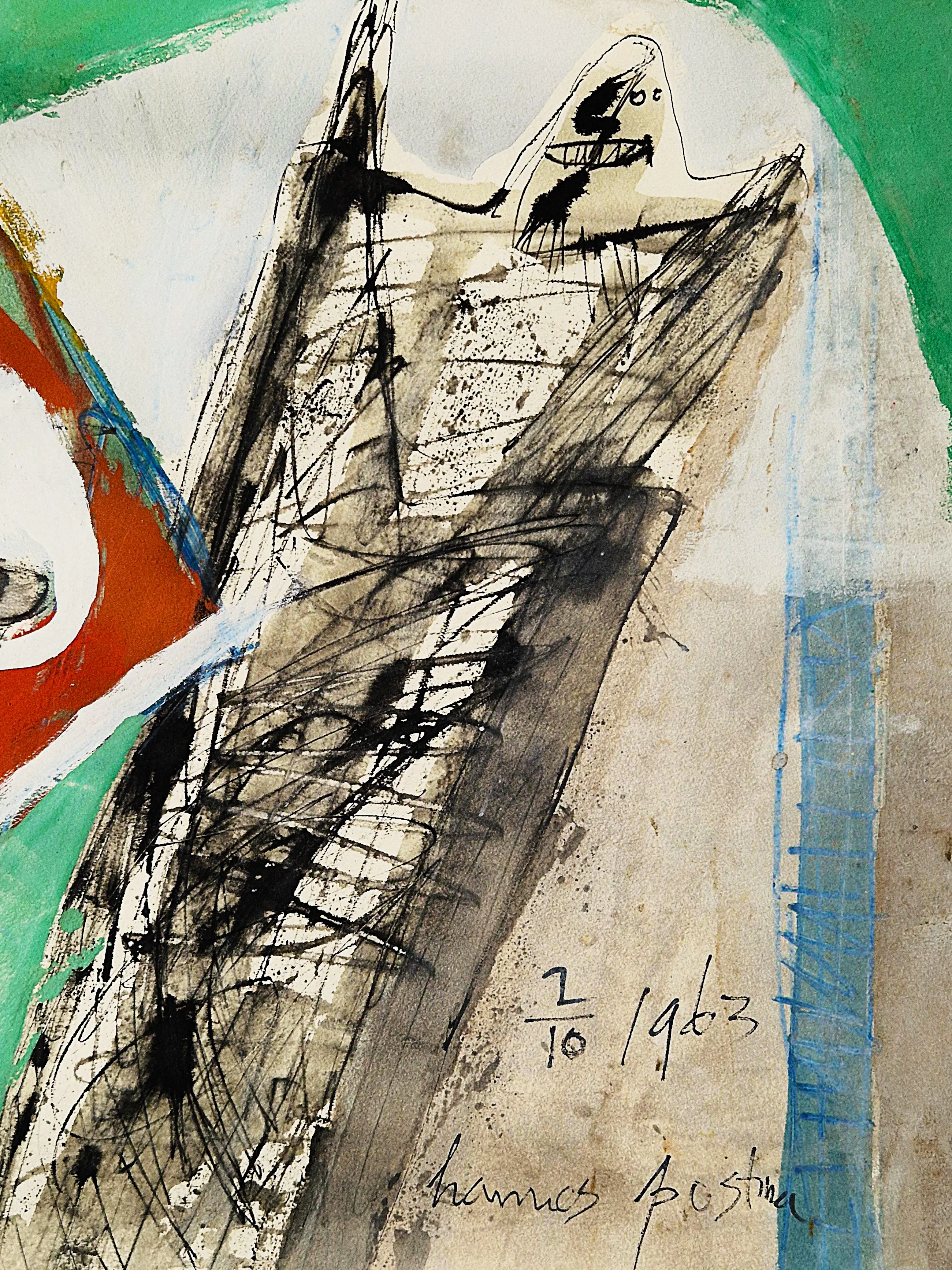 - Medium: gemengde techniek (pastel, aquarel, stift) op papier