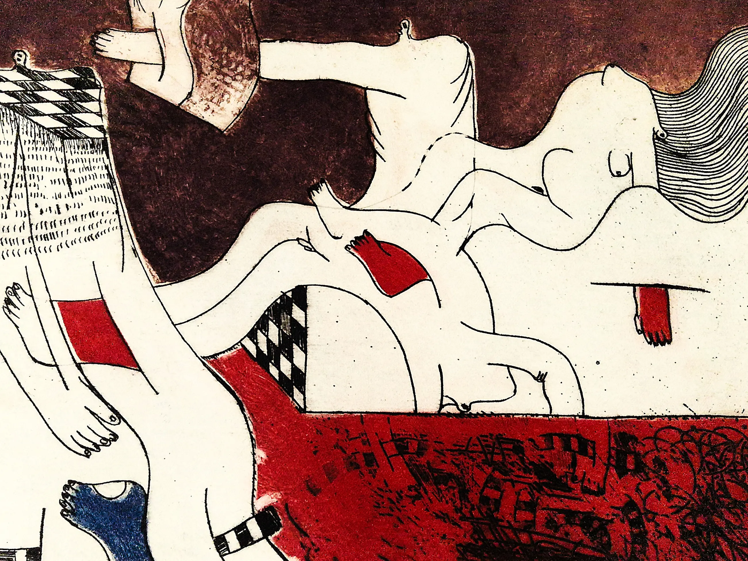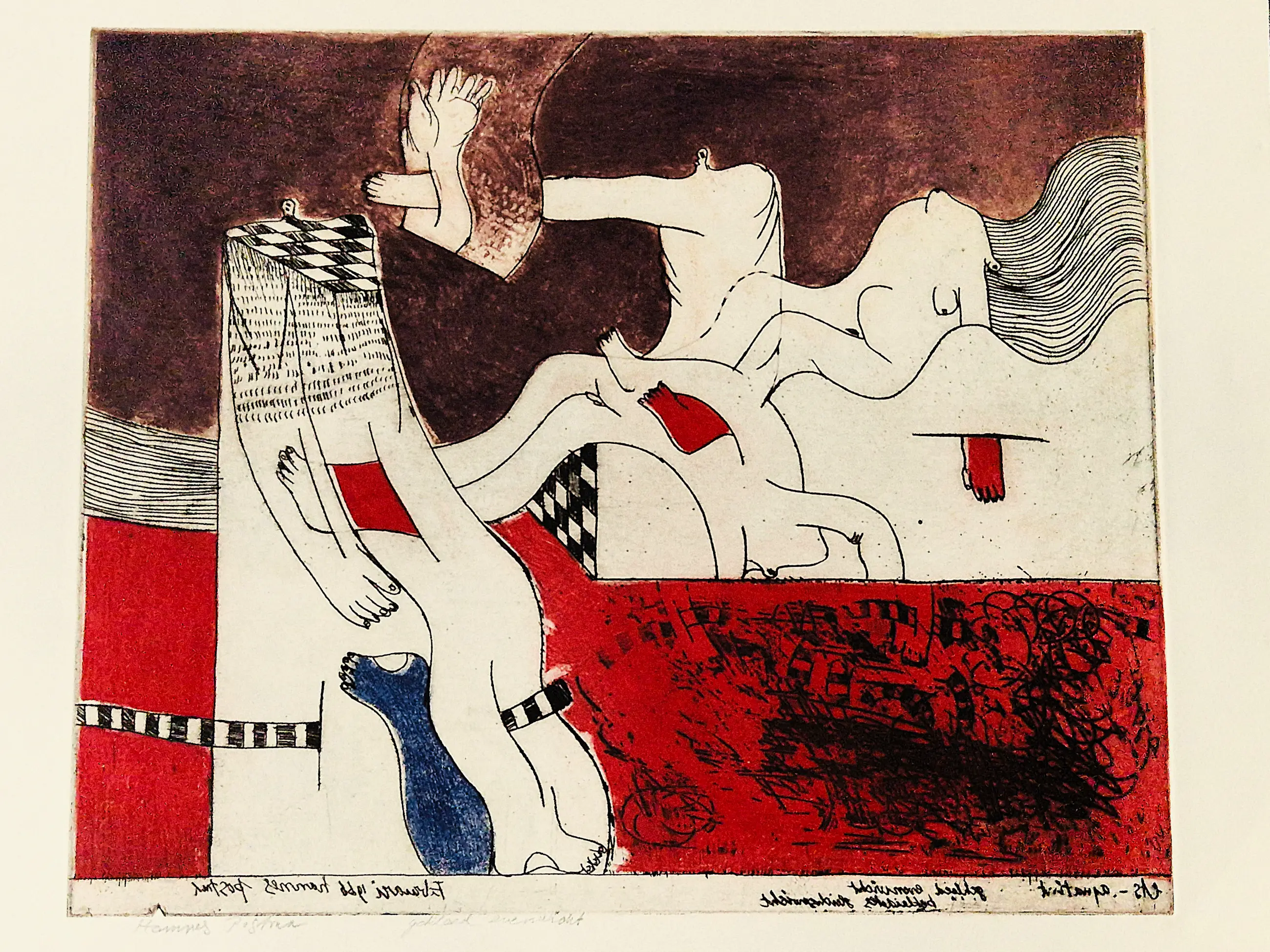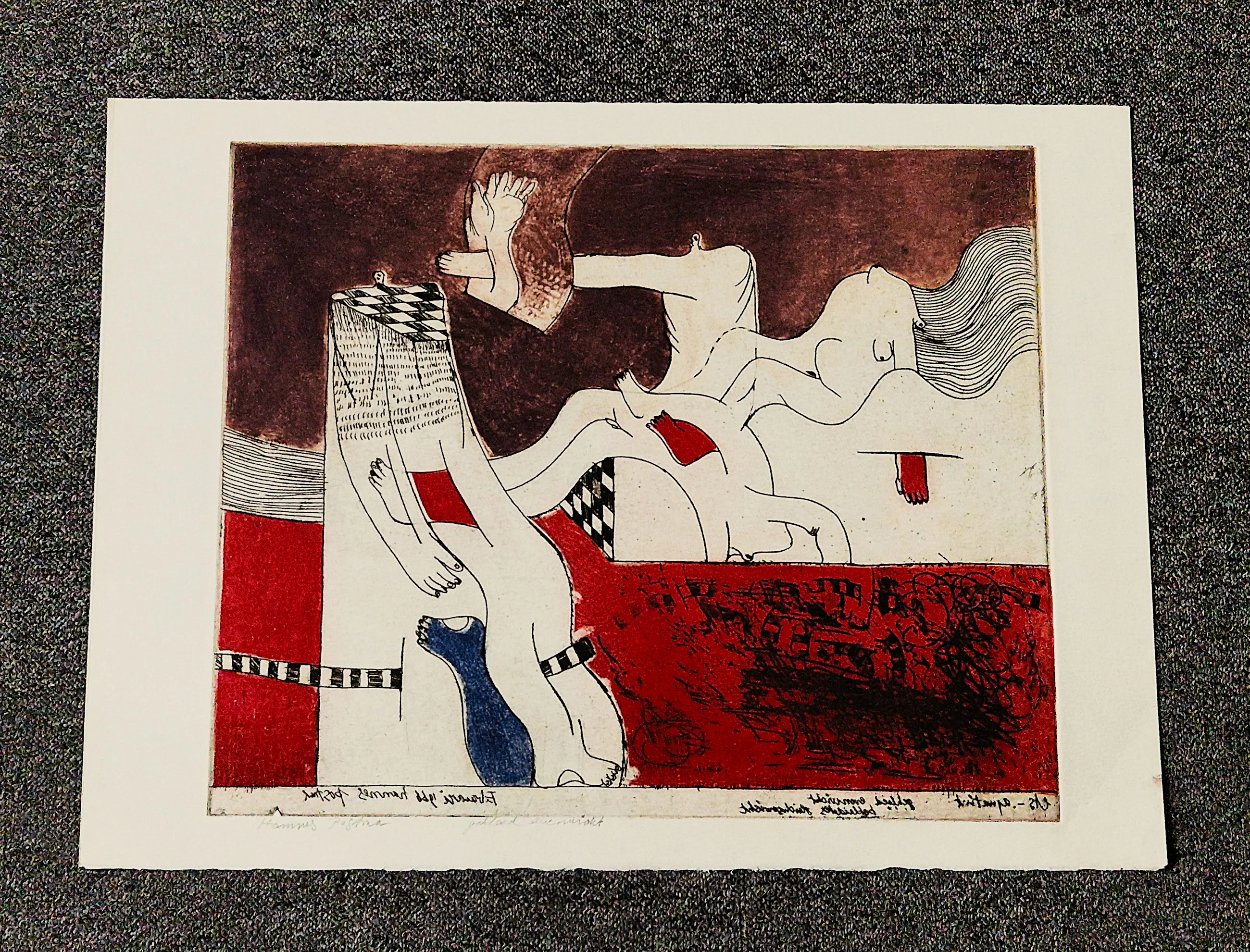 - Medium: handgekleurde reliëf ets en litho op geschept papier