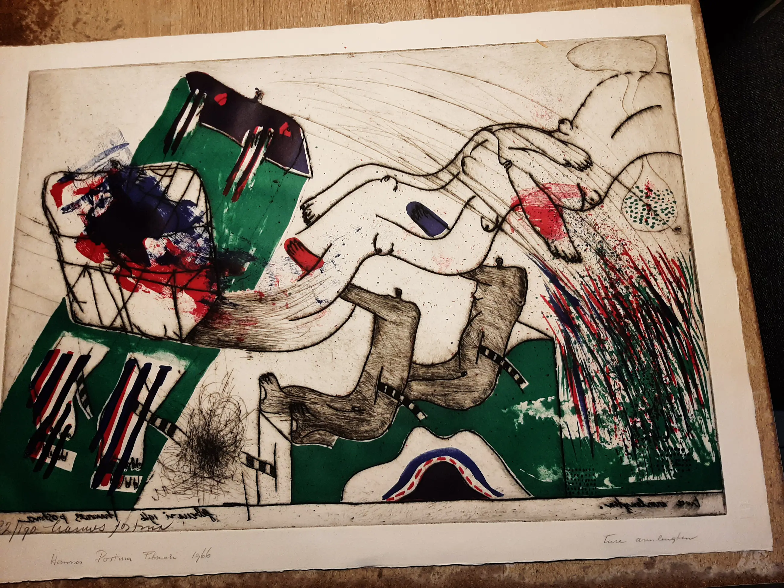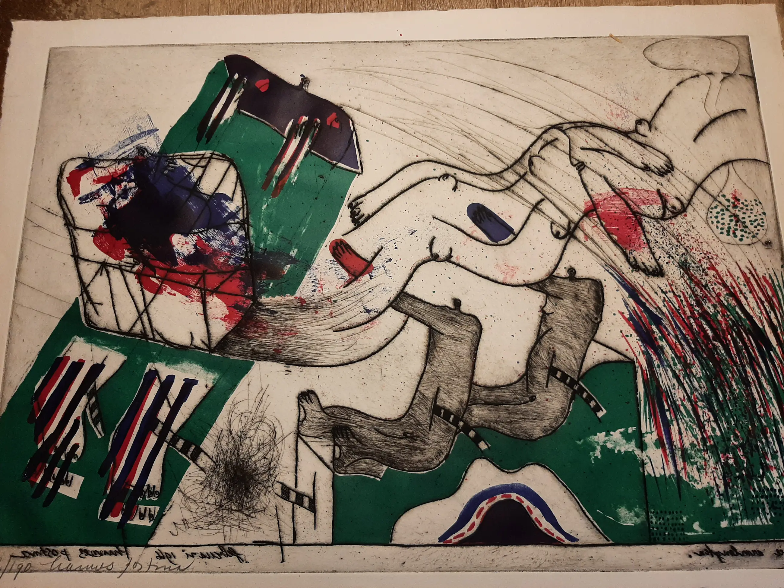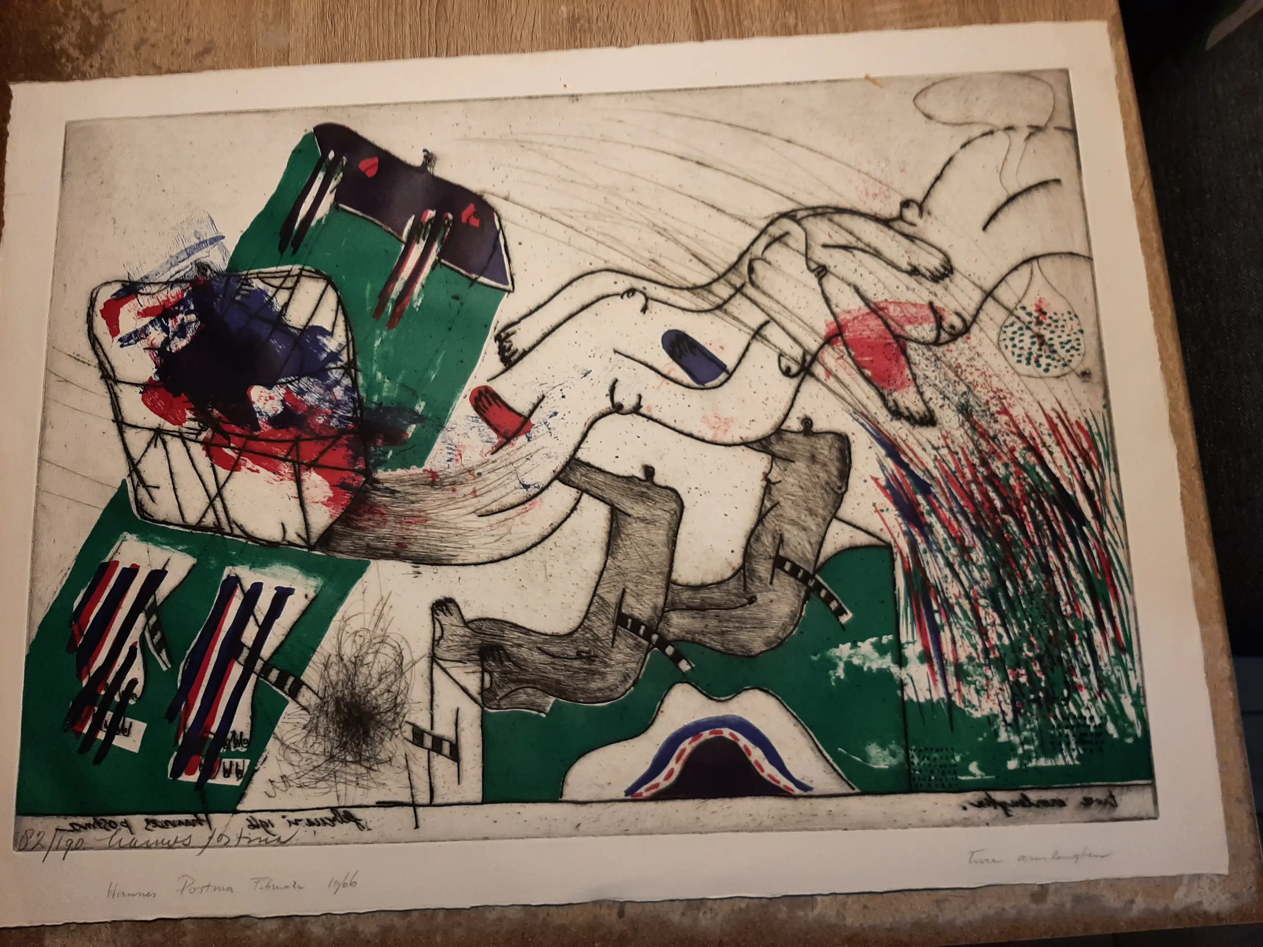 Medium: handgekleurde reliëf ets en litho op geschept papier