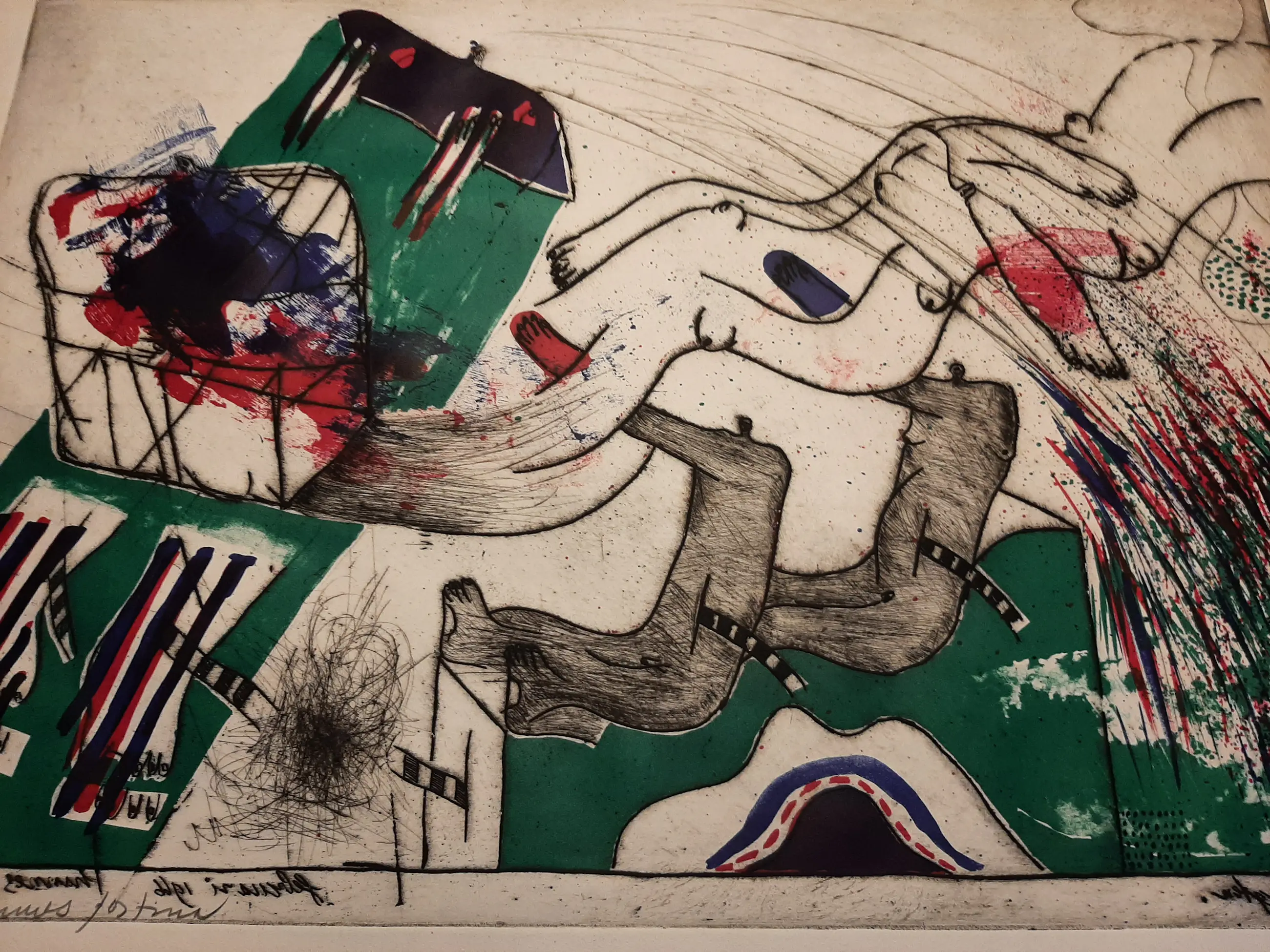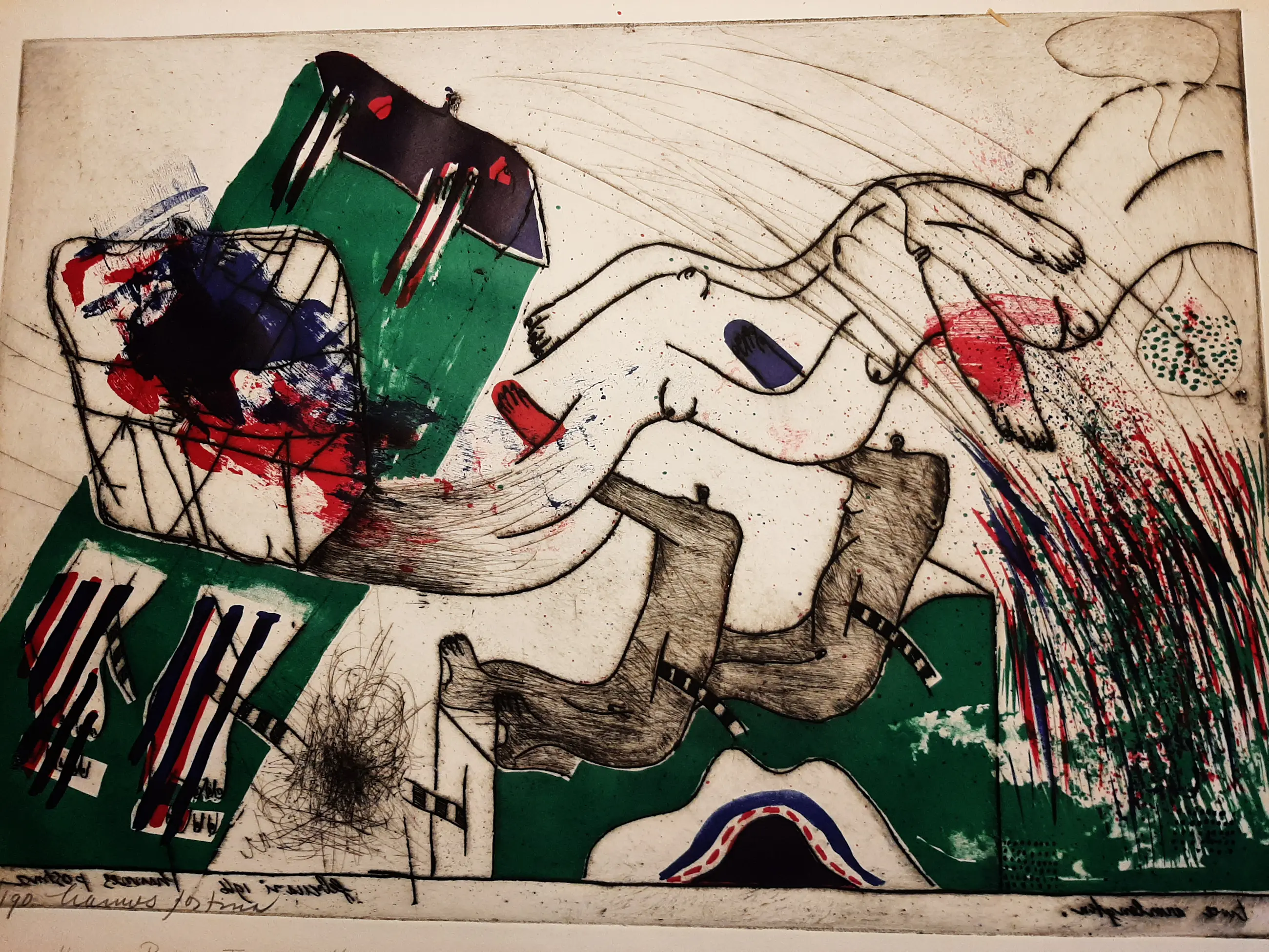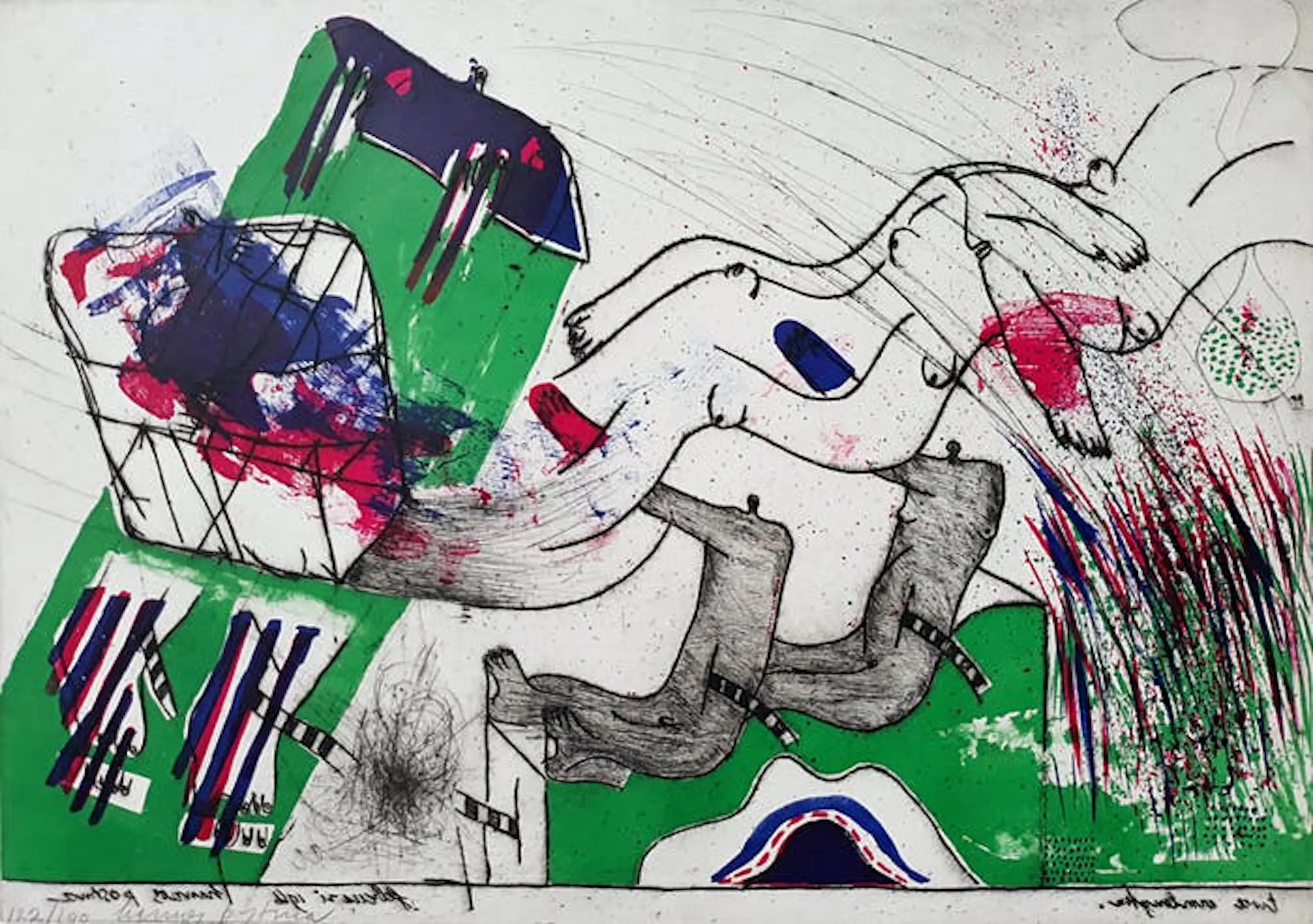 Medium: handgekleurde reliëf ets en litho op geschept papier