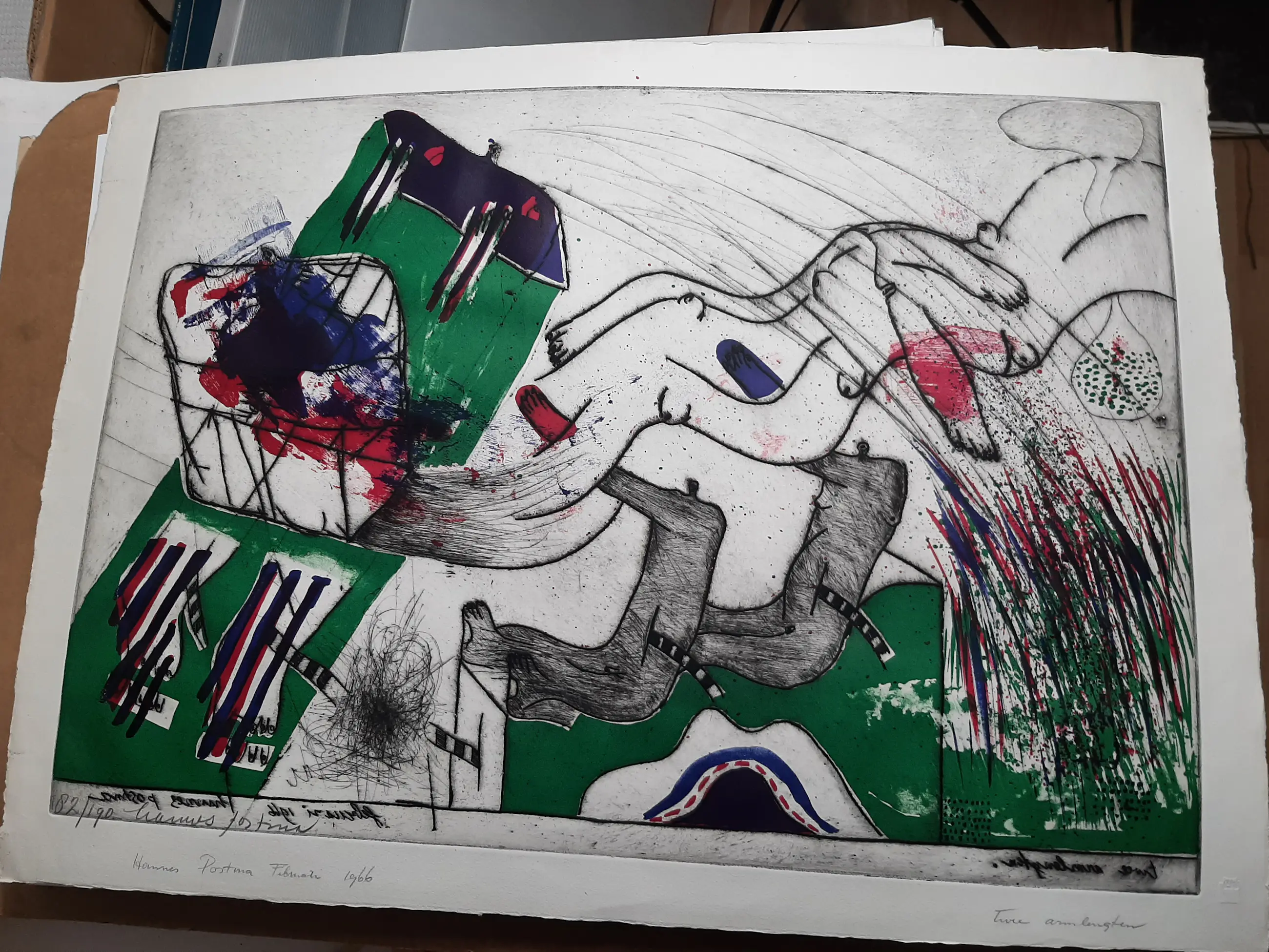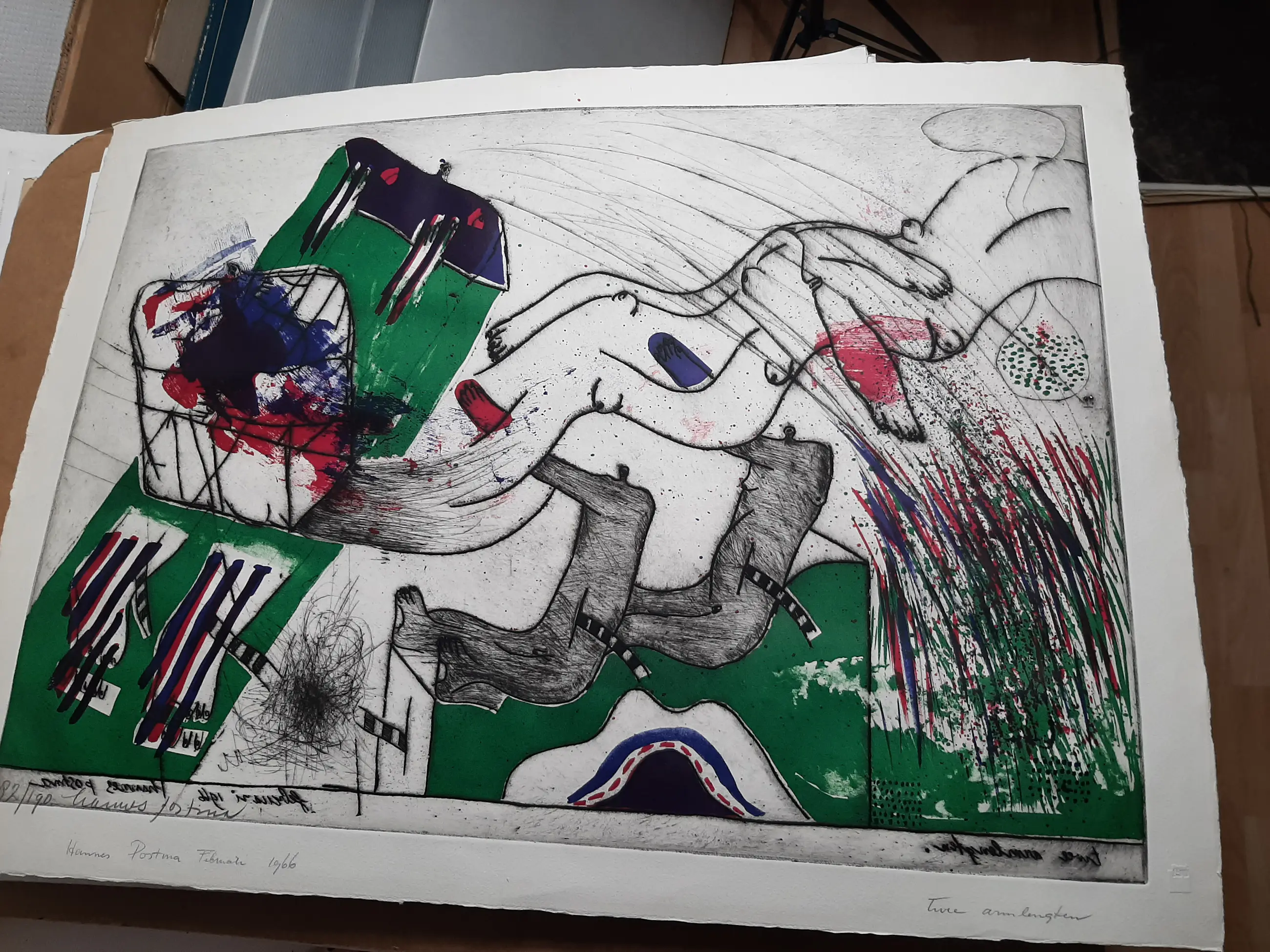 Medium: handgekleurde reliëf ets en litho op geschept papier