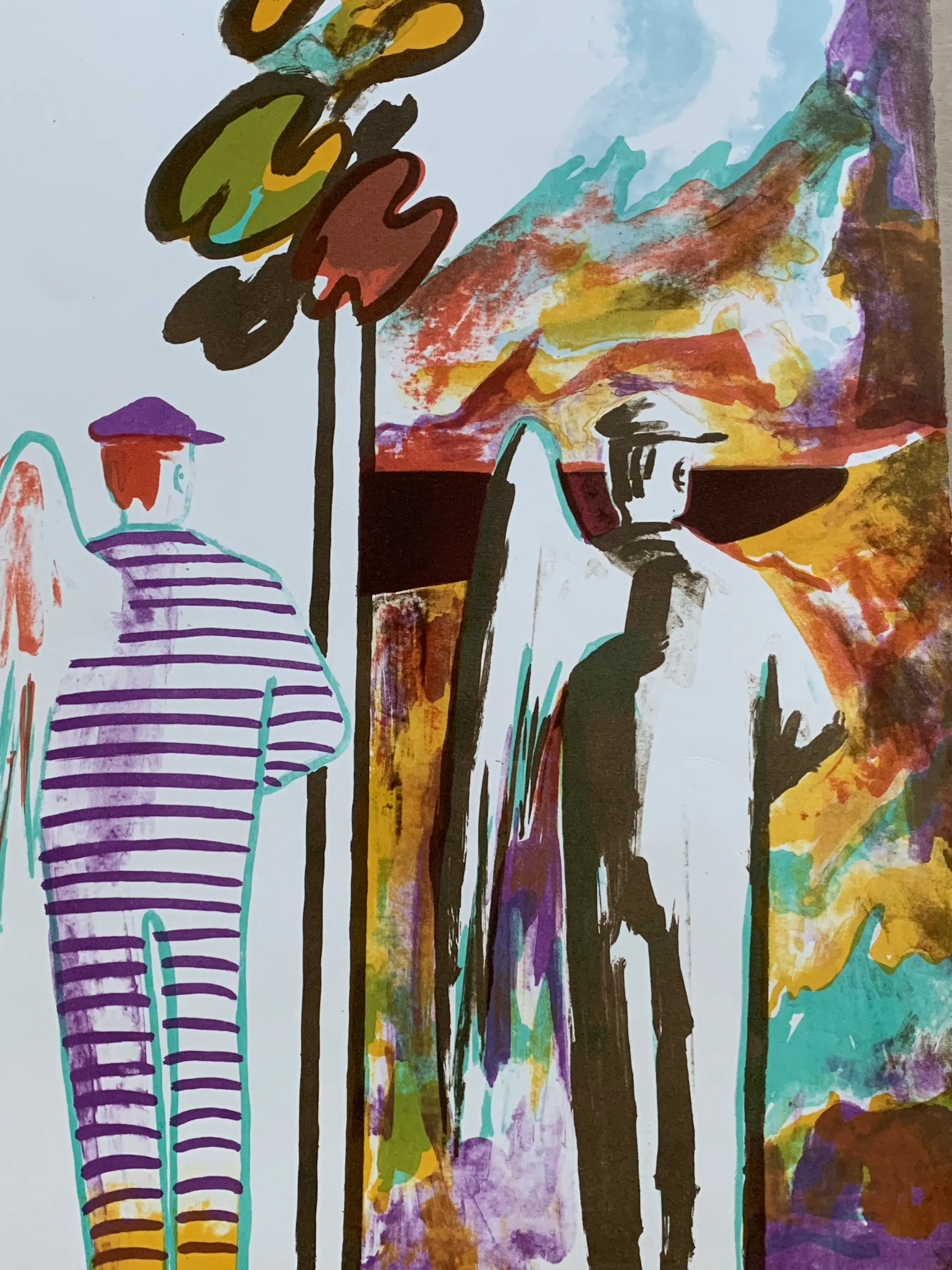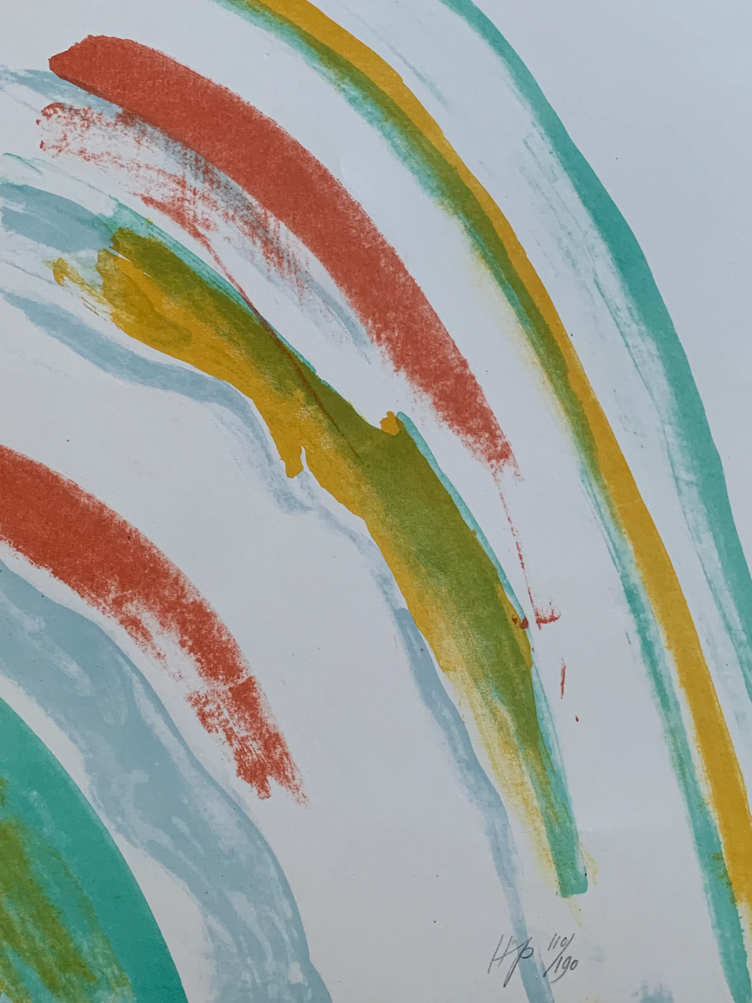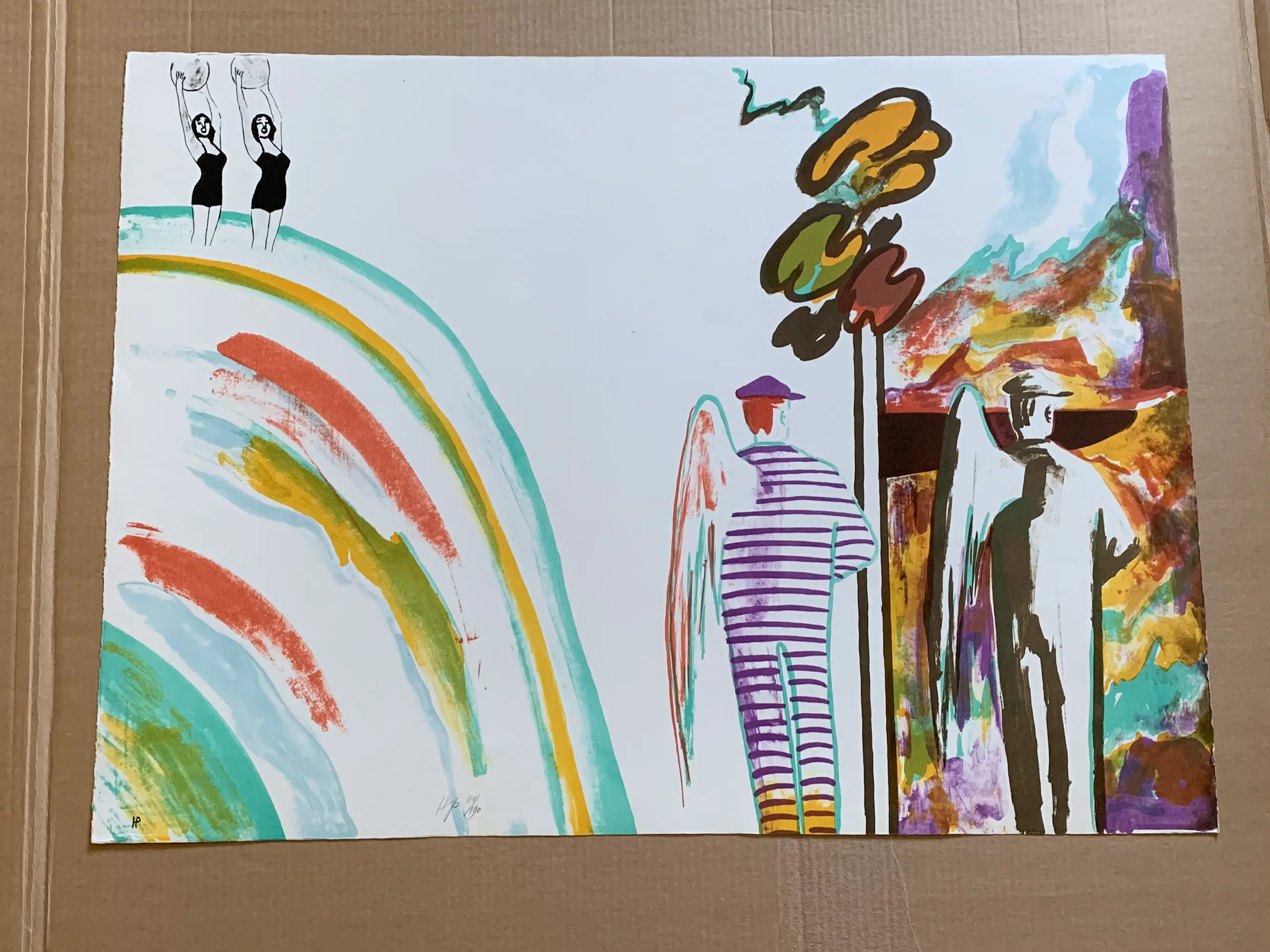 Kleurrijke litho van Hannes Postma uit 1975. Dubbel gesigneerd en genummerd door de kunstenaar. Uitgegeven door Prent Dit is oplagenummer 110.