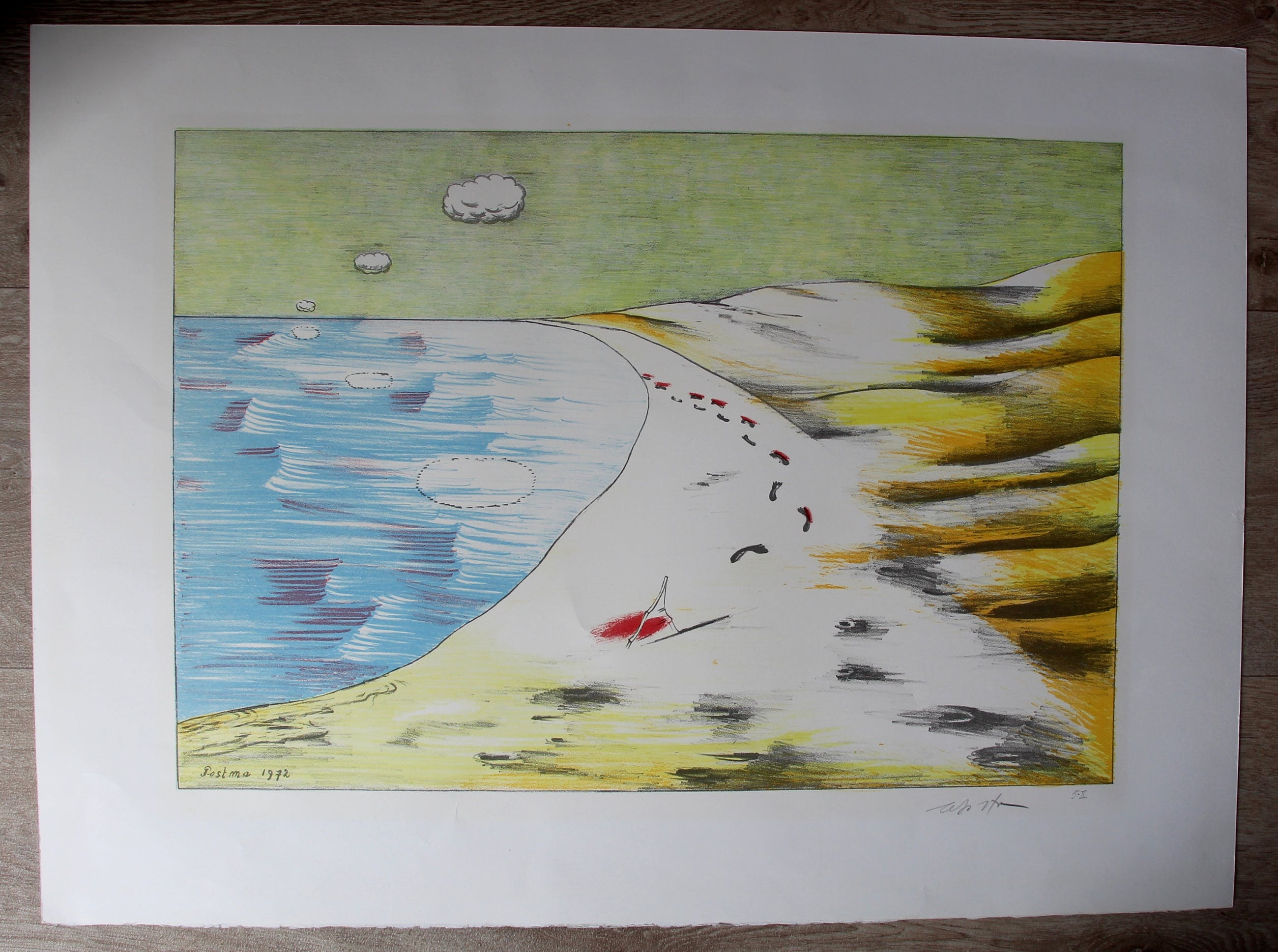 Litho van Hannes Postma uit 1972. Nummer: 5/X. . Afmetingen blad H48 x b65. Afmetingen voorstelling: H34.5 x b50. Het werk is linksonder gesigneerd door de kunstenaar. De authenticiteit van het aangeboden werk wordt volledig gegarandeerd. Een certificaat van echtheid kan, op aanvraag worden gemaild. Herkomst: collectie ABN AMRO.