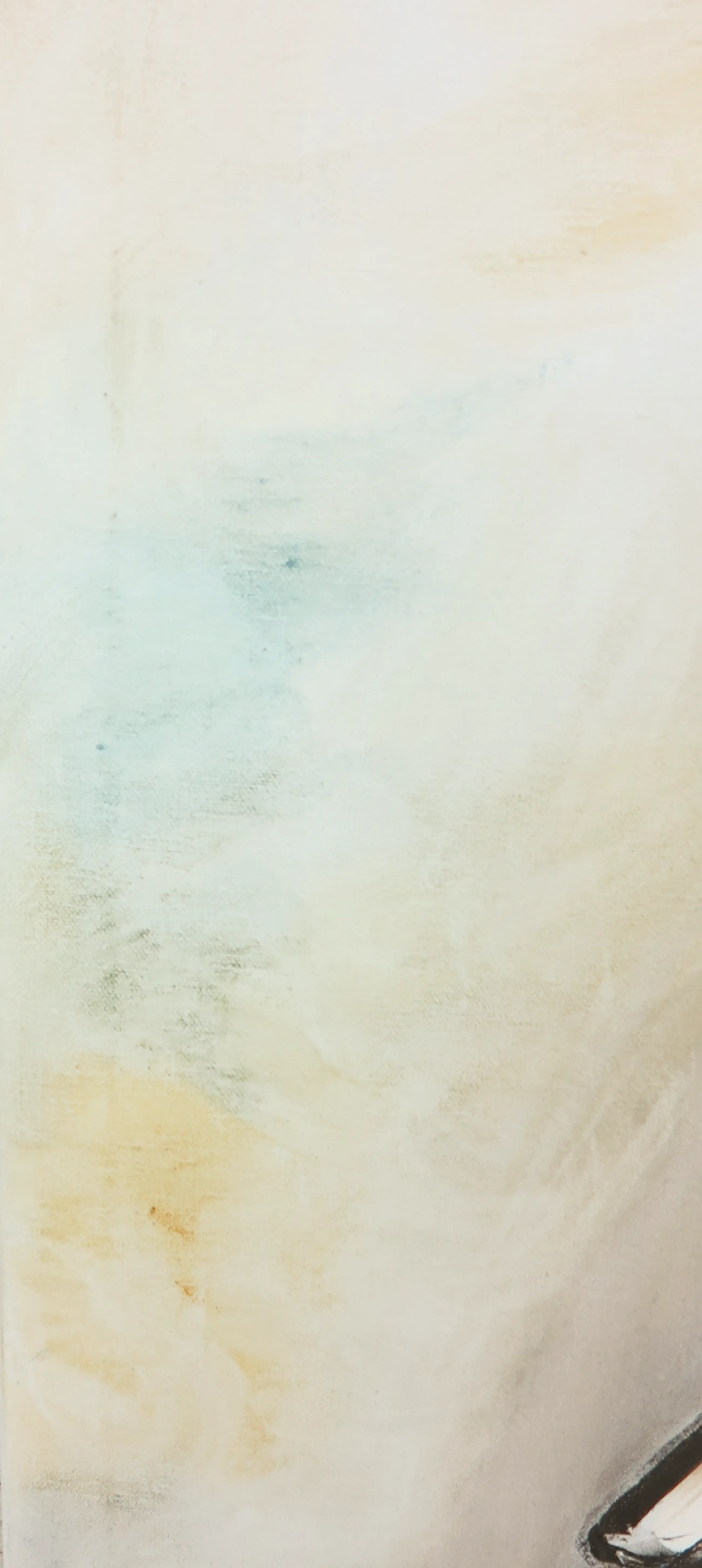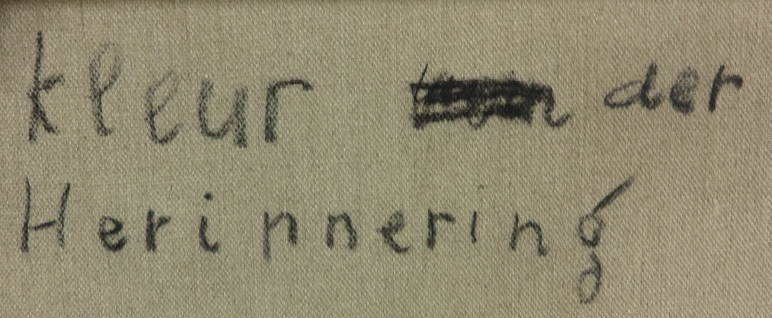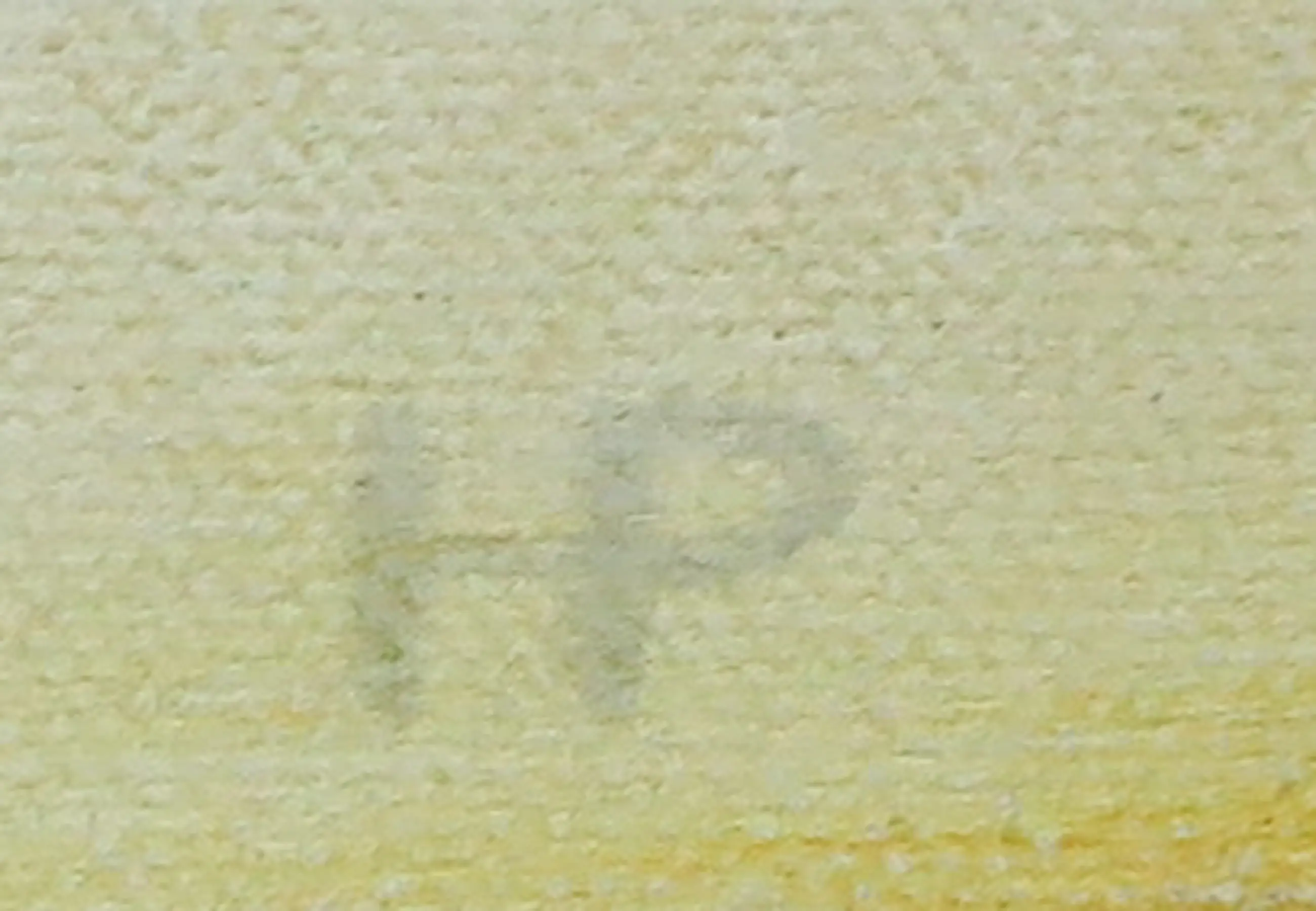 | Een lichte veeg aan de linkerzijde van de compositie en wat kleine vlekjes links bovenin, naar alle waarschijnlijkheid zijn deze onderdeel van compositie. Zie hiervoor de detailfoto's. | |