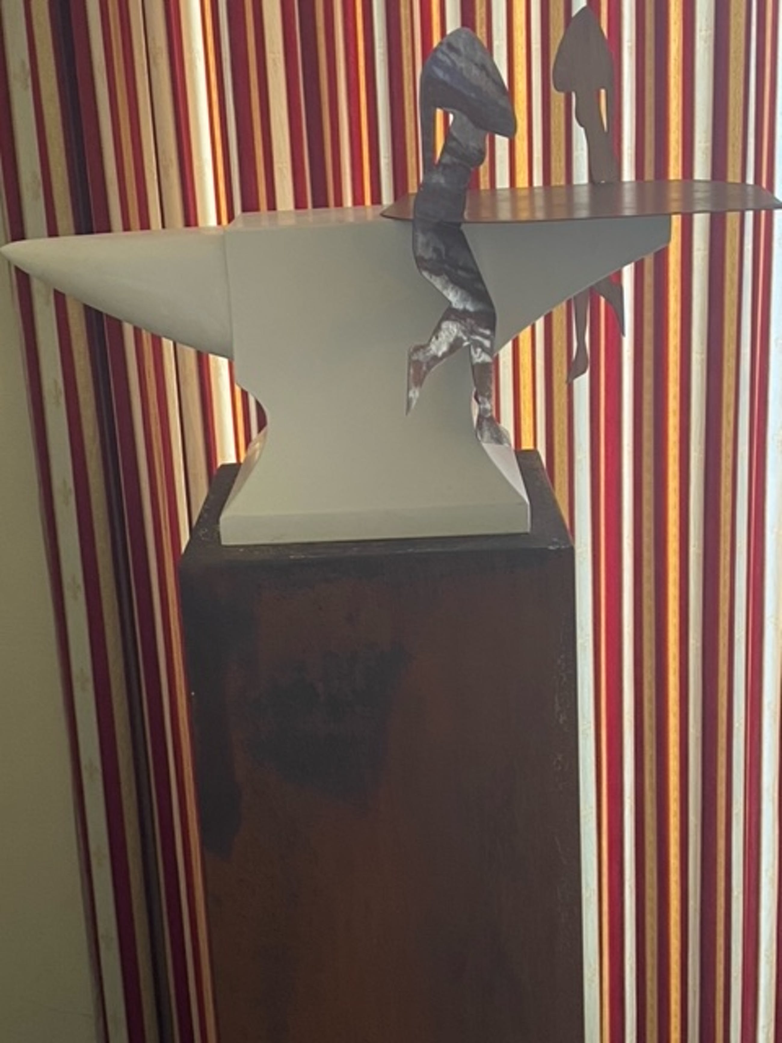 IJzeren plaatstalen figuren balanceren op een gipsen Aambeeld.