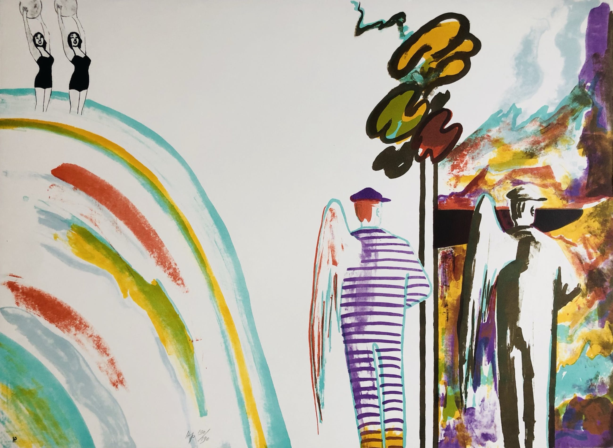 Fraaie kleurrijke litho van Hannes Postma uit 1975. Met potlood gesigneerd, gedateerd, en genummerd (190/190).