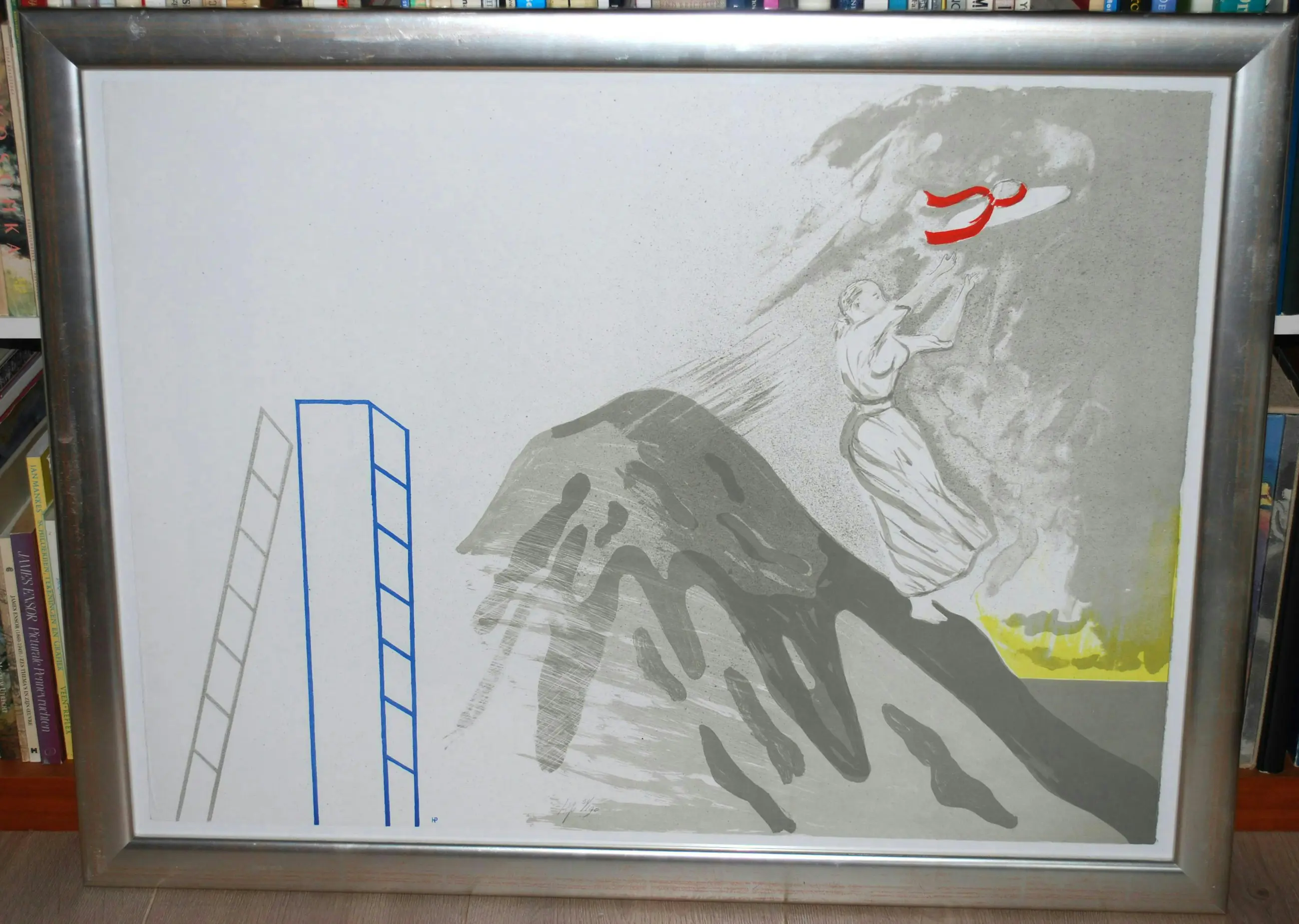 Bladmaat 57x77 cm, licht geplaatst op karton ( met 4 plakkers). Het blad is helder en niet vergeeld. Achter glas in een mooie kwaliteit houten lijst.