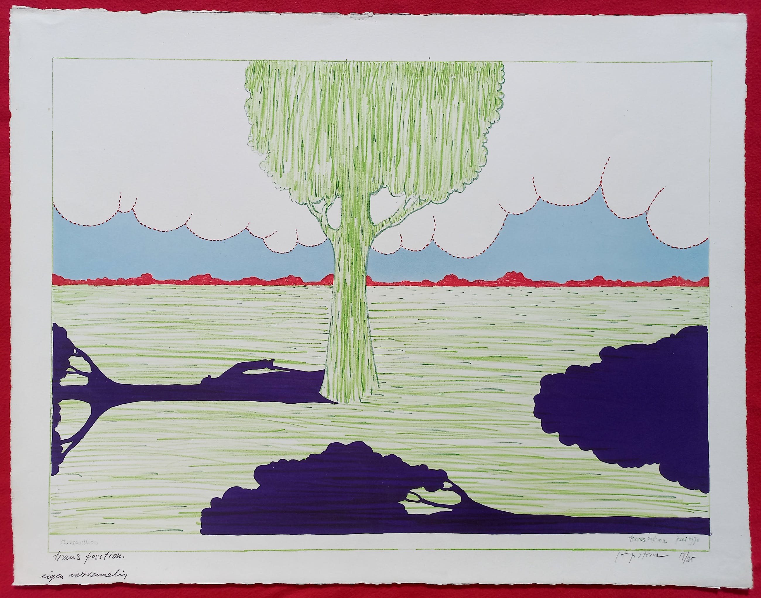 Karakteristiek, surrealistisch werk van Hannes Postma. Litho op geschept papier, met potlood gesigneerd, genummerd (17/25), getiteld en voorzien van aantekening “eigen verzameling” en in de plaat gesigneerd en getiteld en ook gedateerd (juni 1970). In zeer goede conditie. Afkomstig uit Hannes Postma’s eigen verzameling.