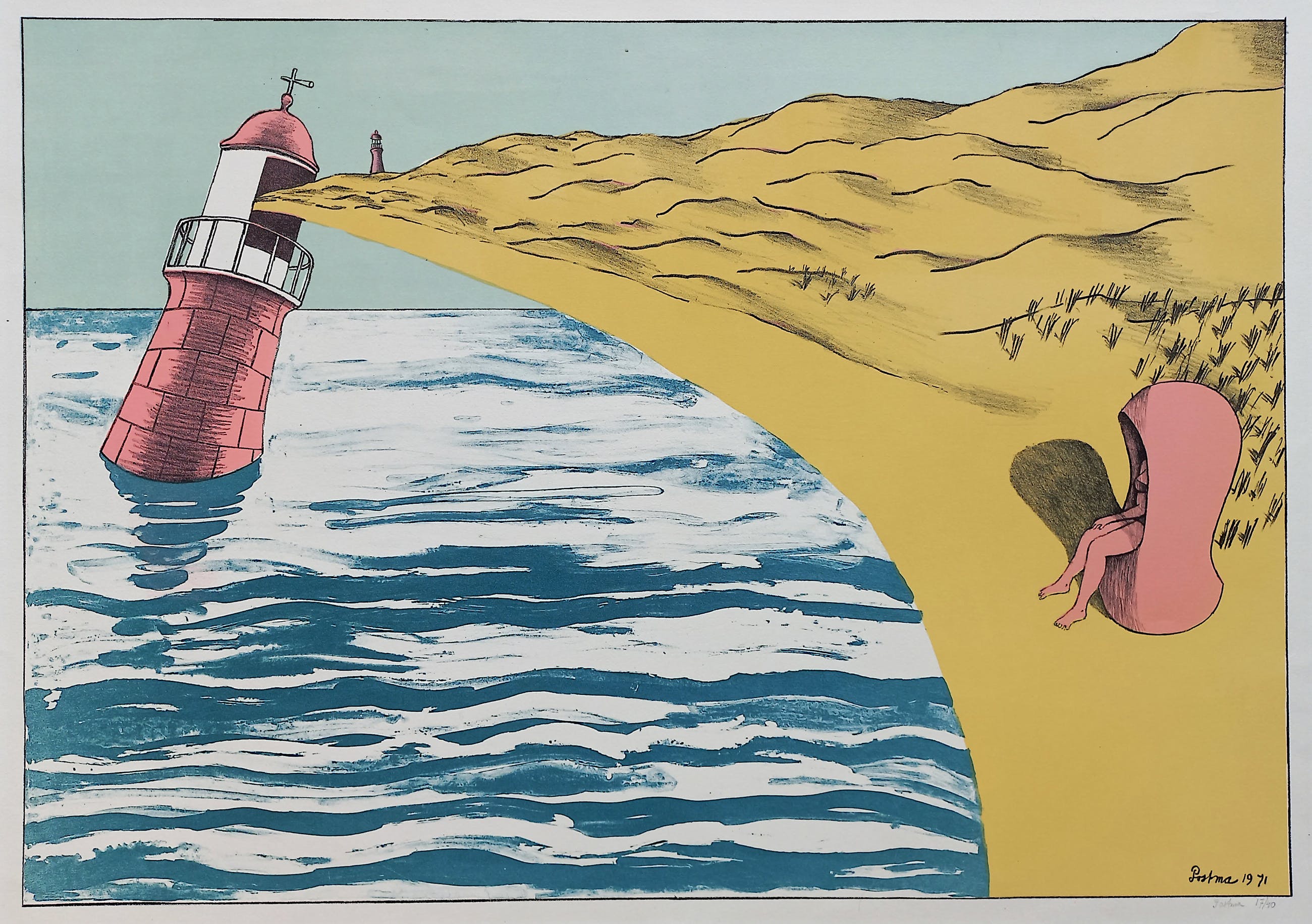 Fantastisch werk van Hannes Postma, uit zijn “vuurtoren periode”. Litho op geschept papier, met potlood gesigneerd en genummerd (17/40), met aantekening in stift “eigen verzameling”, en in de plaat gesigneerd en gedateerd (1971). In zeer goede conditie. Afkomstig uit Hannes Postma’s eigen verzameling.