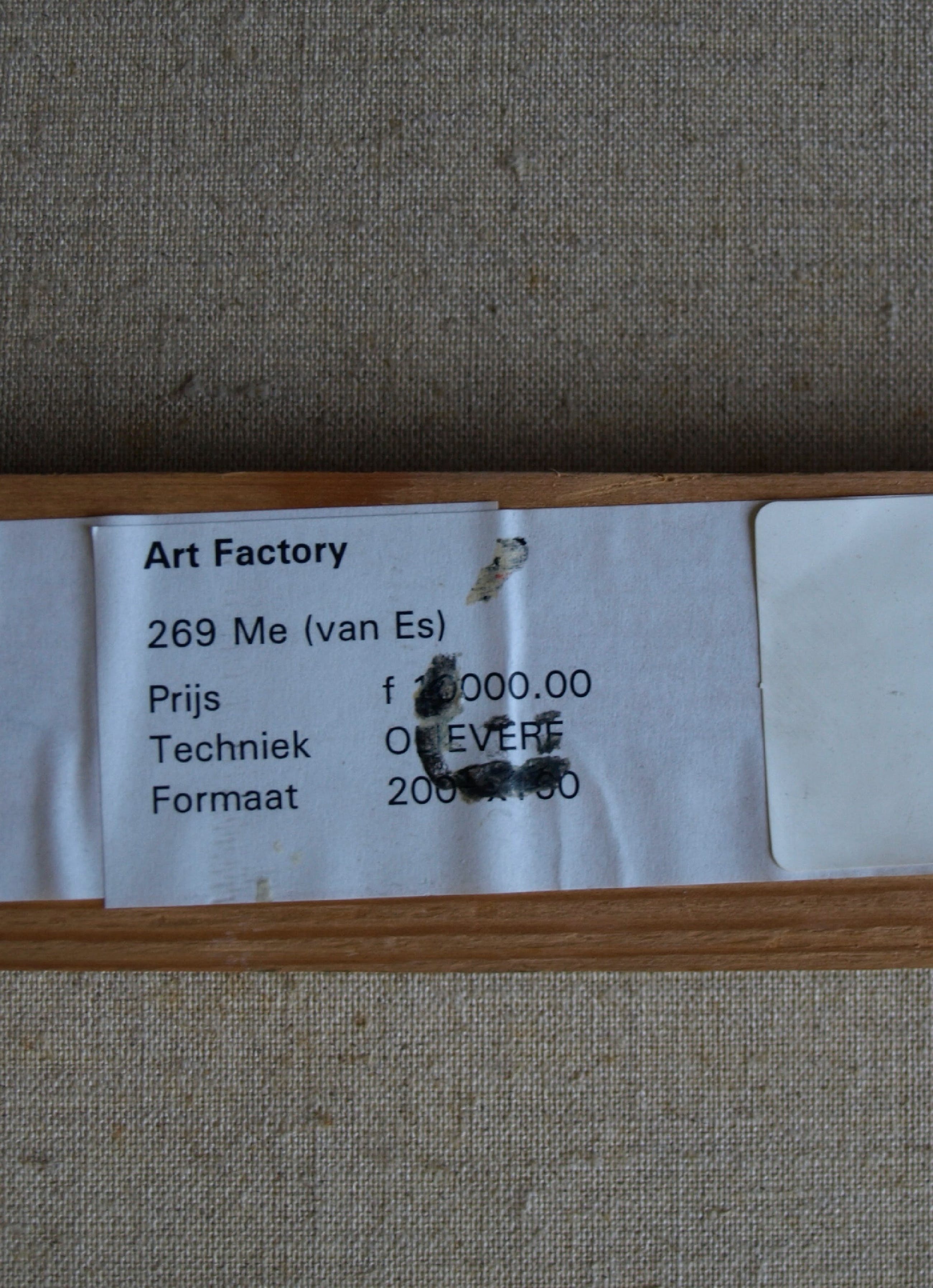-Gesigneerd, getiteld en gedateerd op de achterkant van het doek. Ook met de galeriesticker met de oorspronkelijke prijs: Fl 10.000,-.
