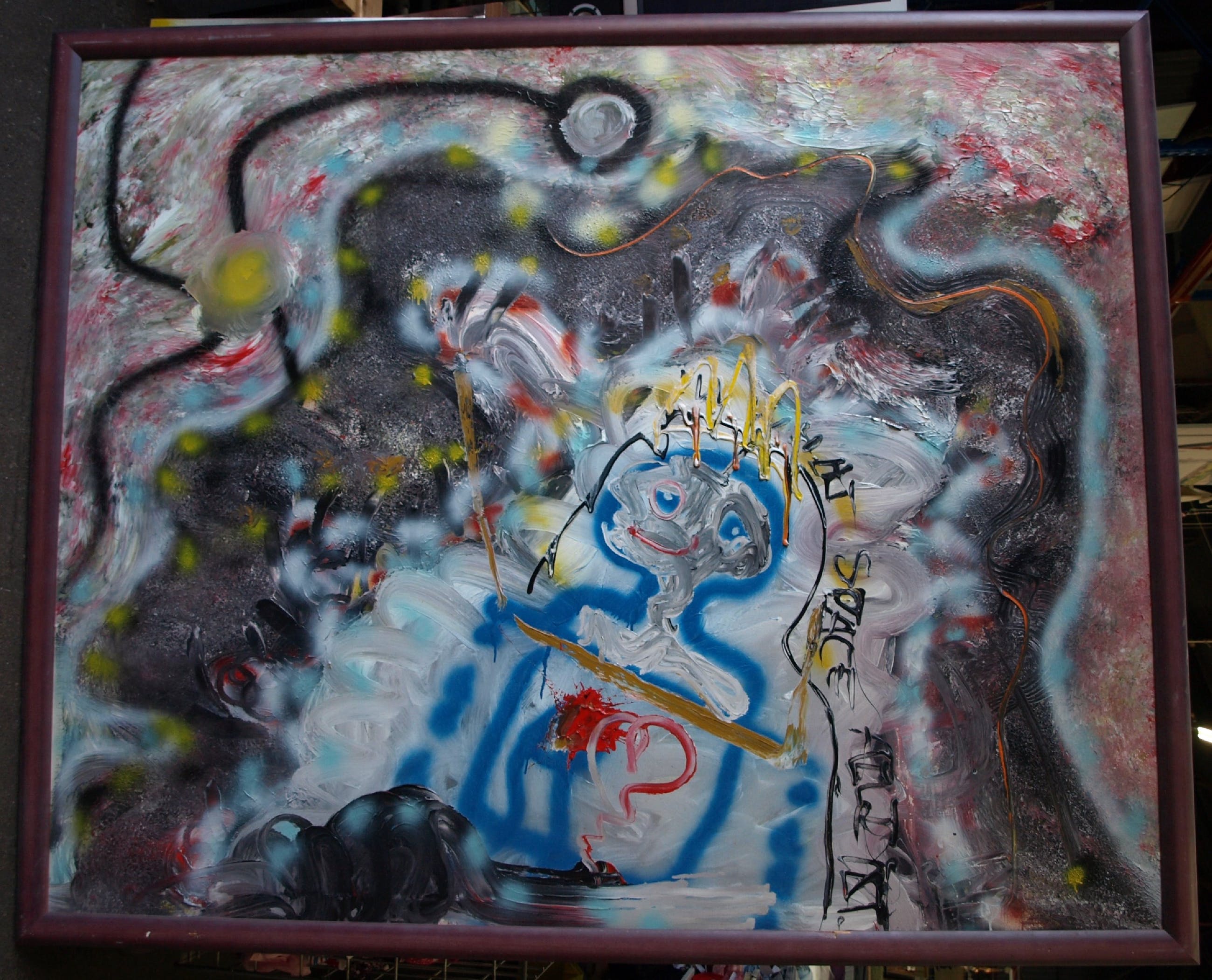 Een zeer groot (ingelijst, 170 x 210 cm) schilderij uit 1987 van de Nederlandse kunstenaar Hannes van Es (1950-2002).