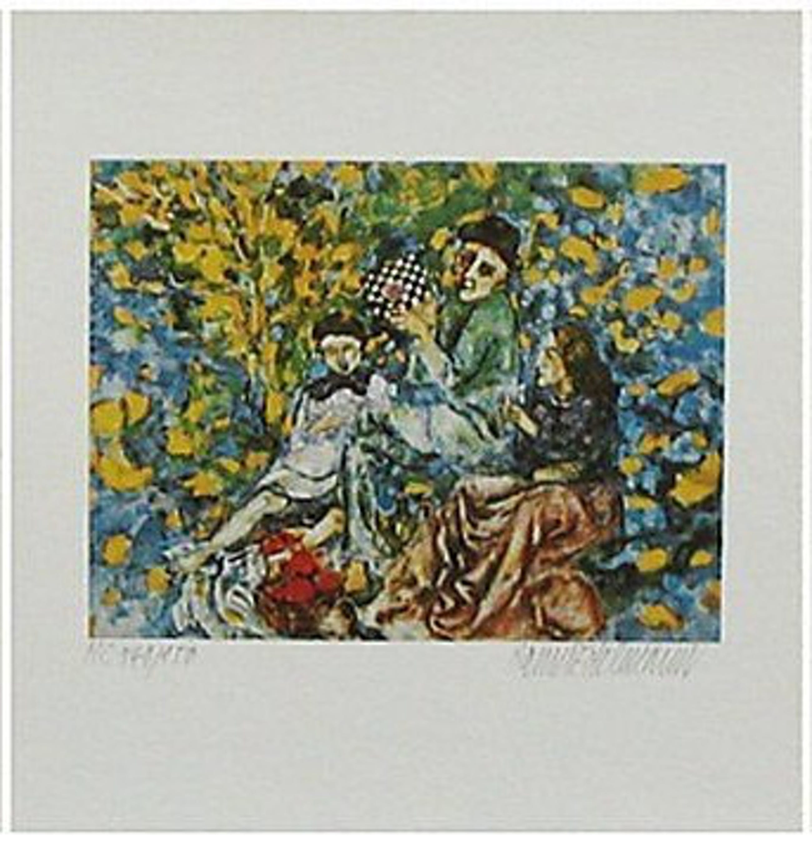 Twee fraaie handgesigneerde lithografien van Hanno Edelmann. Titels: Familie I en II. Afmetingen: 15 x 14 cm.