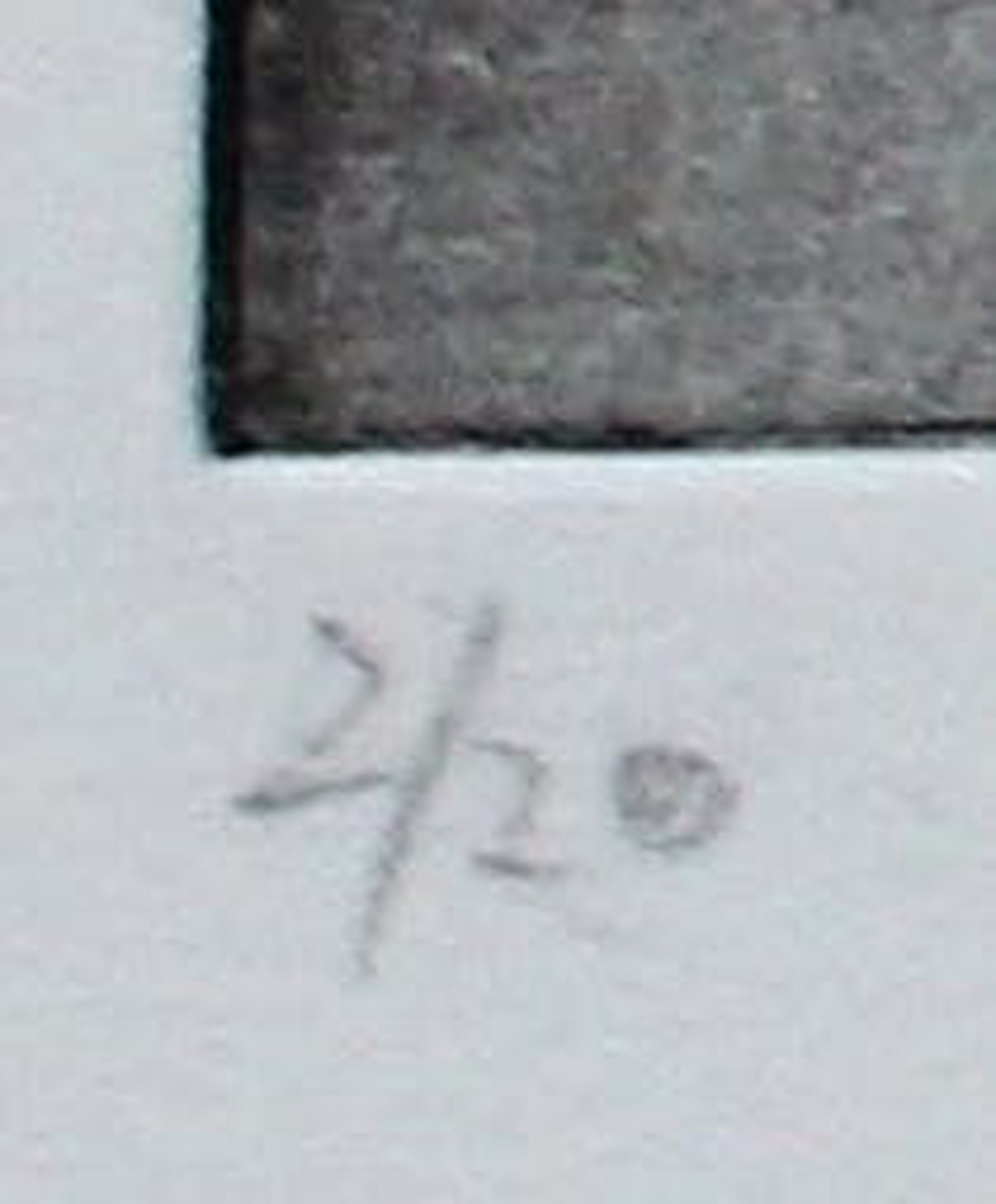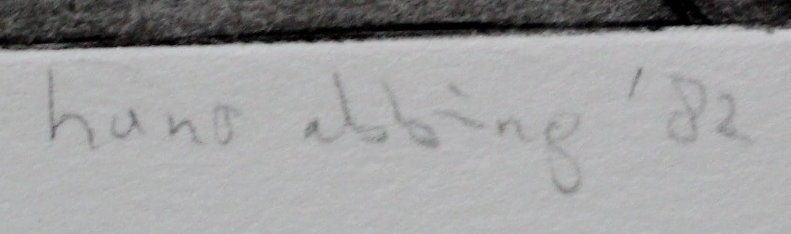 Ets van Hans Abbing uit 1982. Nummer: 2/20. Afmetingen blad: H32 x b43.5cm. Afmetingen voorstelling: H25.5 x b29.5cm. Het werk is rechts onderaan, met potlood, gesigneerd en gedateerd door de kunstenaar. De authenticiteit van het aangeboden werk wordt volledig gegarandeerd. Een certificaat van echtheid kan, op aanvraag, worden gegarandeerd.