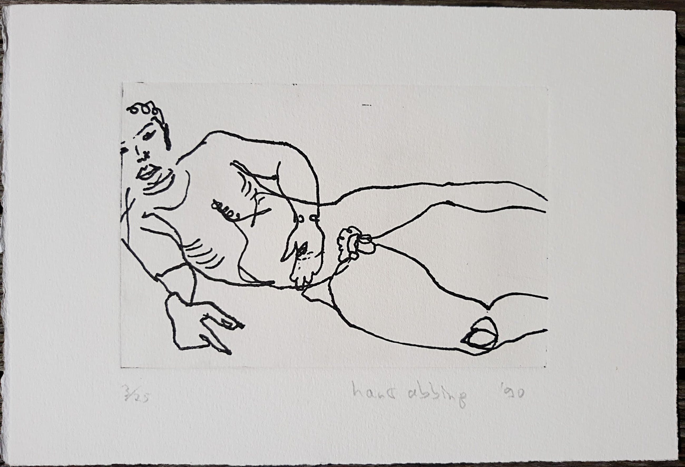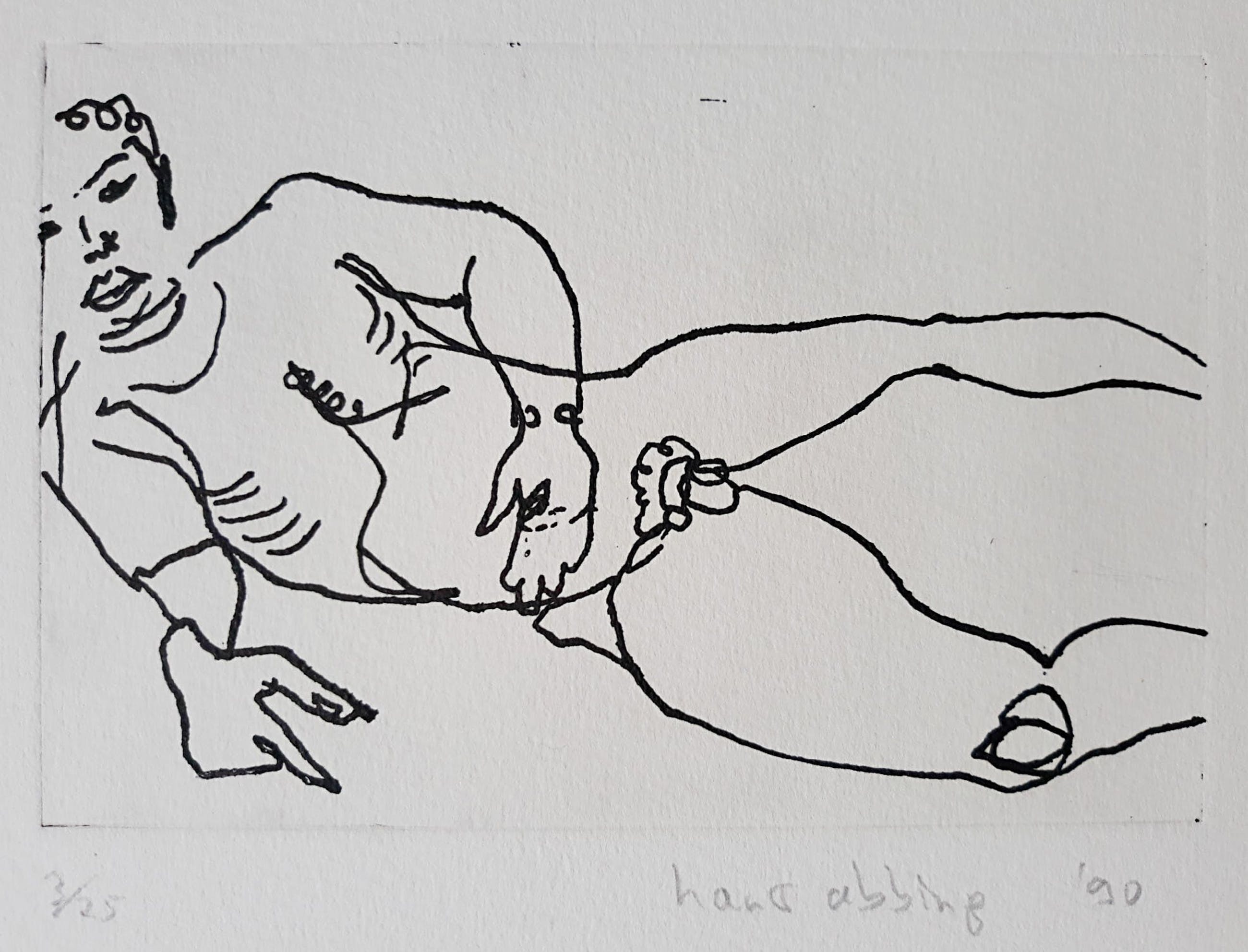 Karakteristiek werk van Hans Abbing. Droge naald ets op geschept papier, met potlood gesigneerd, gedateerd (‘90) en genummerd (3/25). In mint conditie.