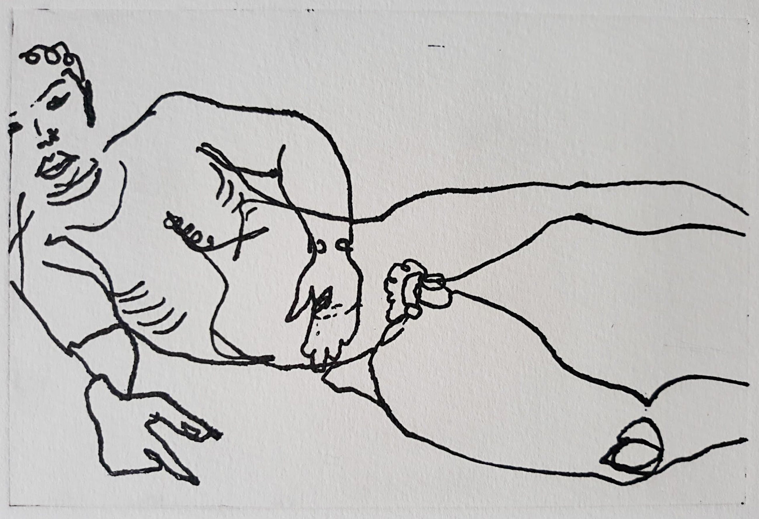 Karakteristiek werk van Hans Abbing. Droge naald ets op geschept papier, met potlood gesigneerd, gedateerd (‘90) en genummerd (3/25).