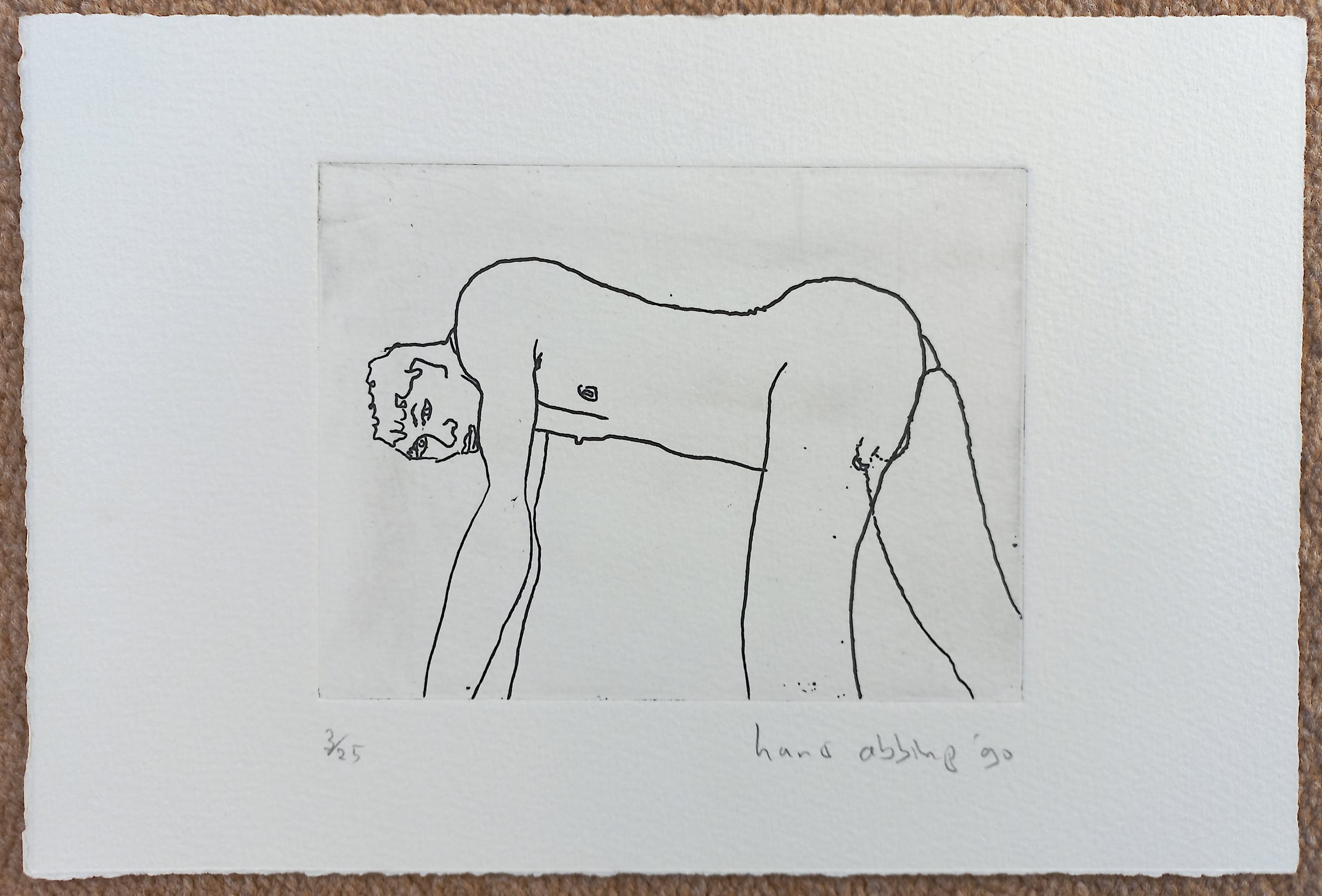 Karakteristiek werk van Hans Abbing. Droge naald ets op geschept papier, met potlood gesigneerd, gedateerd (‘90) en genummerd (3/25). In mint conditie.