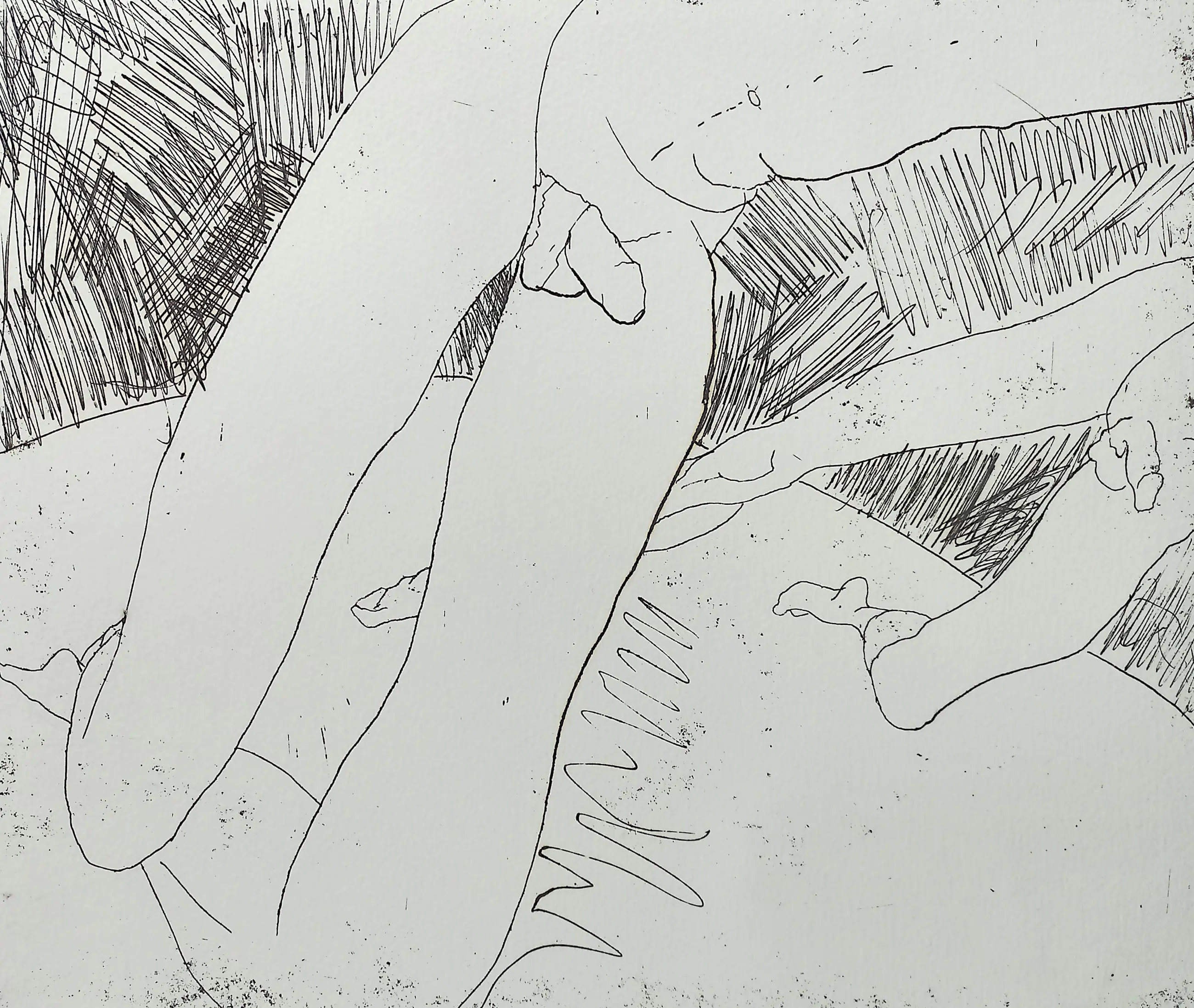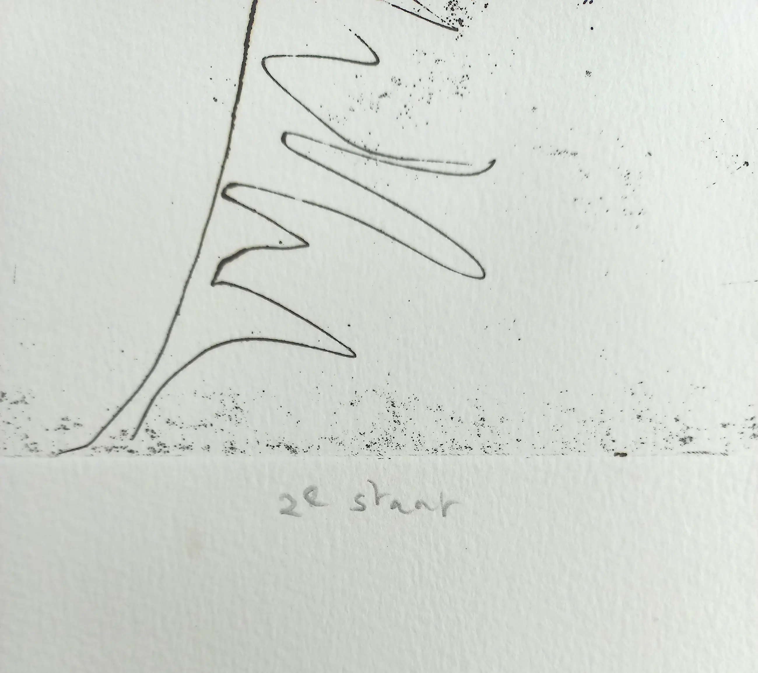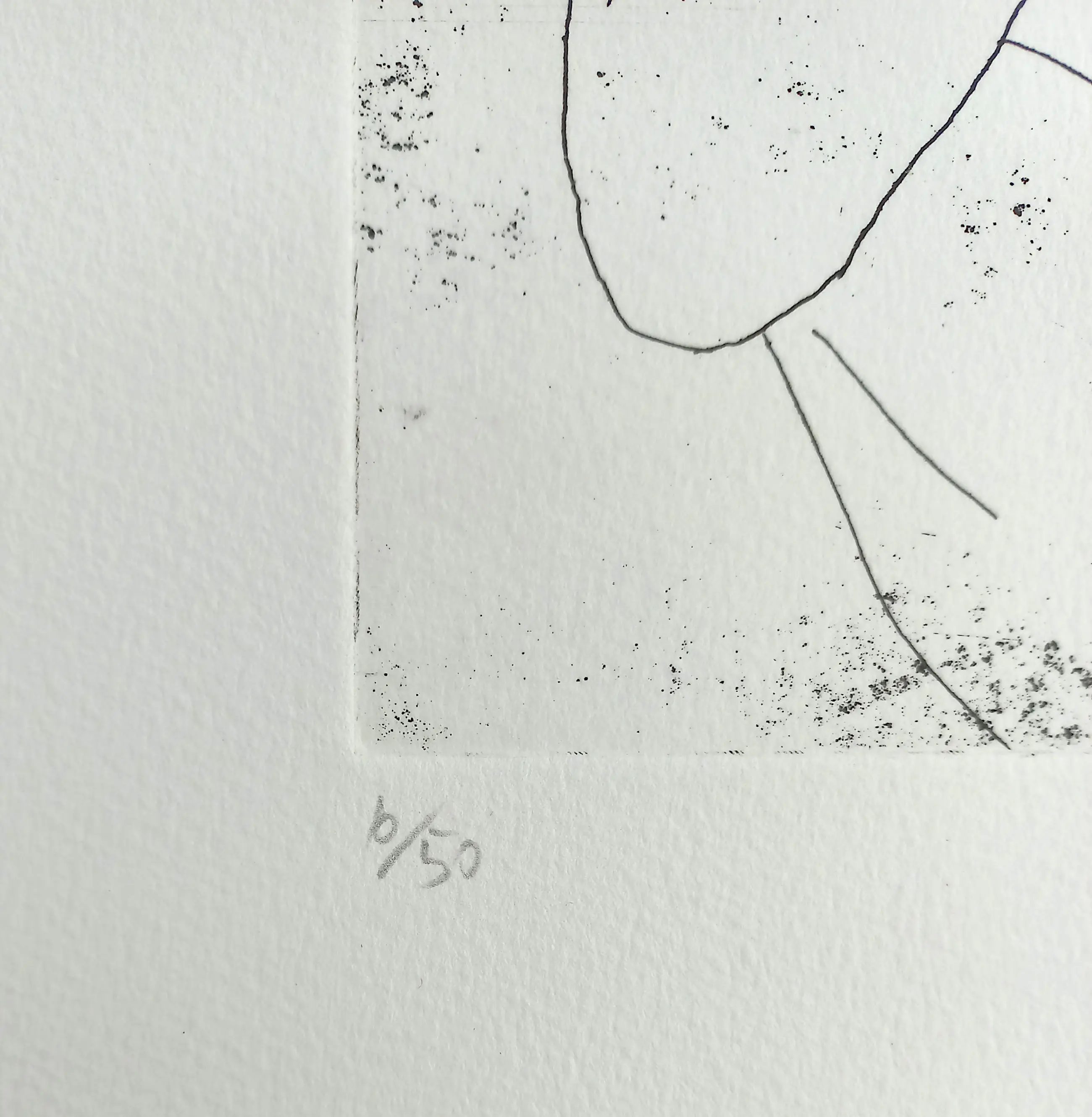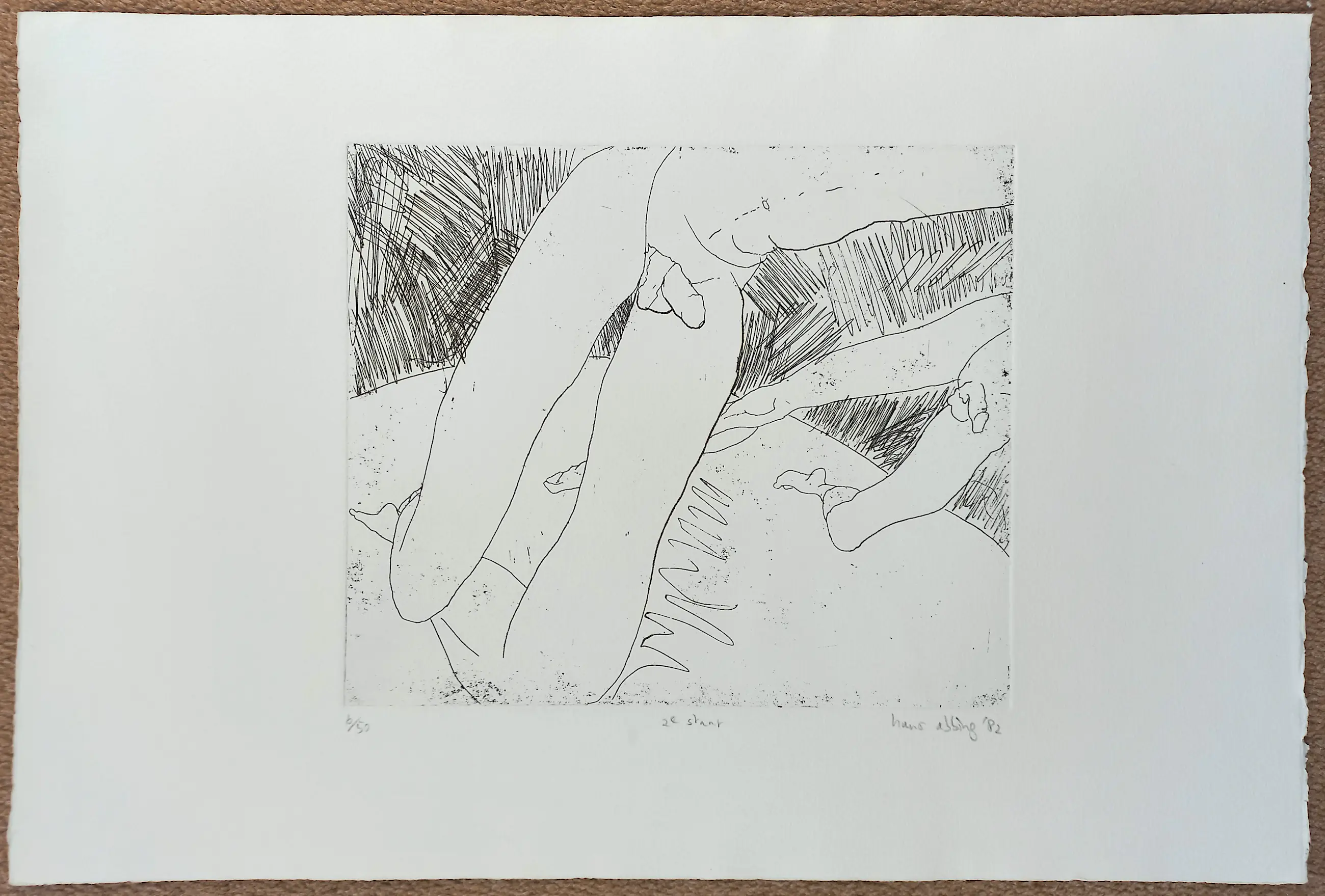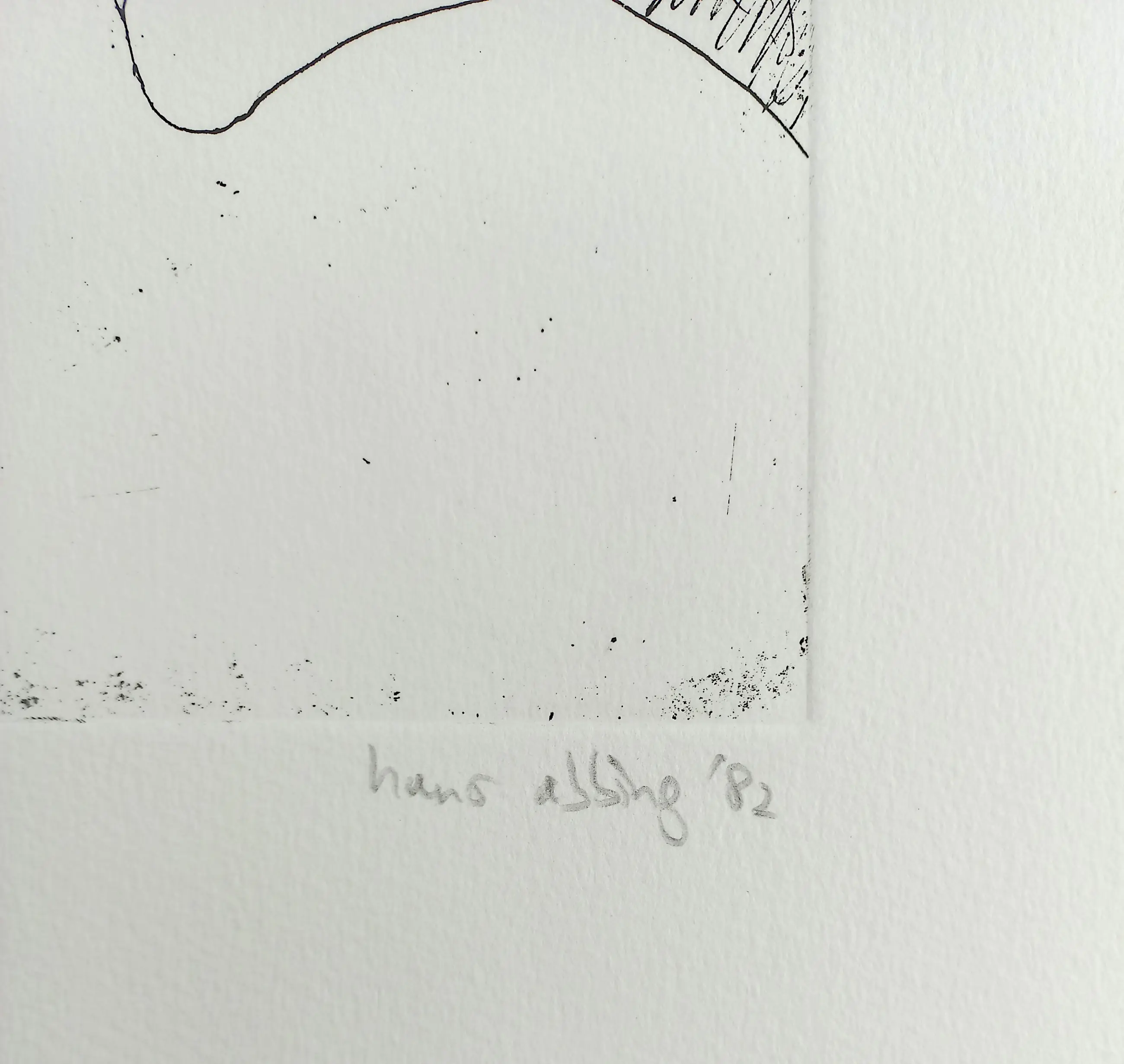 Karakteristiek grafisch werk van Hans Abbing. Droge naald ets op geschept papier, met potlood gesigneerd, gedateerd (‘82) en genummerd (6/50). In zeer goede conditie.