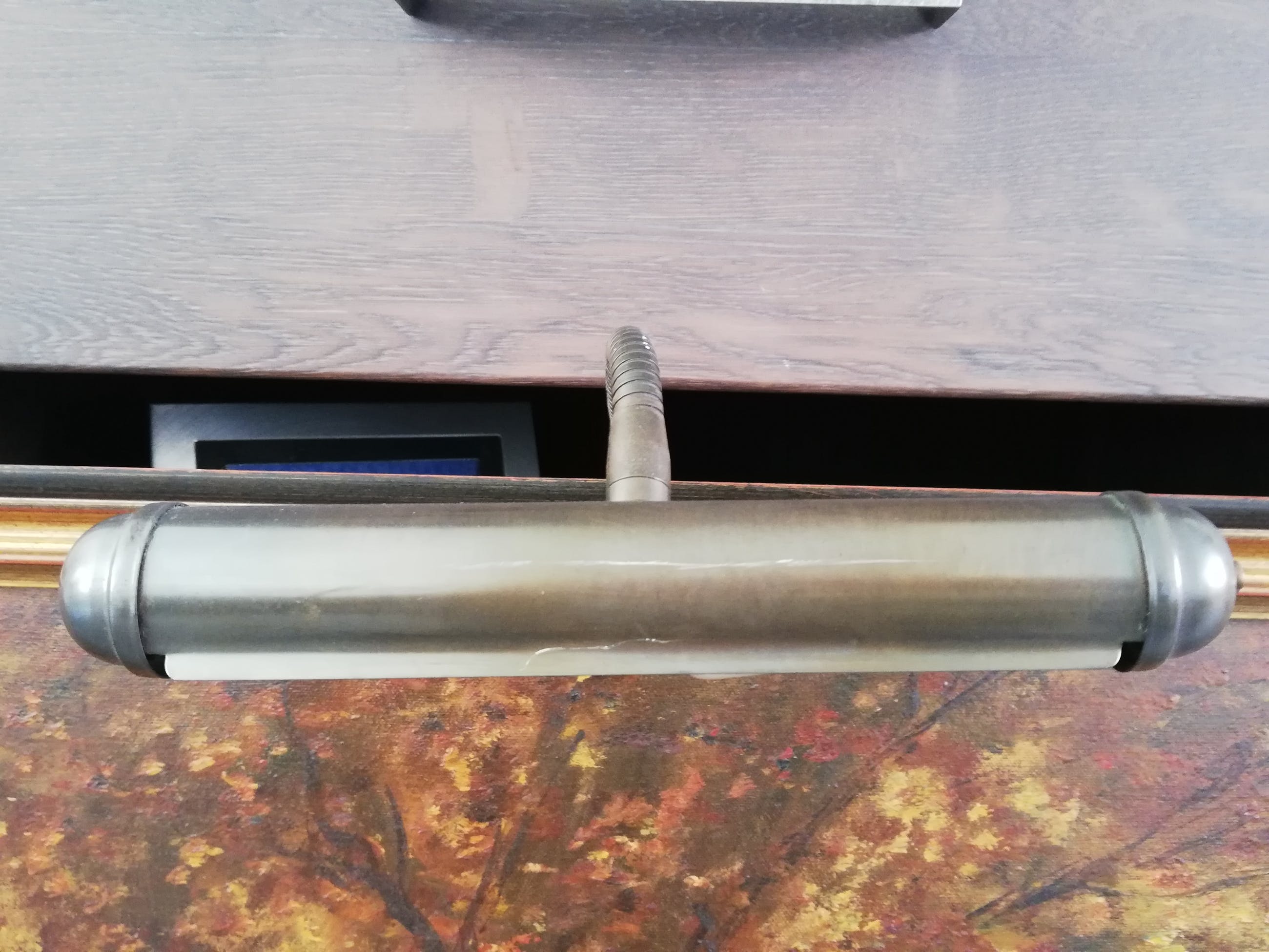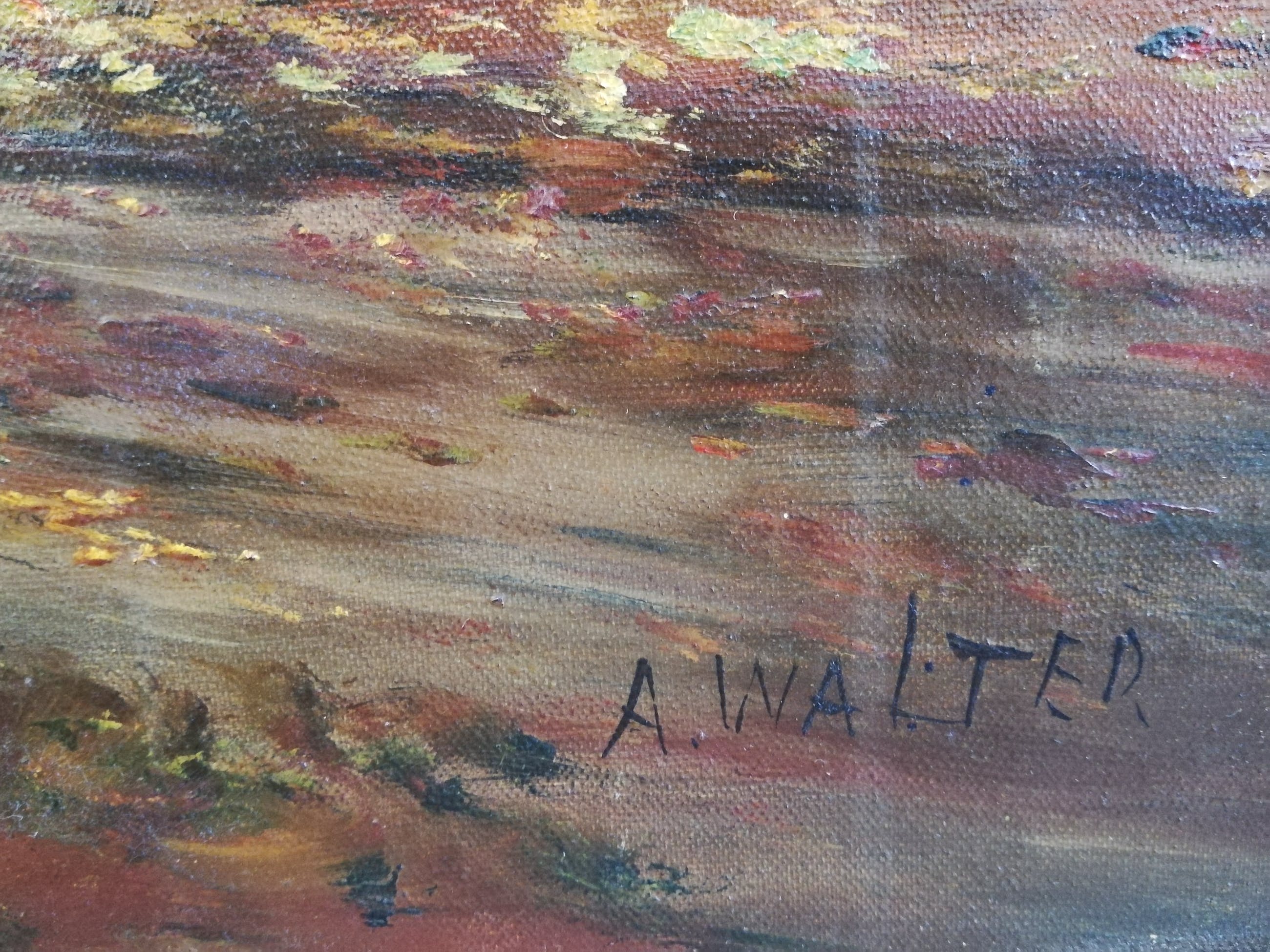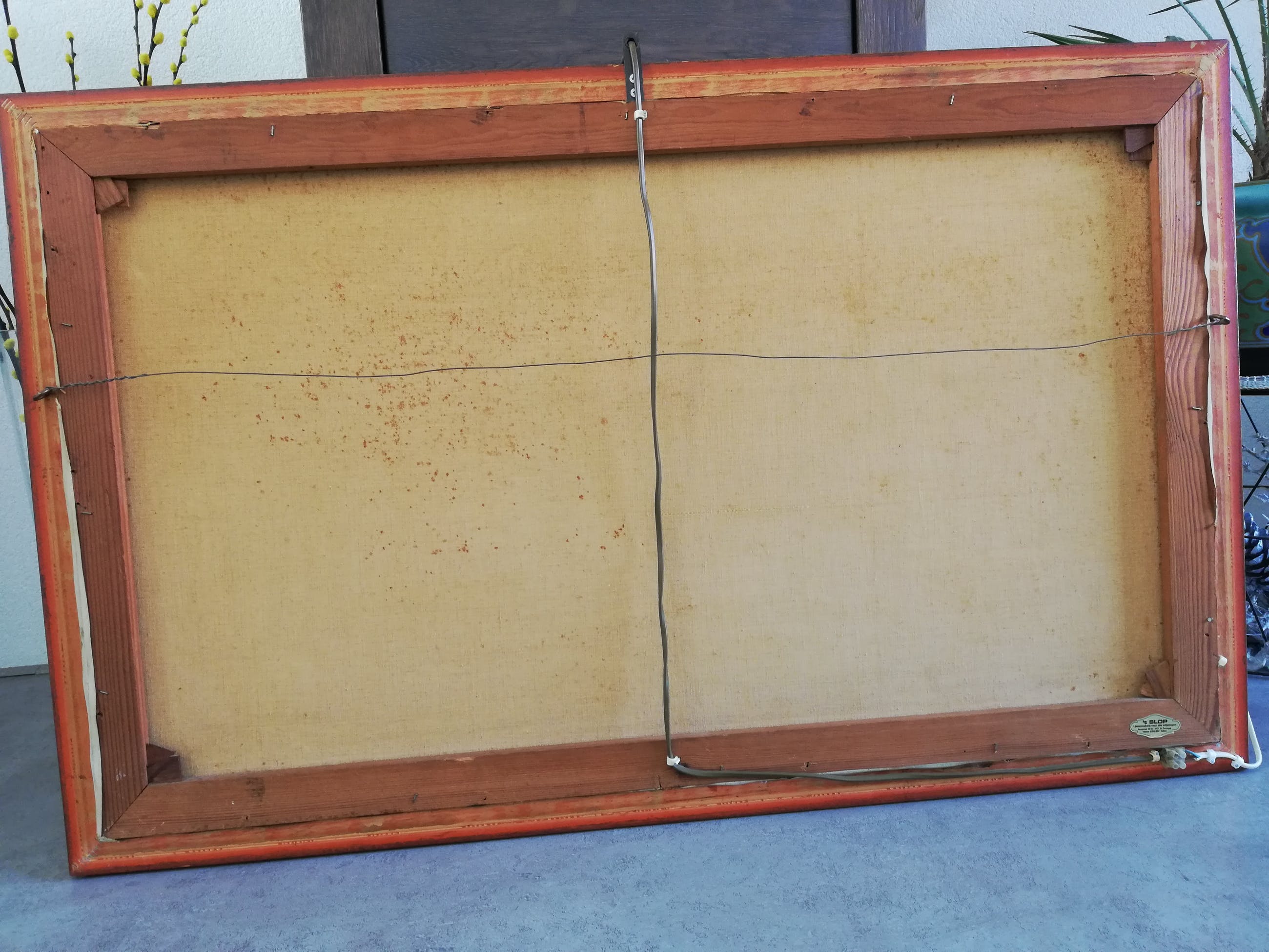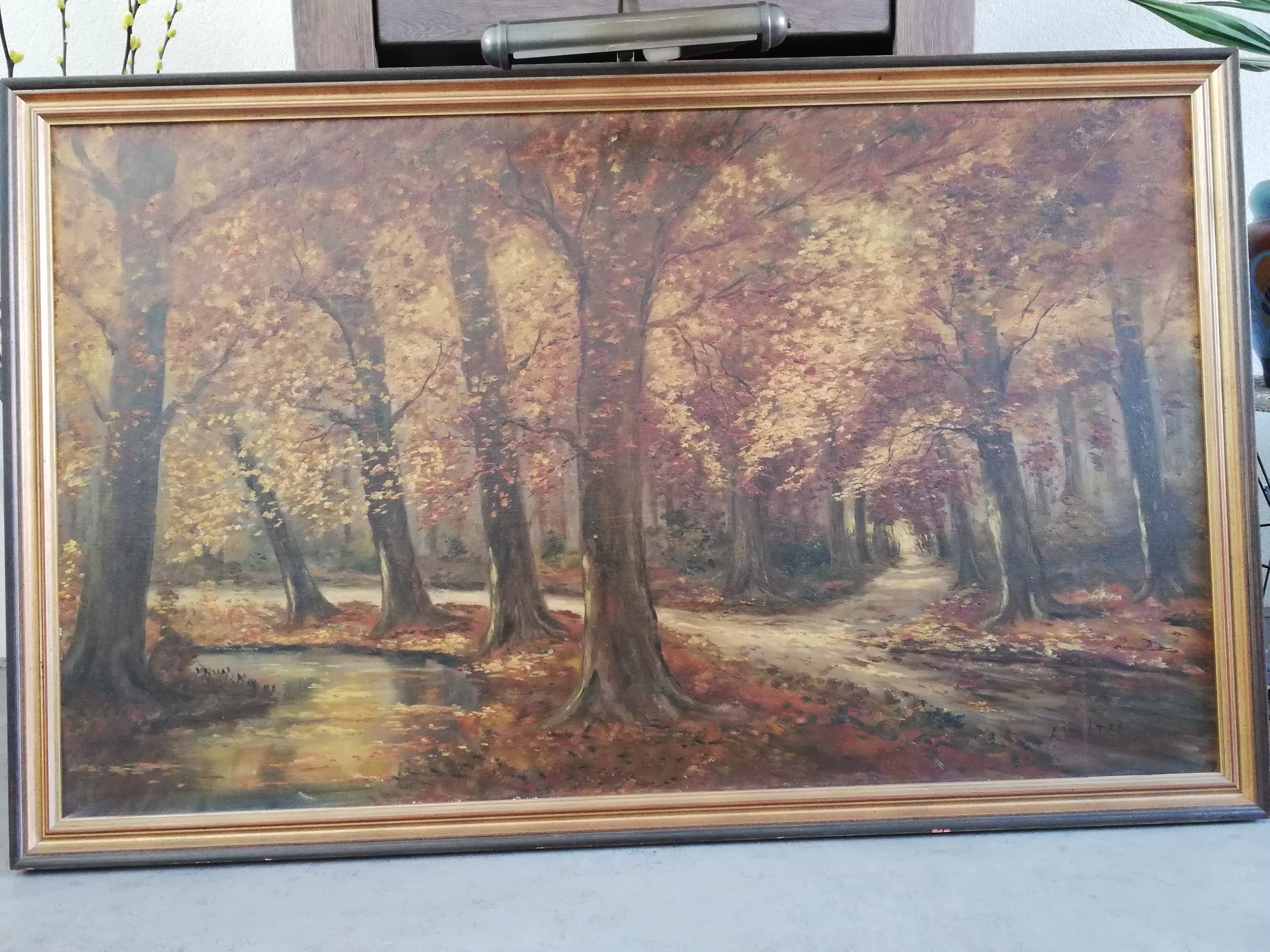 Compositie bosgezicht. Canvasdoek met goudkleurige lijst. Doek is in goede staat. Verlichting boven aan de lijst aanwezig.