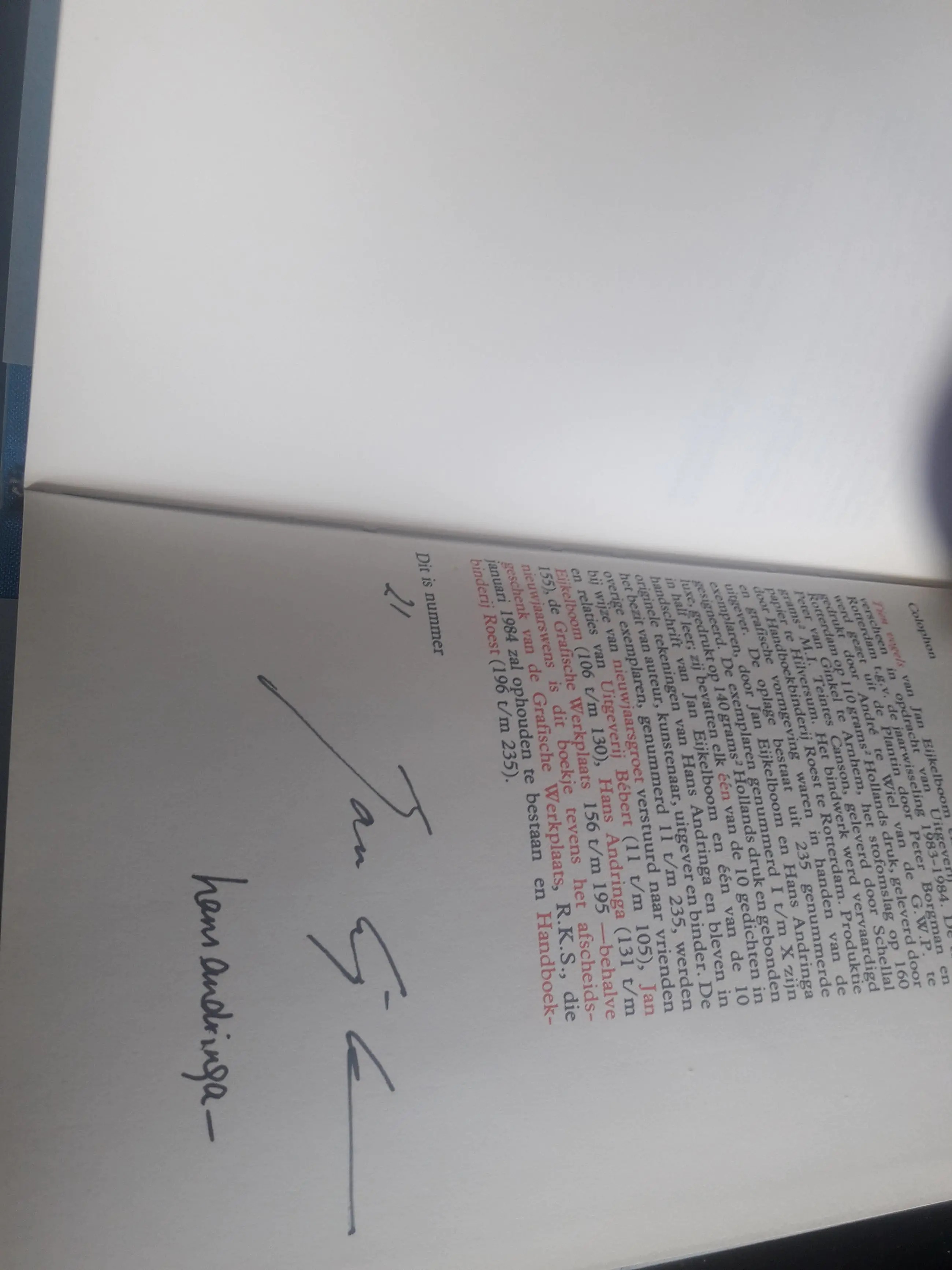 Hans Andringa - J. Eijkelboom kunstenaarsboek Oplage; 235 exemplaren Dit is nummer 21 Teksten J. Eijkelboom tekeningen: Hans Andringa Uitgever; Bebert, Rotterdam Gesigneerd met de hand door beide kunstenaars