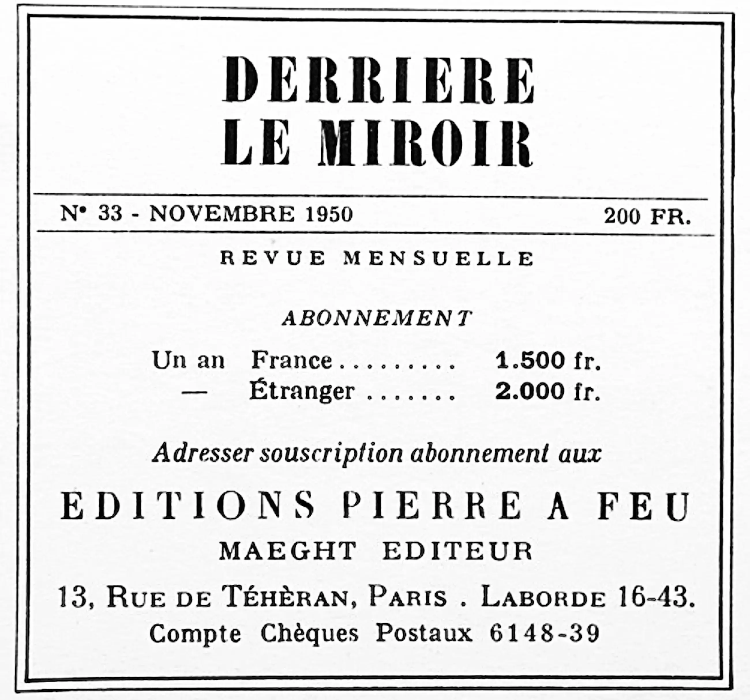 “Derrière le Miroir” (DLM) werd uitgegeven door het Parijse uitgeversduo Maeght en verscheen in totaal 201 nummers tussen 1946 en 1982. Deze kunstenaarseditie is vandaag de dag een belangrijk historisch document over de naoorlogse kunst. Kenmerkend voor de edities zijn de originele prenten – lithografieën, etsen, zeefdrukken of houtsneden – van gerenommeerde kunstenaars zoals Marc Chagall, Joan Miró, Georges Braque, Pablo Picasso en Hans Arp. De prenten werden grotendeels vervaardigd in de gerenommeerde drukkerij van Fernand Mourlot.