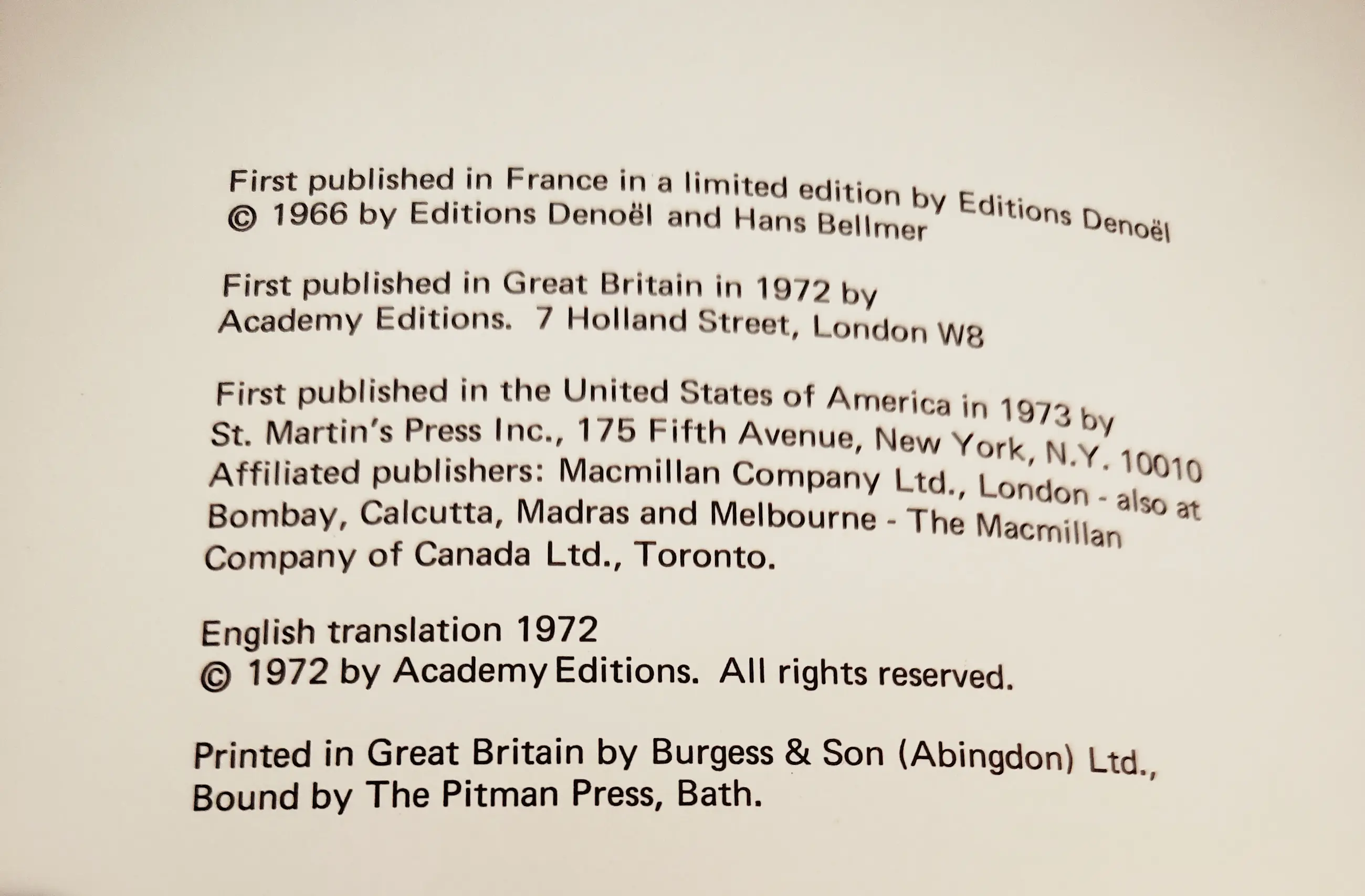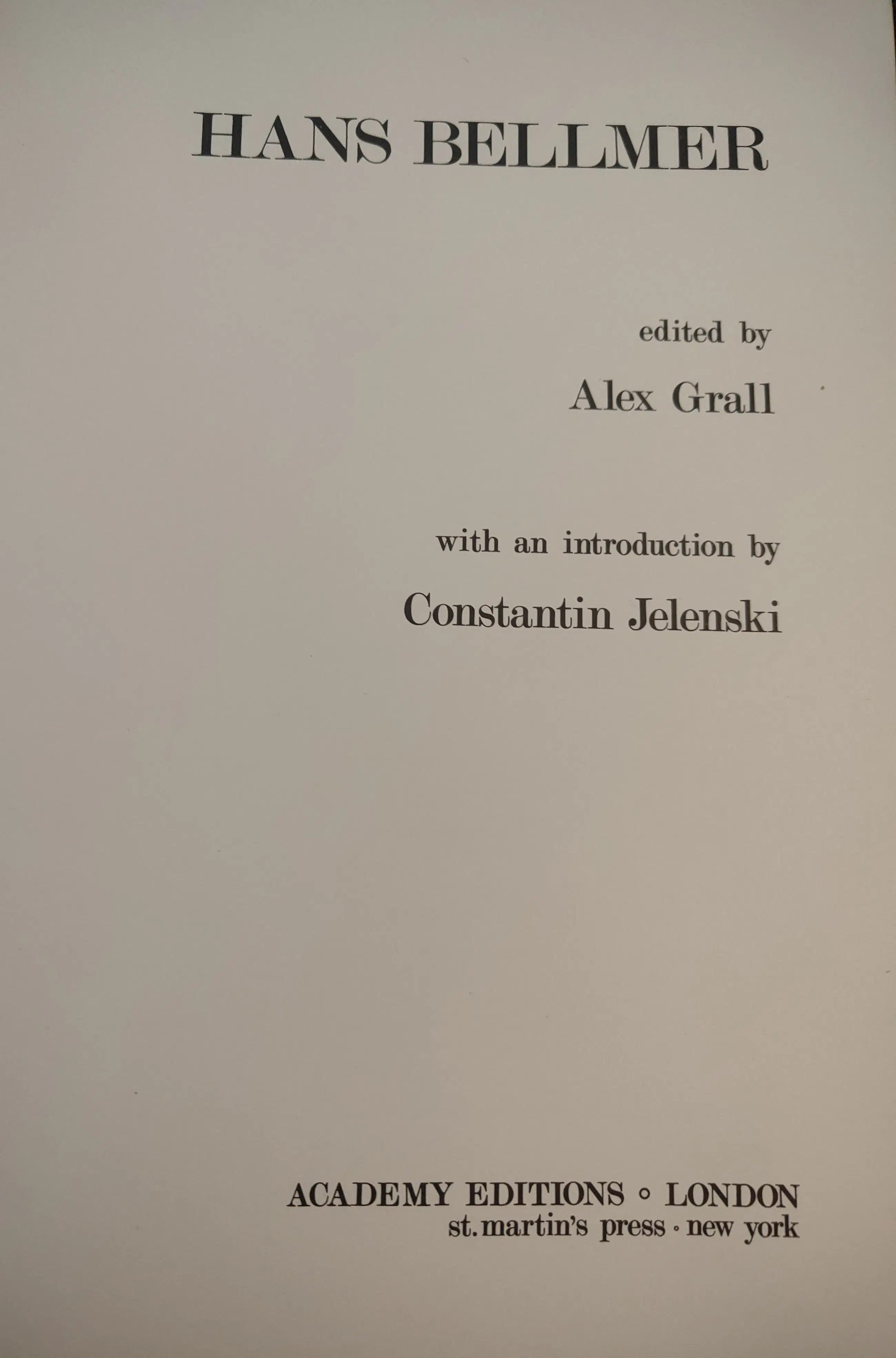 boek over het werk van de surrealistische kunstenaar Hans Bellmer. Het boek belicht zijn veelzijdige carrière als fotograaf, beeldhouwer en schilder, waarbij hij bekend werd om zijn erotische voorstellingen van het vrouwelijk lichaam. Onderwerp: De kunstenaar Hans Bellmer (1902-1975). Redactie: Alex Grall met een inleiding door Constantin Jelenski. Uitgevers: Academy Editions (Londen) en St. Martin's Press (New York)