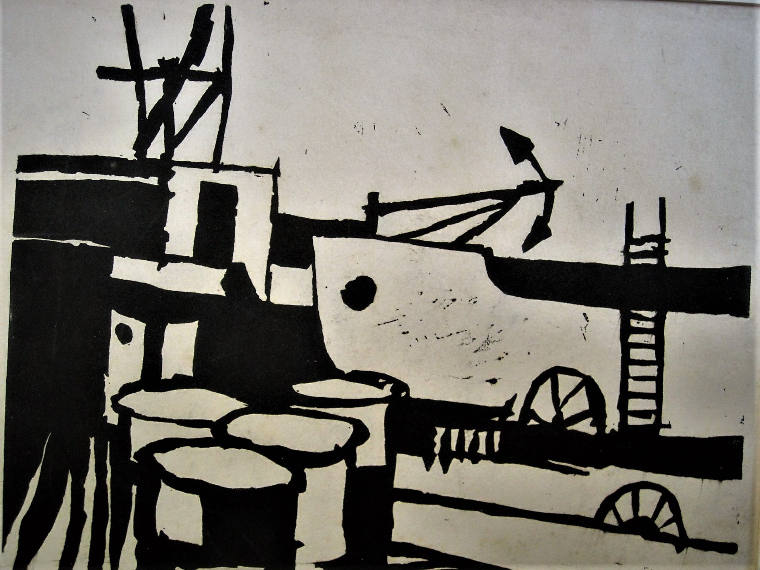 Hans Bernard - Jong gestorven Graficus - ZELDZAAM! - gesig. Linosnede "Haven scheepswerf" 1963 - Verkocht