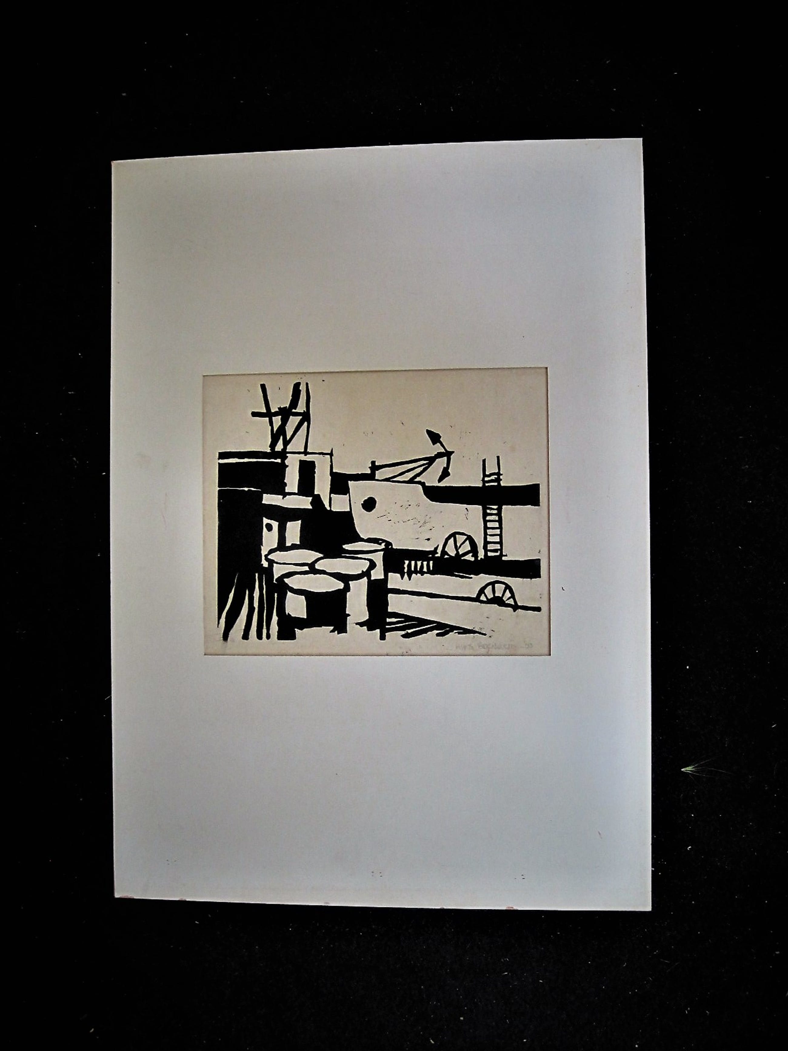 Hans Bernard - Jong gestorven Graficus - ZELDZAAM! - gesig. Linosnede "Haven scheepswerf" 1963 kopen? Bied vanaf 10!
