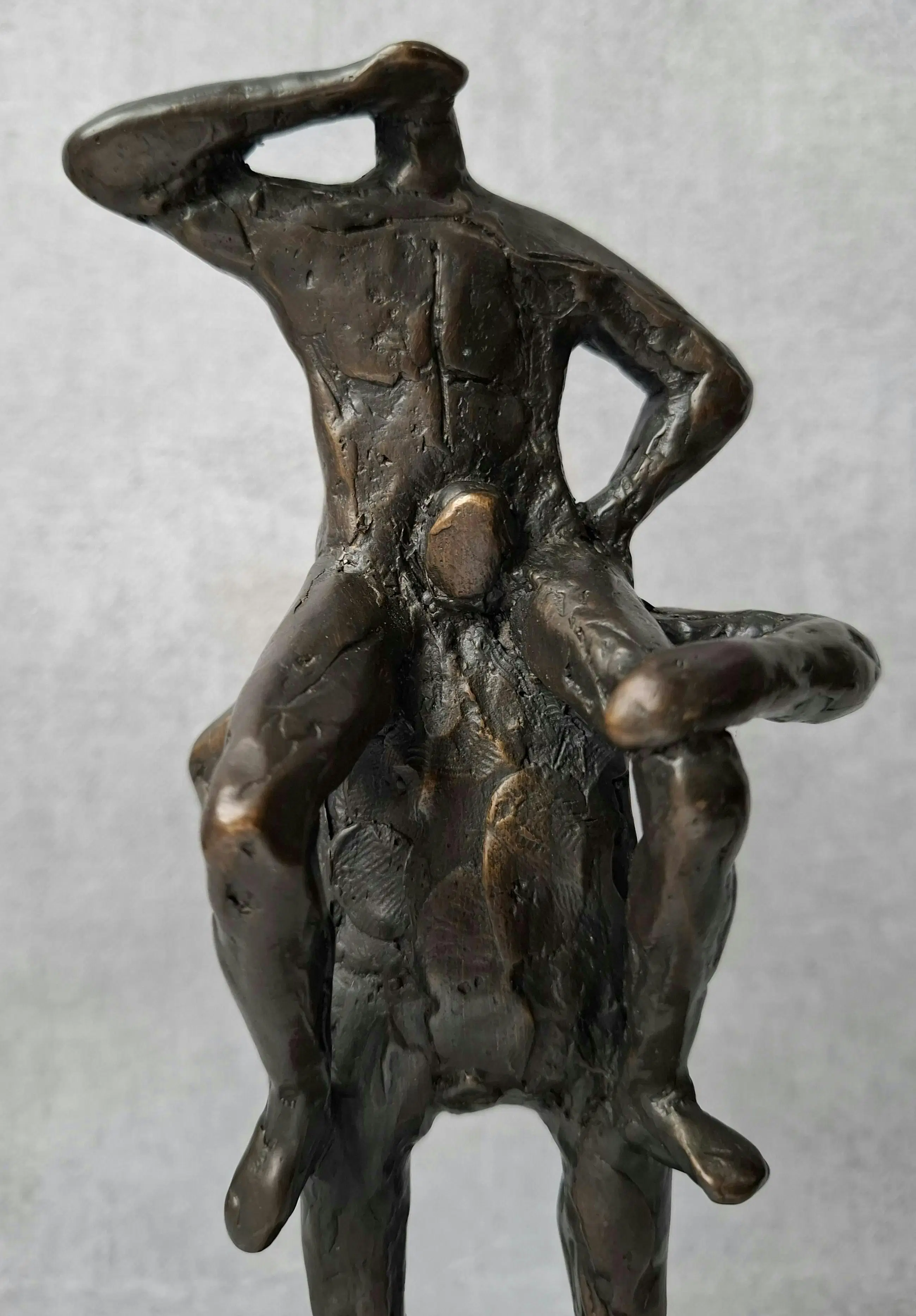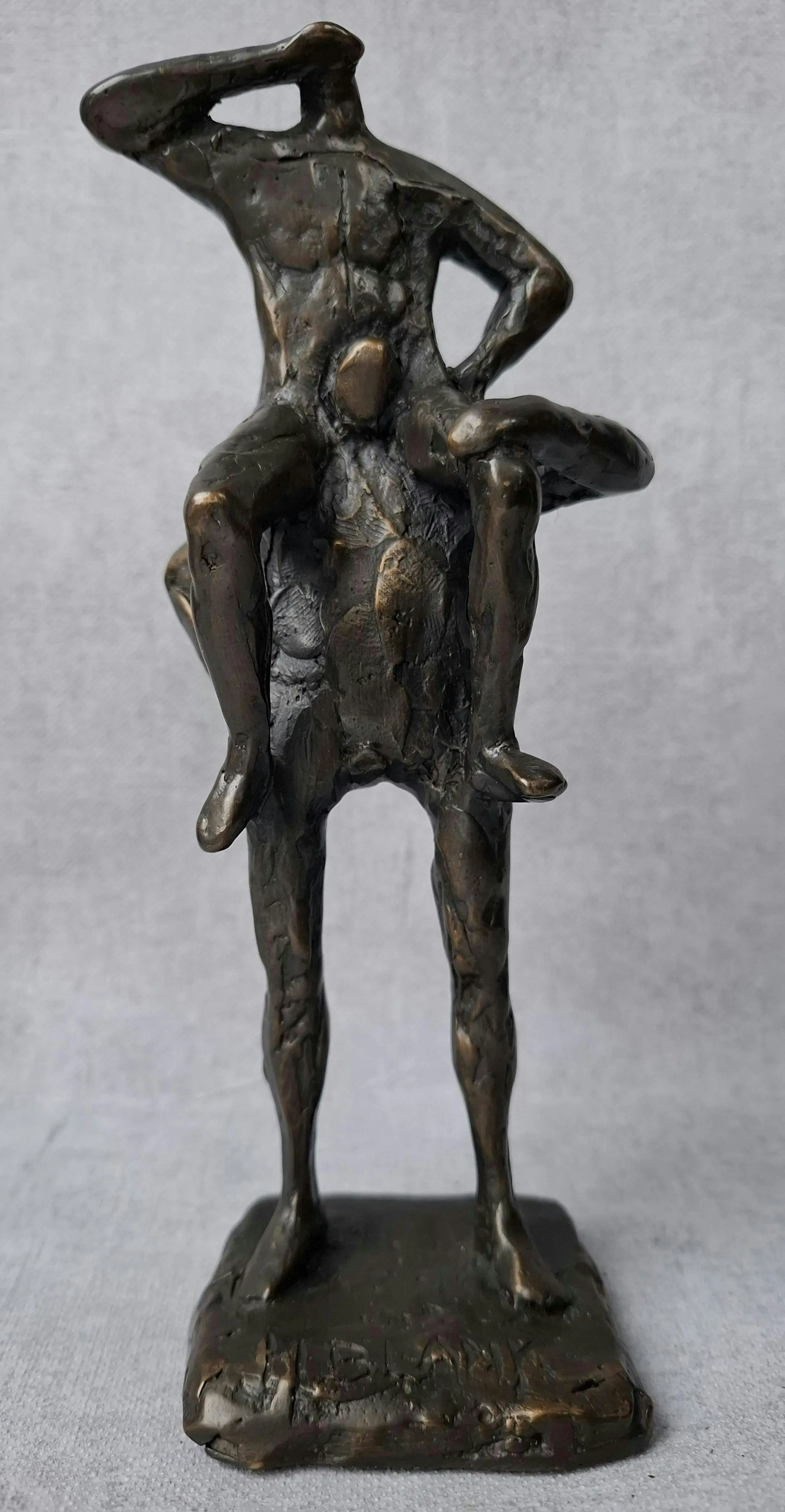 Horizon van Hans Blank Een bronzen beeld van twee mannen. De één zit bij de ander bovenop de schouders en kan zo net over de houten zeewering kijken richting ‘voormalige Zuiderzee’.