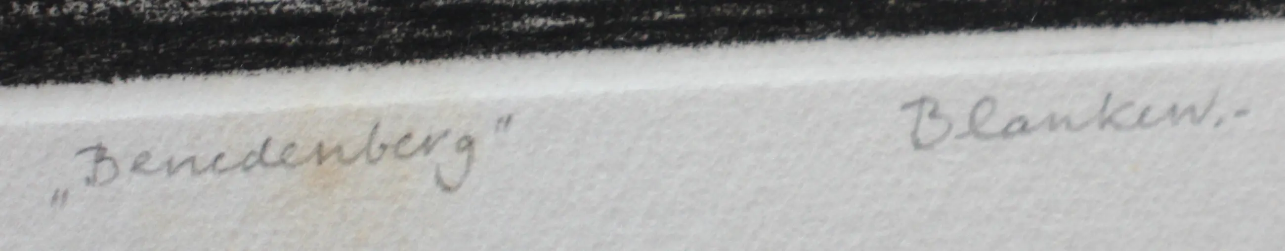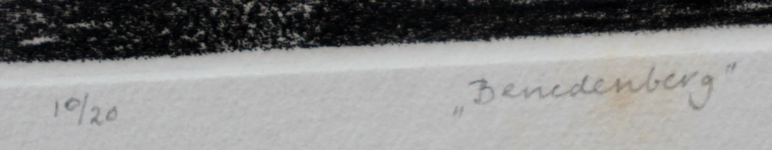Ets van Hans Blanken. Titel: "Benedenberg". Oplage: 10/20. Afmetingen blad: H38 x b28m. Afmetingen voorstelling: H16 x b8cm. Het werk is, rechts onderaan met potlood, gesigneerd door de kunstenaar. De authenticiteit van het, aangeboden werk, wordt volledig gegarandeerd. Een certificaat van echtheid kan, op aanvraag, worden gemaild
