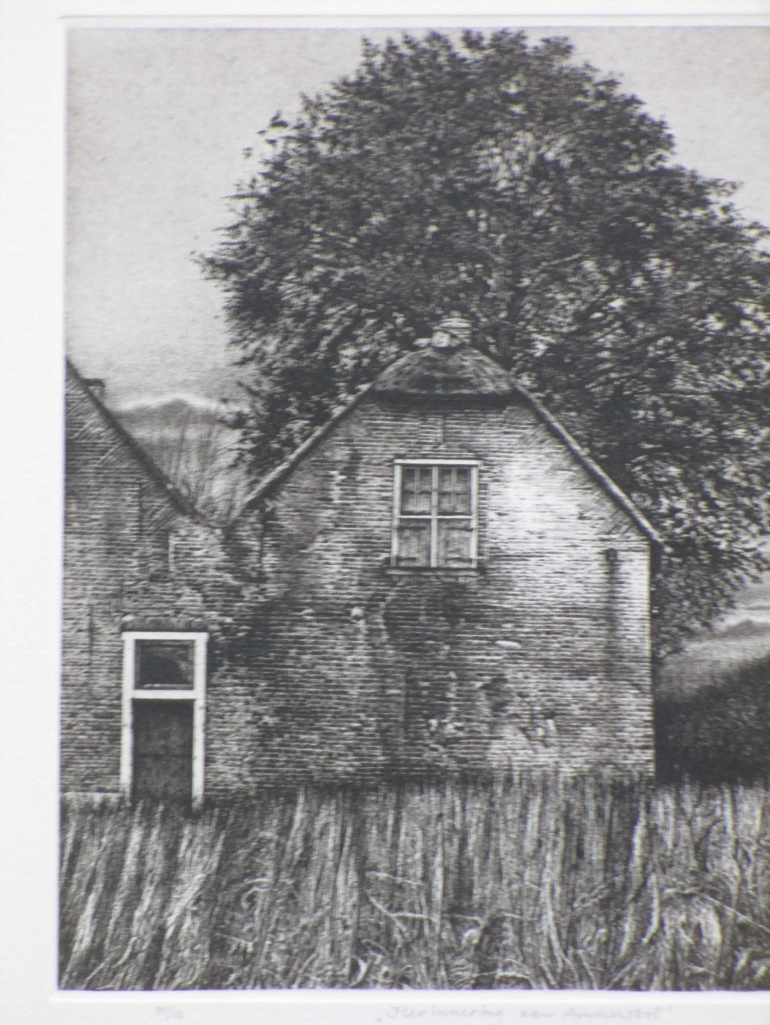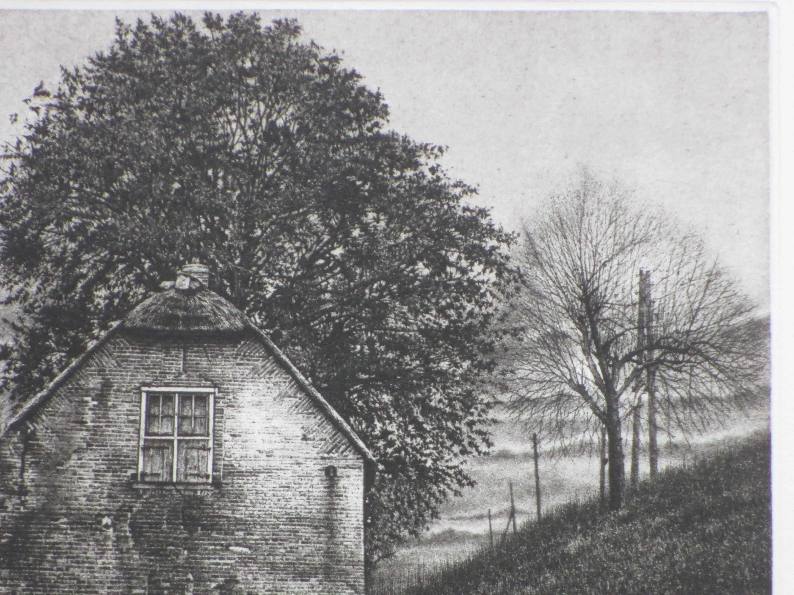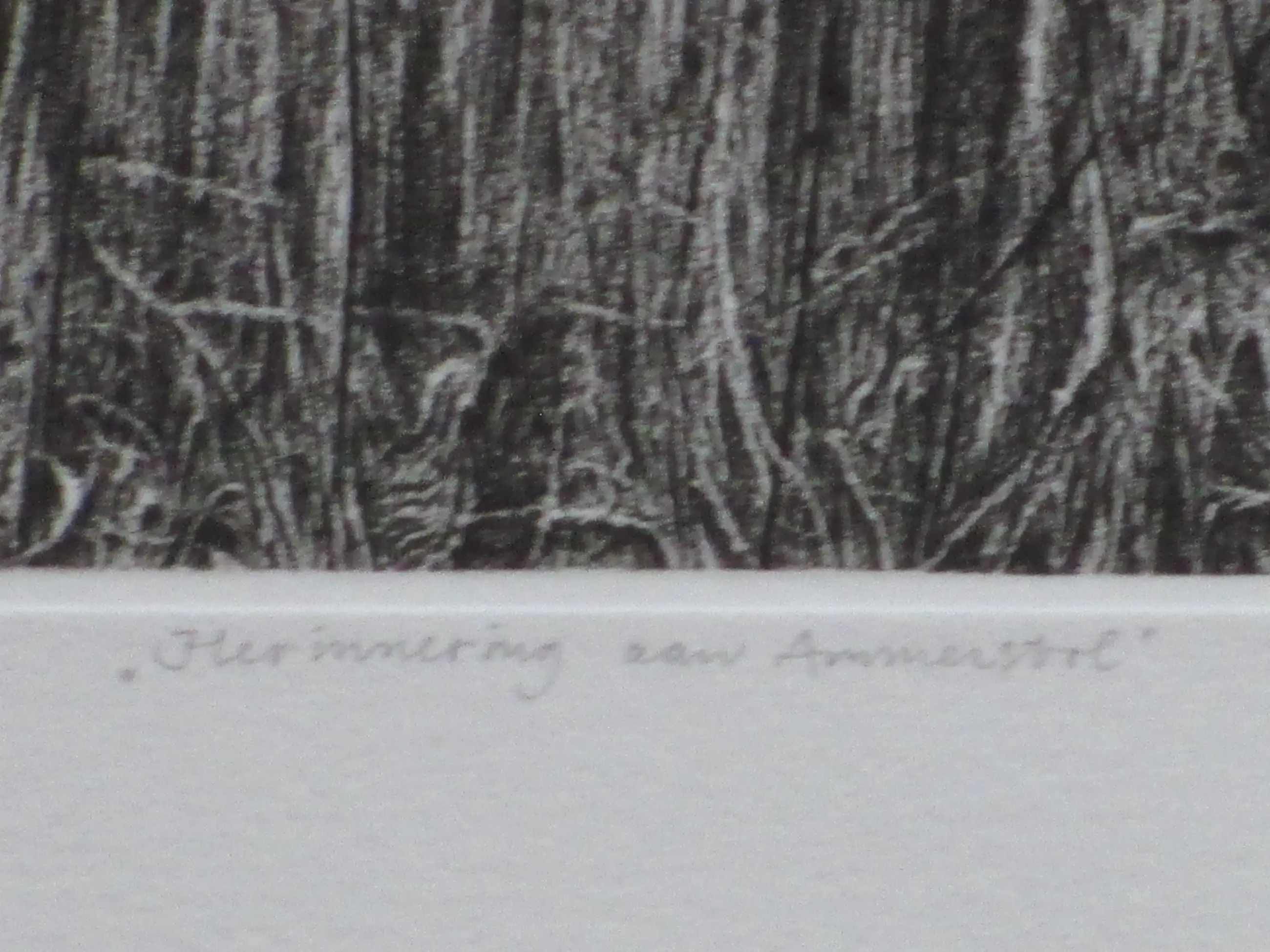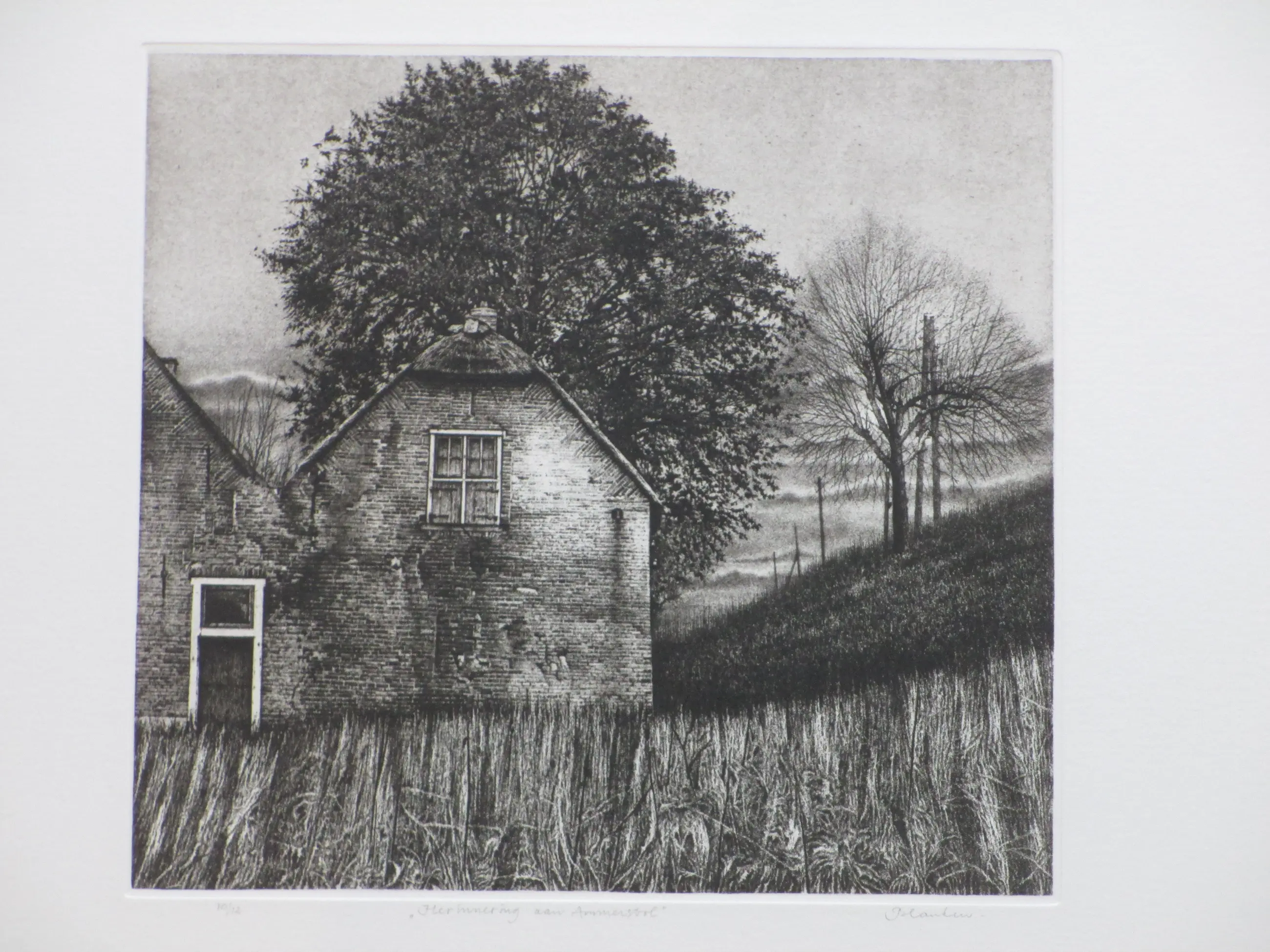 Ets door Hans Blanken Voorstelling van een boerderij in een landschap Losbladig, beeldmaat 17x19, bladmaat 32x38 Gesigneerd in potlood r.o.: 'Blanken' Getiteld in potlood m.o.: 'Herinnering aan Ammerstol' Genummerd in potlood l.o.: '10/12' Authenticiteit volledig gegarandeerd